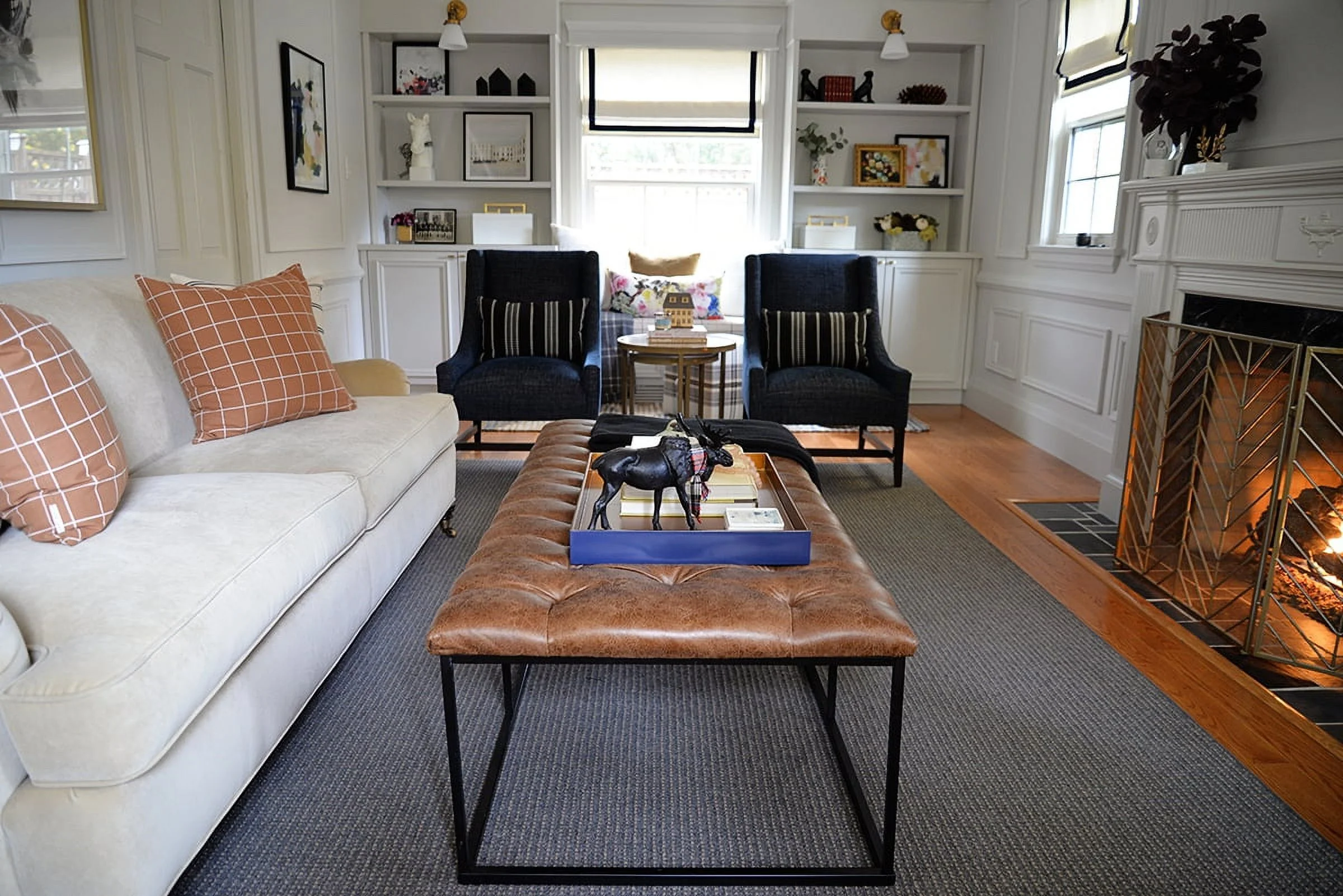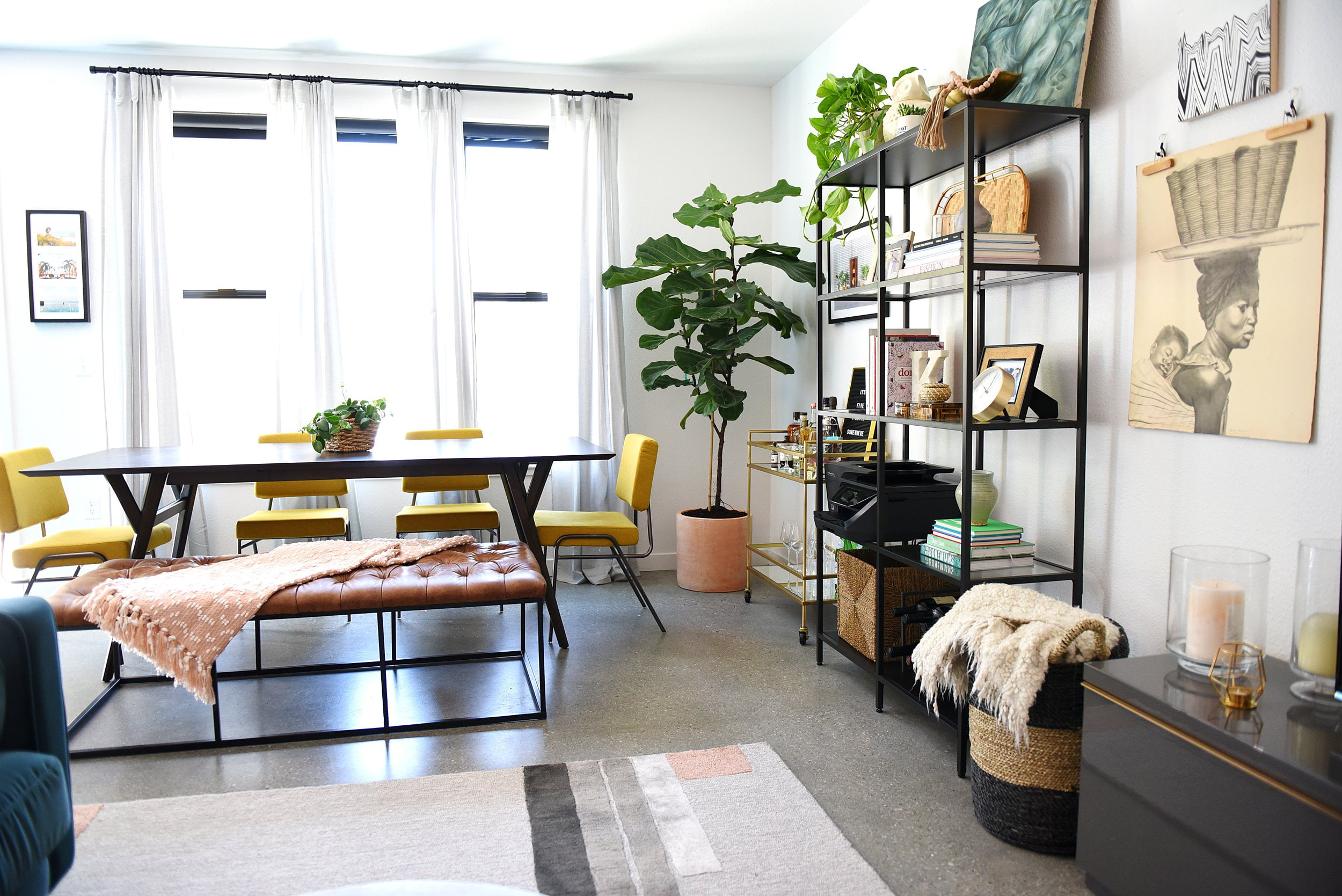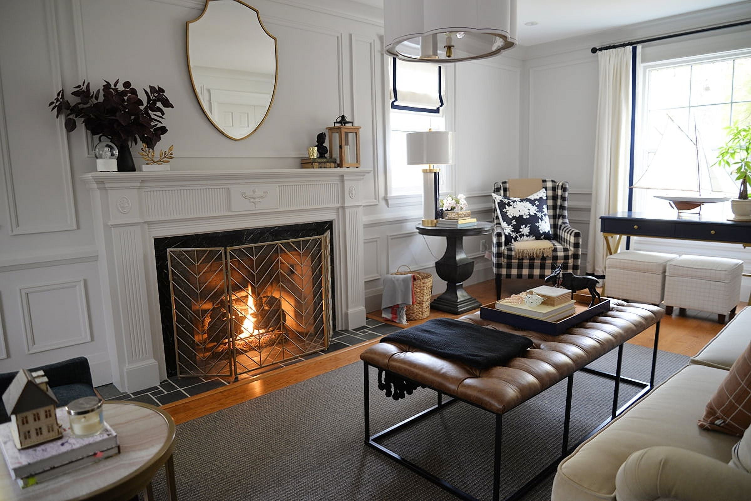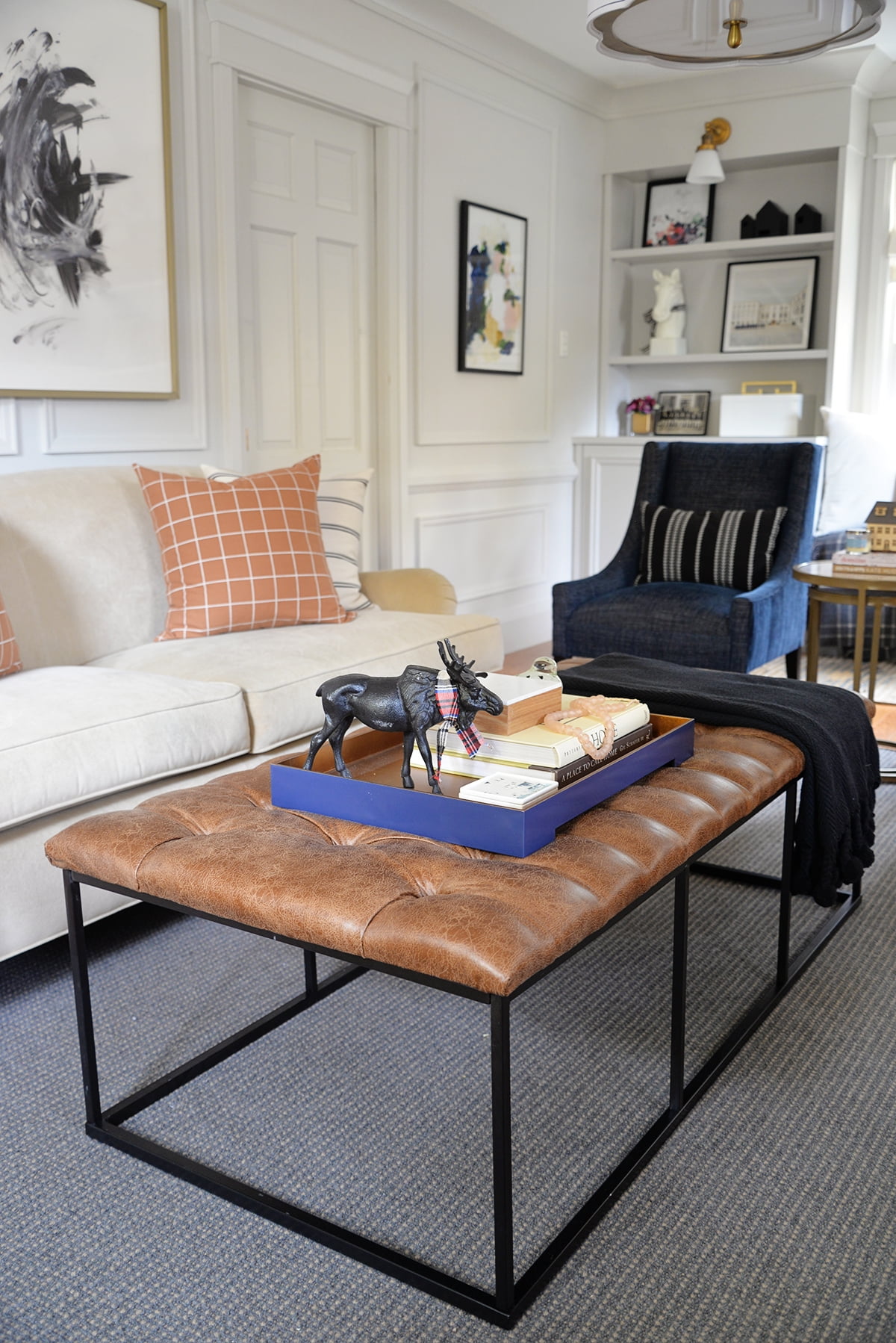The Draper Large Ottoman exudes masculine style and can perform multiple functions in any home. Use it as a coffee table ottoman in the living room, as an end of bed bench in the bedroom, or as extra seating in the dining room or family room. This 58″ ottoman features an open metal frame that offers substantial size without overwhelming the space. The light brown faux leather button tufted top adds texture that contrasts well with the sleek black metal styling of the base. Easy to maintain with spot cleaning as needed.