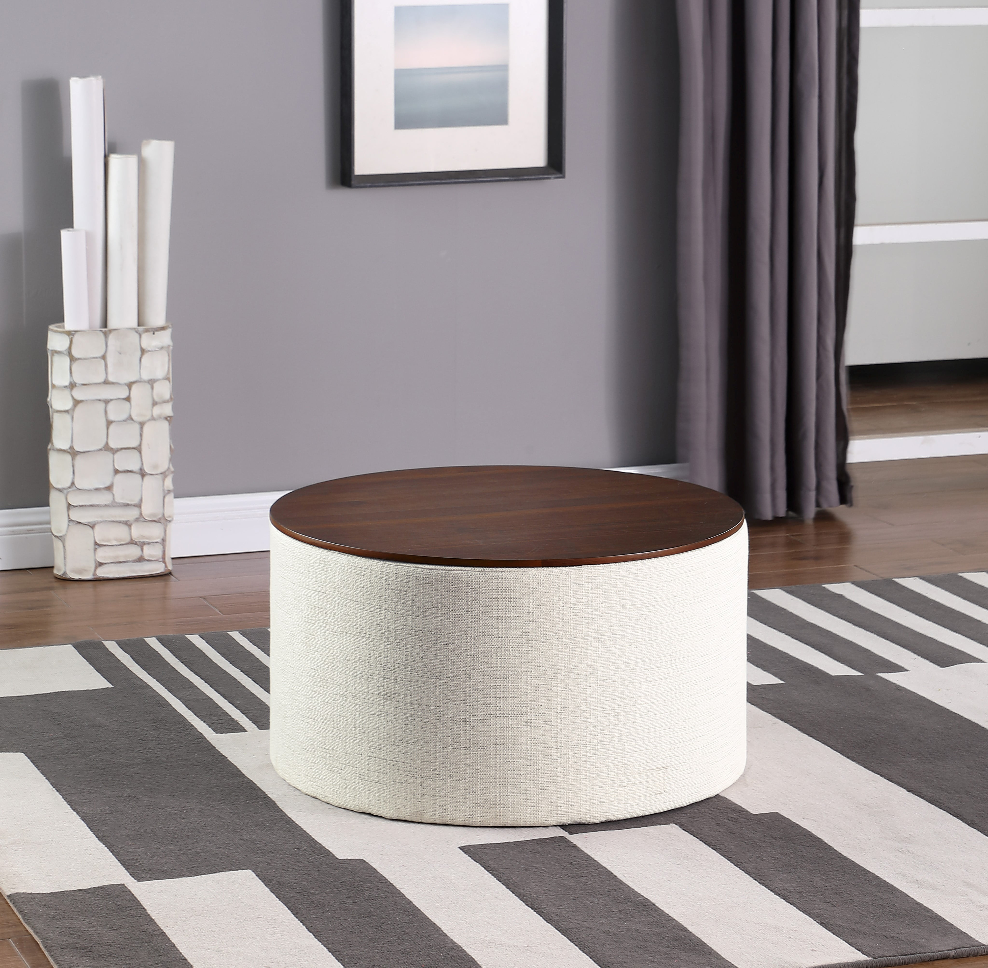 HomePop Large Modern Round Storage Ottoman with Wood Lift-Top Lid, Cream/Dark Walnut
