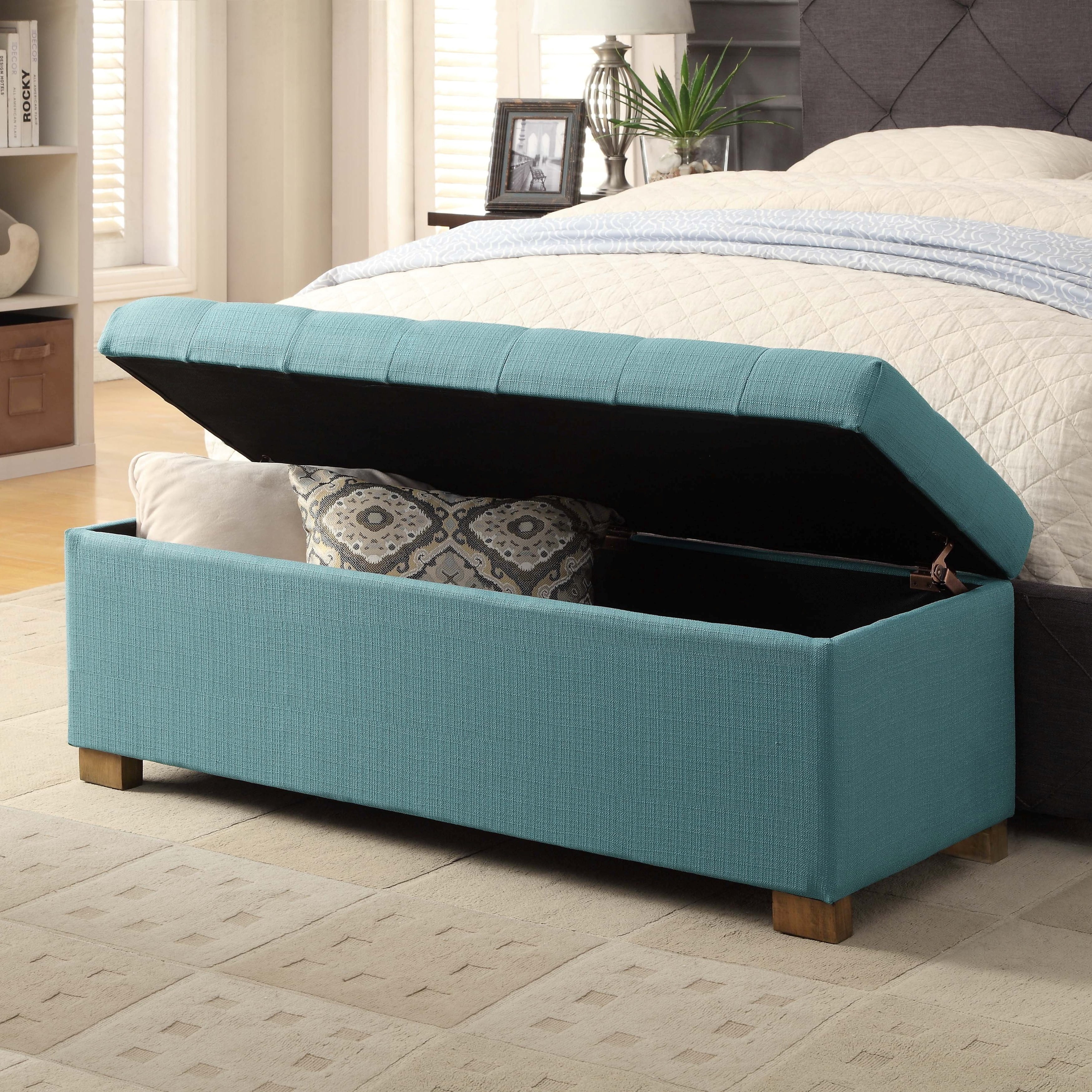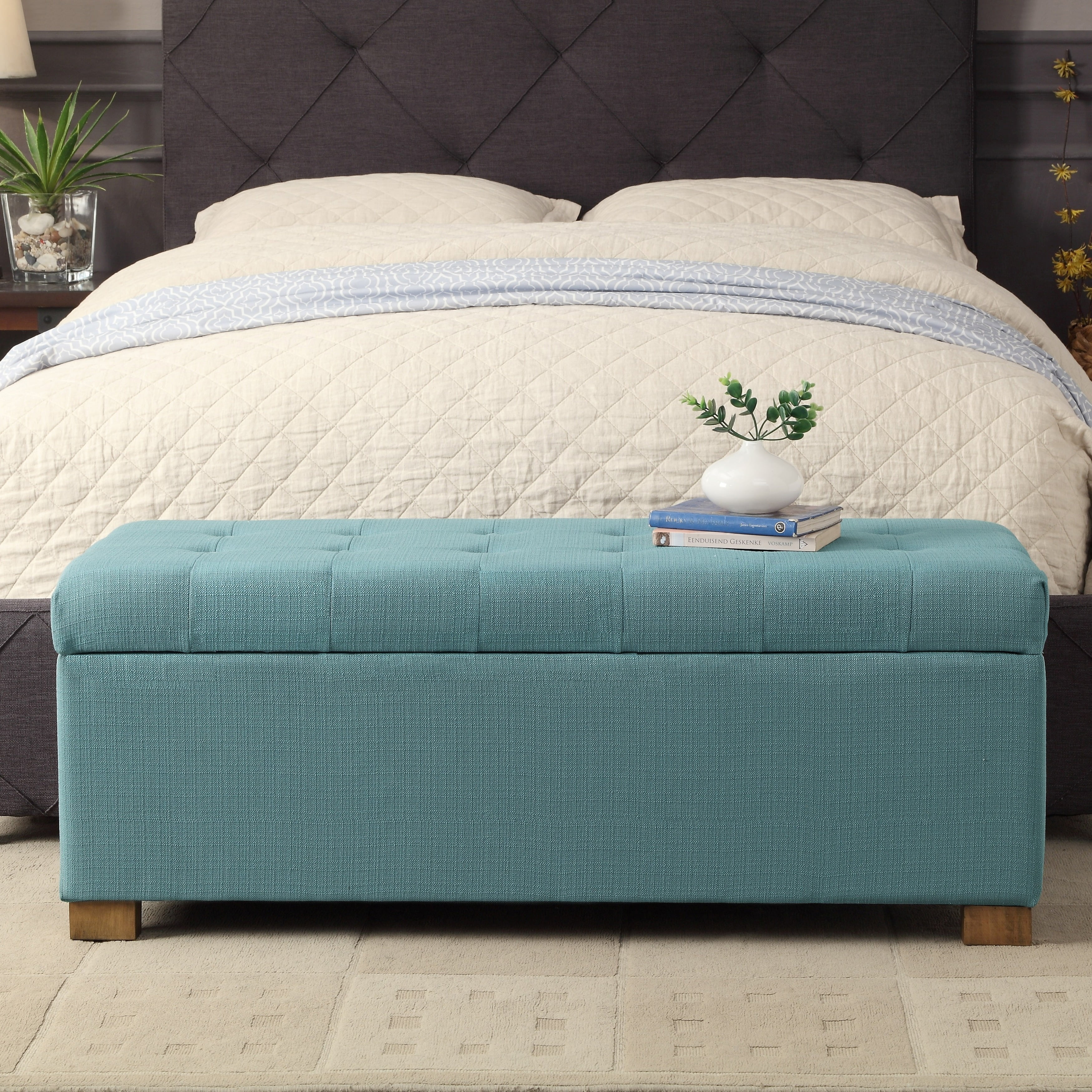 Add style and spacious storage to any room with the HomePop Large Tufted Storage Bench. Featuring a solid teal fabric with button tufting, this storage bench has wood legs in a driftwood finish. This multi-functional bench can provide seating and double as a coffee table, serve as an end of bed bench or as an entryway bench with storage. Premium details include a hinged lid and a generous storage capacity. Easy to assemble and maintain.