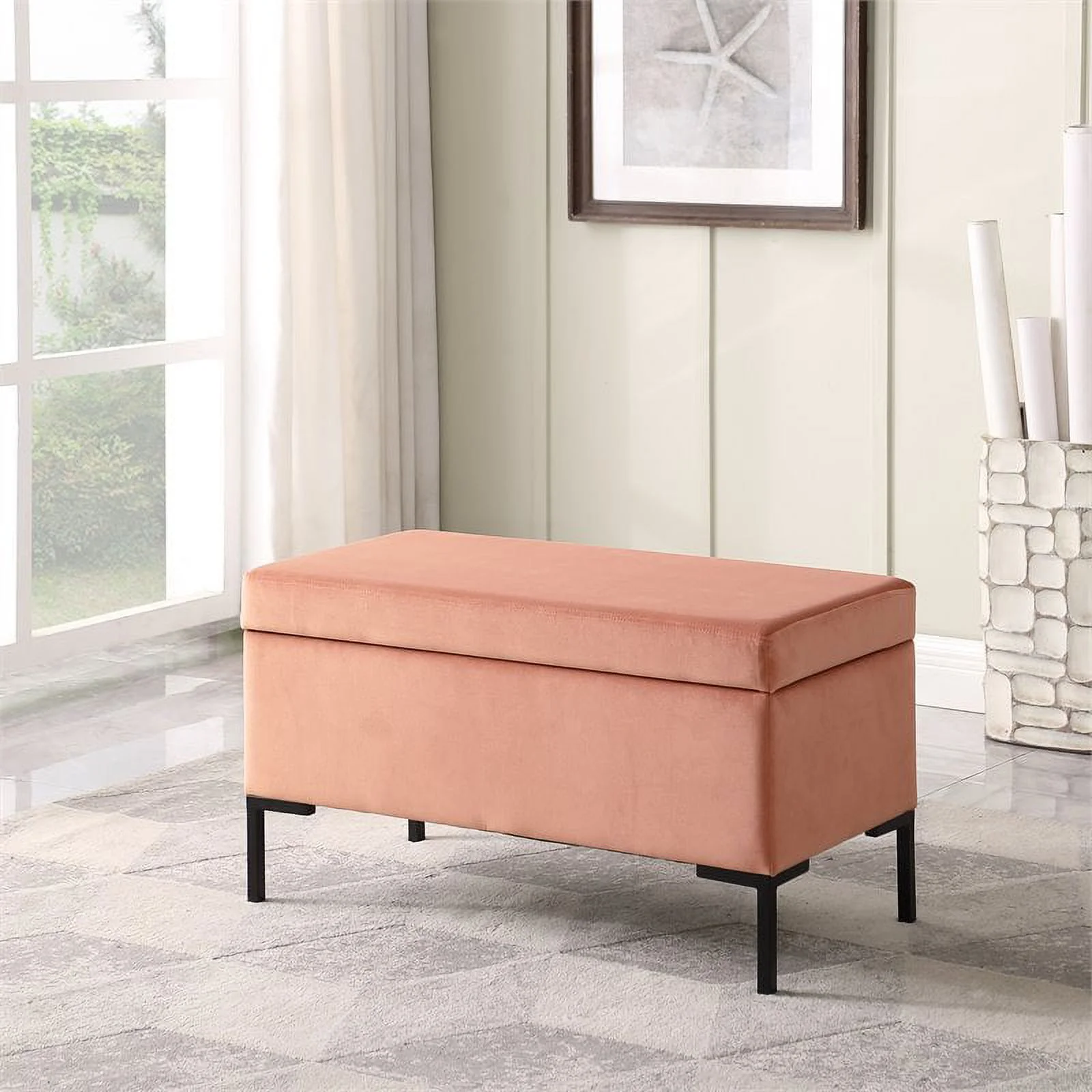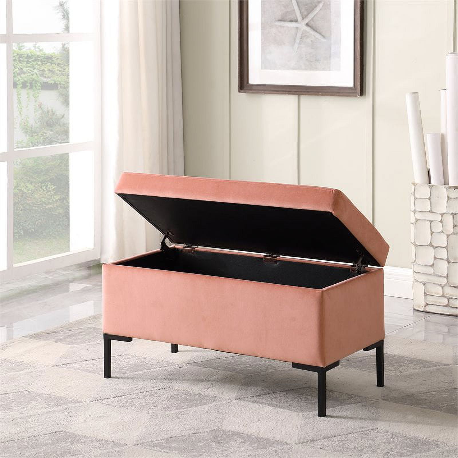 32 Inch Bench Width Functional Storage Space Under Seat Modern Style Design Blush Velvet Upholstery Matte Black Metal Legs Dimensions (Overall): 32″W X 16.5″D X 17.5″H Interior Dimensions: 29.9″W 14.9″D X 7.9″H Material: Wood And 100% Polyester Capacity: Supports Up To 250 Pounds Care And Cleaning: Spot Clean Only Weight: 29.9 Pounds