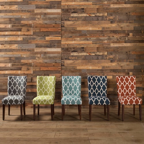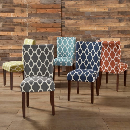 HomePop Parsons Dining Chairs (Set of 2), Quatrefoil: Dimensions: 19″W x 23.5″D x 38″ H Wood Finish: Dark Walnut 19″ Chair Seat Height Easy care Fabric Premium woven fabric with 78% polyester & 22% rayon construction Set of 2 Chairs Spot clean fabric Easy assembly