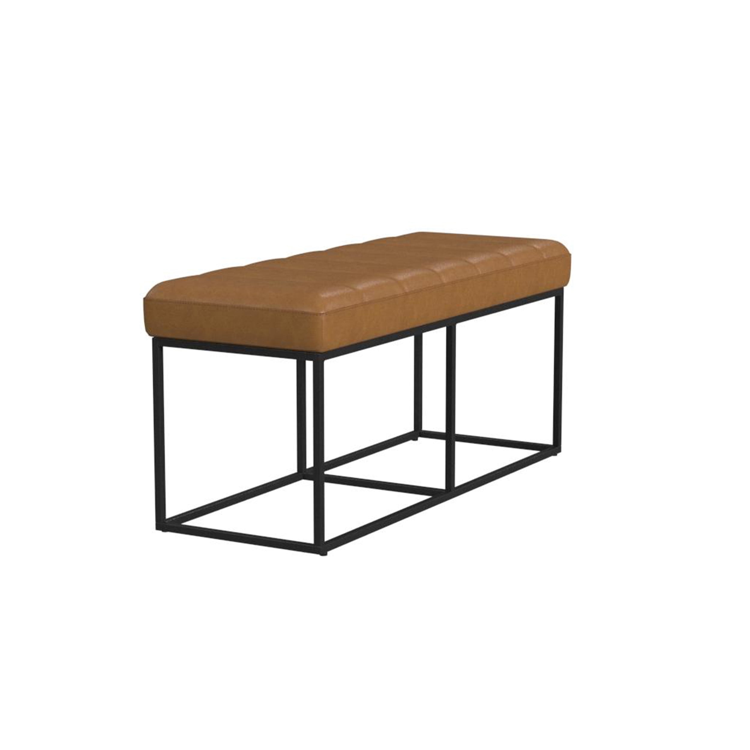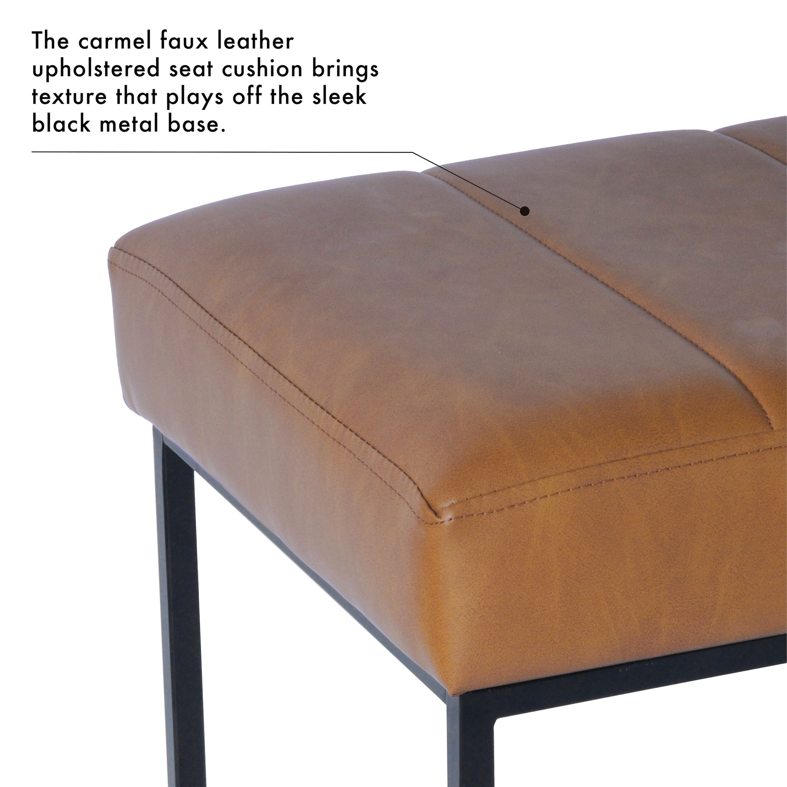 Modern Industrial Style 19” Inch Bench Seat Height Black Metal Frame Carmel faux leather upholstered top Dimensions: 42.5″Wx16″Dx19″H Material: Metal and Polyester Capacity: Supports up to 350 pounds Care and Cleaning: Spot Clean Only Weight: 24 pounds