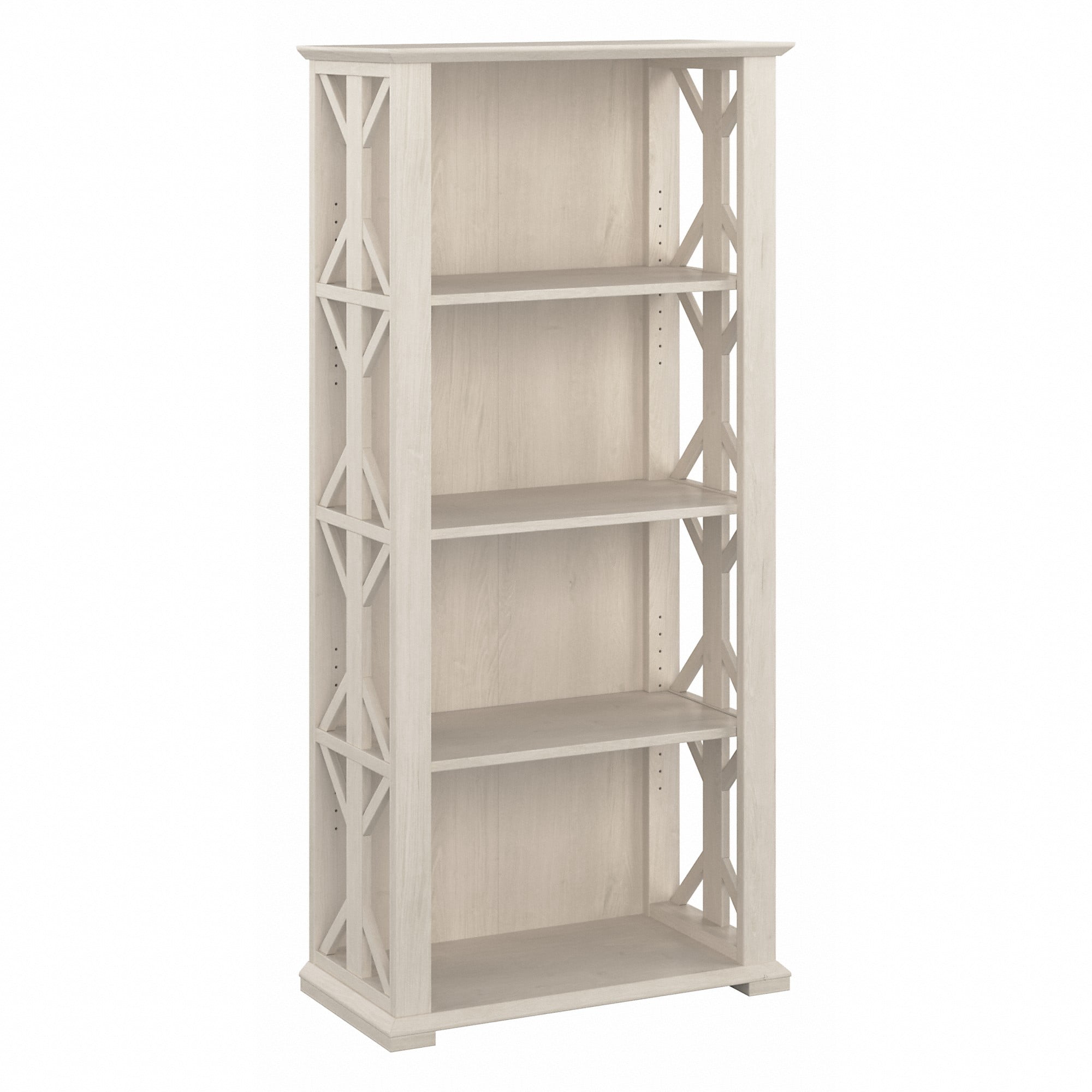 Organize books or give your workspace a personal touch with the Bush Furniture Homestead 4 Shelf Farmhouse Bookcase. Safely display pictures and decorations on shelves that support up to 50 pounds each. Two shelves are fixed for stability while two can be raised or lowered to accommodate items of various sizes. Tip Guard(TM) safety features include a stable design and wall attachment hardware for family-friendly safety in any space. The bookcase has been tested with a 50 pound hanging weight to create a safe environment in any work or living space. Decorative trestle pattern and chamfered profile edges give this bookcase a casual farmhouse style. This bookcase has been meticulously tested to meet or exceed ANSI/SOHO quality standards for safety, durability and performance and is backed by the Bush Furniture 1 Year Warranty. See the full collection for coordinating items. Features: 31W x 16D x 66H Bookshelf offers two fixed shelves for stability and two adjustable shelves for flexible storage opportunities Bookcase features two adjustable shelves for flexible organization and two fixed shelves for stability Tip Guard(TM) safety features include a stable design and wall attachment hardware Durable Bookcase is tested to withstand 50 pound hanging weight without tipping; each shelf supports up to 50 pounds Decorative trestle patterns and chamfered profile edges give this bookcase a casual farmhouse style Open shelving is perfect for displaying your favorite books, pictures and decorations Finishes with a beautiful natural grain pattern create a relaxed feel in your home or office Bush Furniture’s commitment to safety includes rigorous testing that meets or exceeds ANSI/SOHO standards Backed by the Bush Furniture 1 Year Manufacturer’s Warranty See the complete Homestead Collection for coordinating items available Specifications: Product Dimensions: 4 Shelf Bookcase: 31.30″W x 15.47″D x 66.30″H Product Color: Linen White Oak Assembly Required: Yes