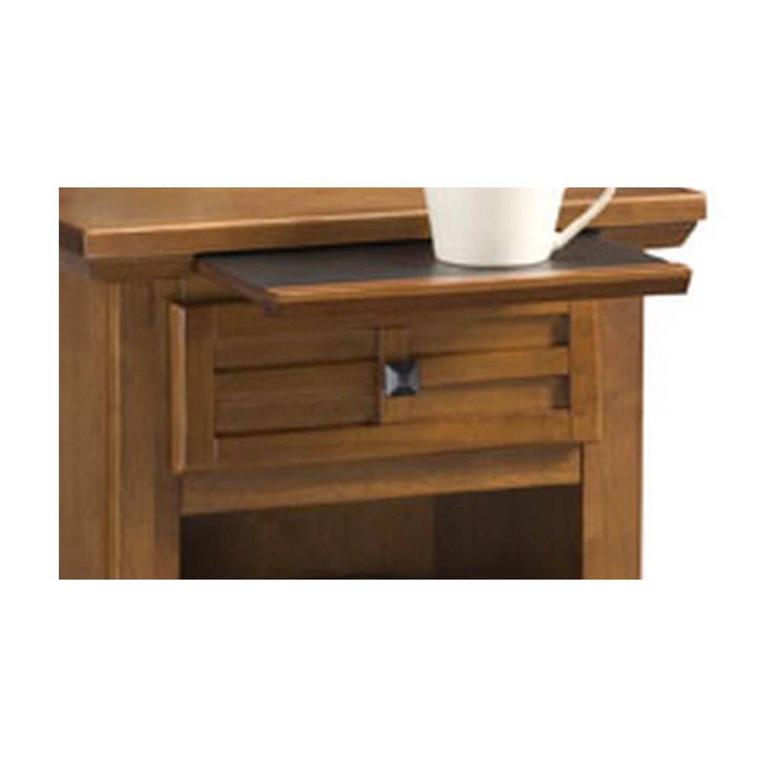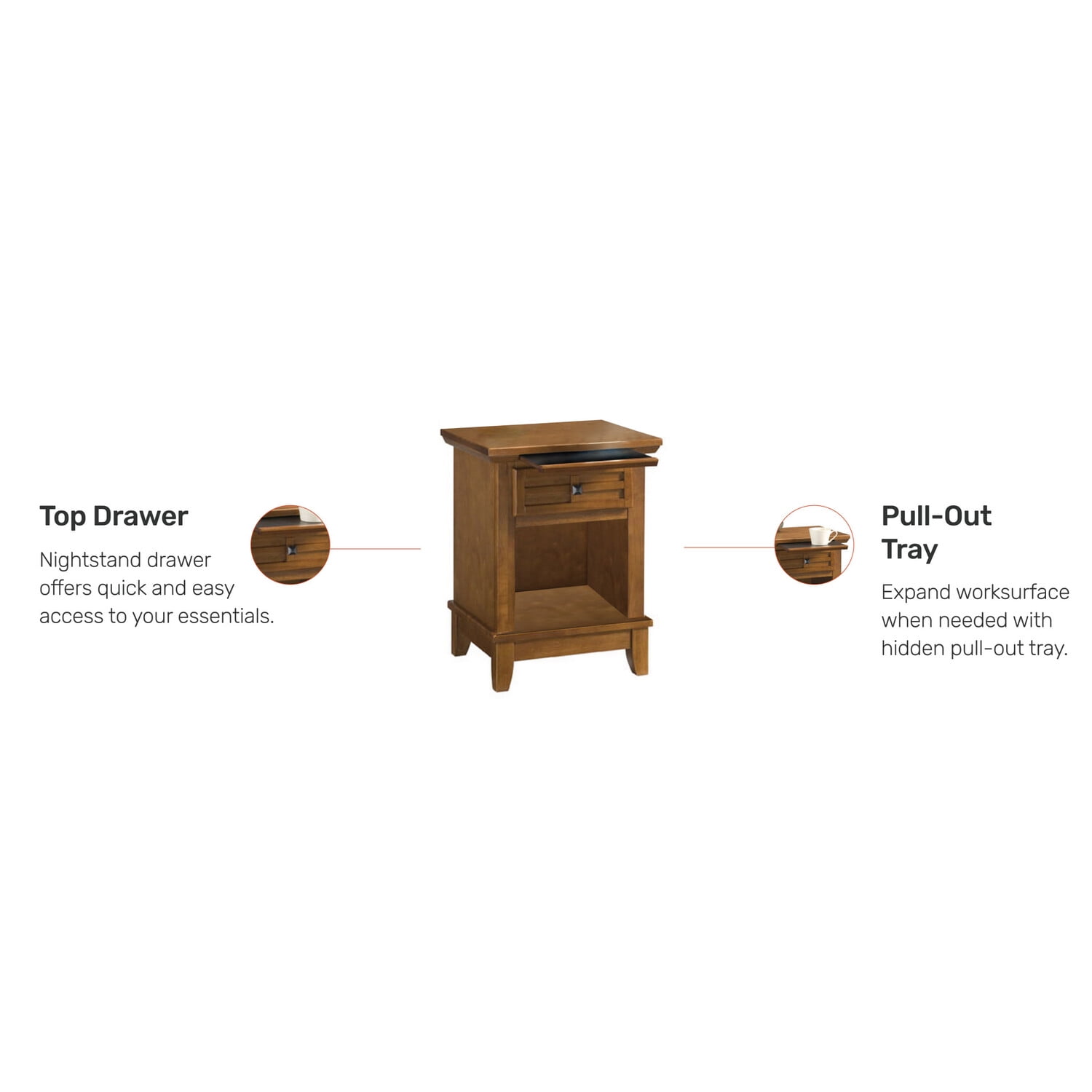 Bring equal amounts of warmth and convenience to any bedroom with this Arts and Crafts Nightstand by Homestyles. The variety of storage options include open and closed storage as well as an expandable top that brings more to the bedside. The durable hardwood and engineered wood creates worry-free maintenance for years to come. Features: Oak is strong, hard, heavy and dense, making it highly resistant to wear and tear. Veneer provides the beauty and feel of natural woodgrain. Cottage oak finish for a warm and traditional feel. Drawer offers quick and easy access to your essentials. Hidden pull-out tray provides additional surface area for storing a phone or other items. Black finish on hardware for a chic look that never goes out of style. Some assembly required using our easy-to-understand directions. Specifications: Assembly Required: Yes Hardware: Hardware Included Weight Capacity: 60 Warranty: Yes Number of Drawers: 1 Number of Shelves: 1