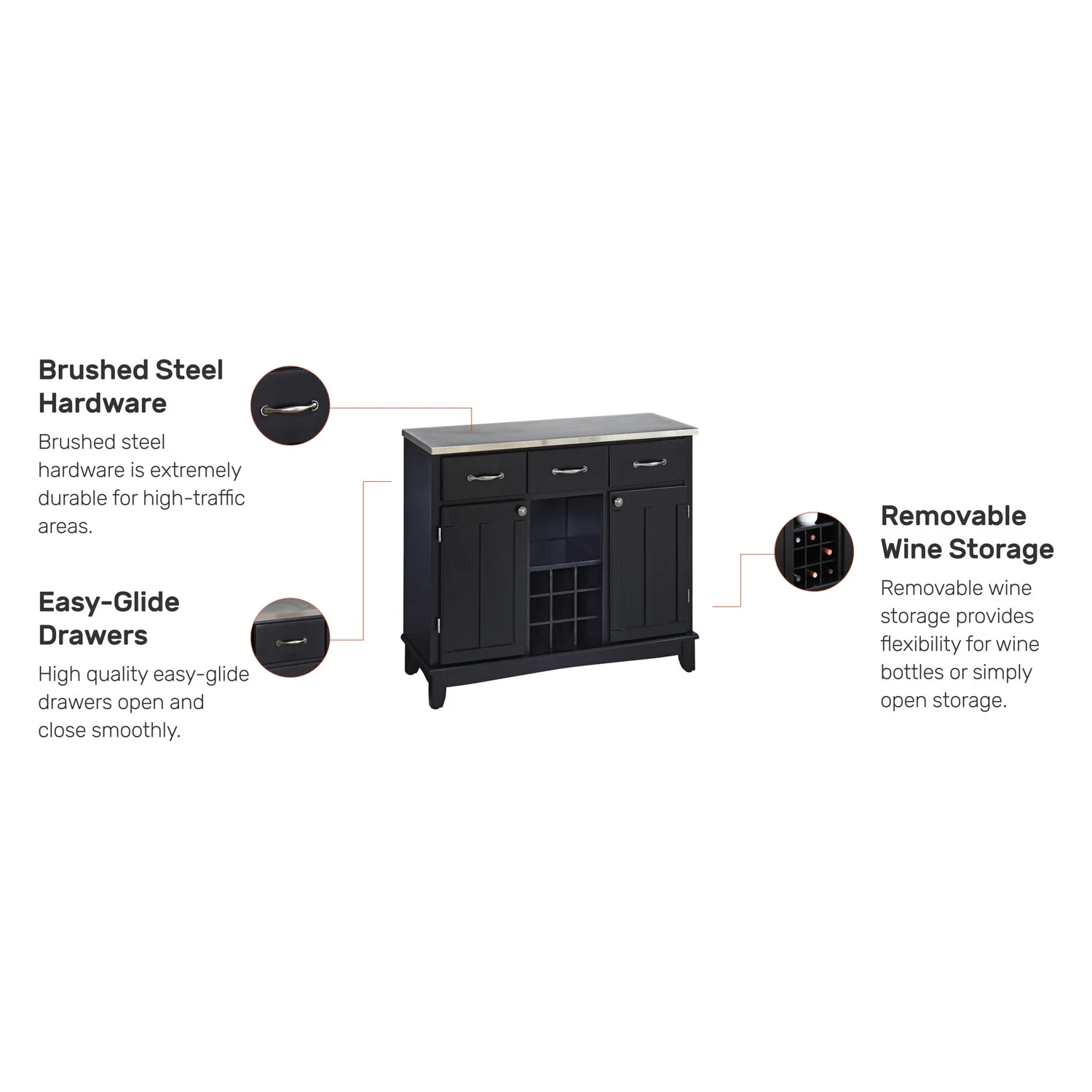 Timeless stainless steel top is incredibly strong, lightweight, rustproof, easy to clean and safe for food. Hardwood is incredibly strong, easy to clean and maintains its beauty for ages. Black finish with clear coat for a chic look that never goes out of style. Removable wine storage provides flexibility for wine bottles or simply open storage. Brushed steel hardware is extremely durable for high-traffic areas. Some assembly required using our easy-to-understand directions. Furniture conveniently delivers straight to your home.