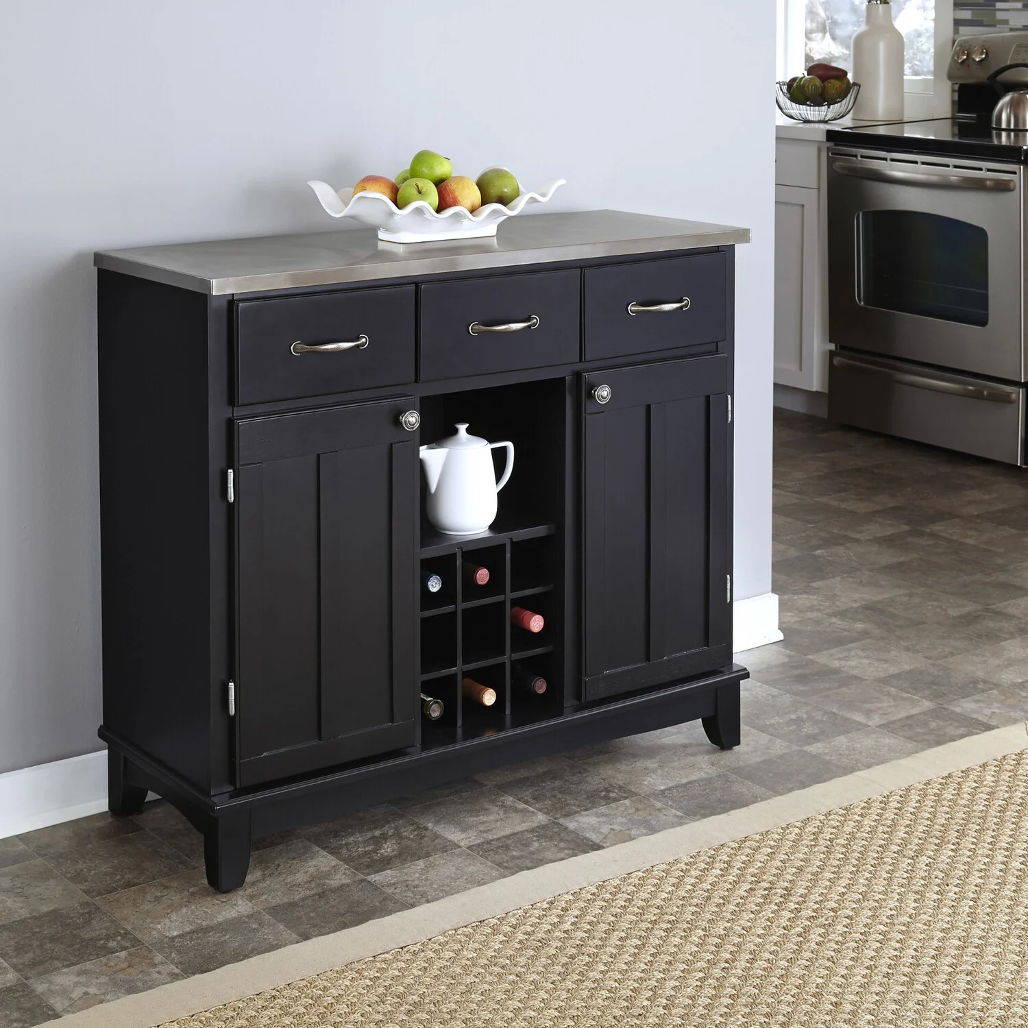 Store it all, display it all, and have it all with the Homestyles Buffet of Buffets Server. Whether used in the kitchen, dining room, or anywhere else, it brings organization to your life and style to your home. The variety of storage options from cabinet shelves to drawers to a wine rack gives you the flexibility to figure out what’s just right for you. Pack more storage into a smaller footprint with this black server that easily coordinates with a variety of environments. Features: Timeless stainless steel top is incredibly strong, lightweight, rustproof, easy to clean and safe for food. Hardwood is incredibly strong, easy to clean and maintains its beauty for ages. Black finish with clear coat for a chic look that never goes out of style. Removable wine storage provides flexibility for wine bottles or simply open storage. Brushed steel hardware is extremely durable for high-traffic areas. Some assembly required using our easy-to-understand directions. Furniture conveniently delivers straight to your home. Specifications: Assembly Required: Yes Hardware: Hardware included Frame Material: Wood Number of Shelves: 3 Number of Drawers: 3