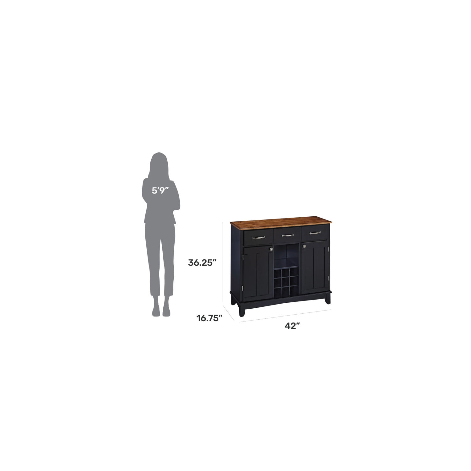 Store it all, display it all, and have it all with the Homestyles Buffet of Buffets Server. Whether used in the kitchen, dining room, or anywhere else, it brings organization to your life and style to your home. The variety of storage options including drawers, cabinets and a wine rack gives you the flexibility to figure out what’s just right for you. Pack more storage into a smaller footprint with this black server that easily coordinates with a variety of environments. Features: Hardwood is incredibly strong, easy to clean and maintains its beauty for ages. Adjustable shelves behind doors accommodate a variety of kitchen items. Black body finish for a chic look that never goes out of style and a cottage oak finish on the top for contrasting warmth. Removable wine storage provides flexibility for wine bottles or simply open storage. Brushed steel hardware is extremely durable for high-traffic areas. Some assembly required using our easy-to-understand directions. Furniture conveniently delivers straight to your home. Specifications: Assembly Required: Yes Hardware: Hardware included Frame Material: Wood Number of Shelves: 3 Number of Drawers: 3