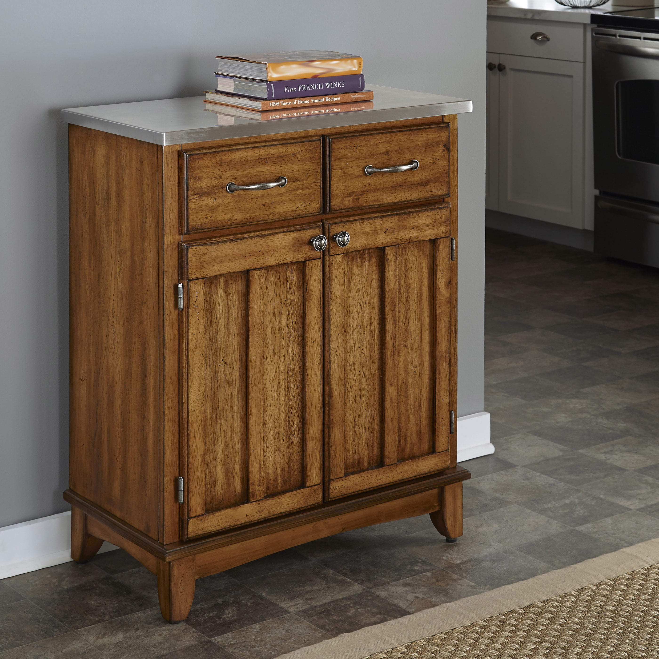 Constructed of hardwood and wood products in a cottage oak finish 18-gauge stainless steel top Two utility drawers Two wood-framed cabinet doors with an adjustable shelf inside Brushed steel hardware Distressed finish