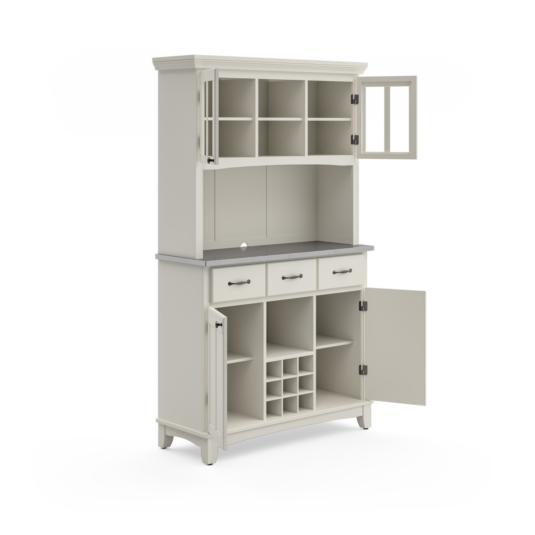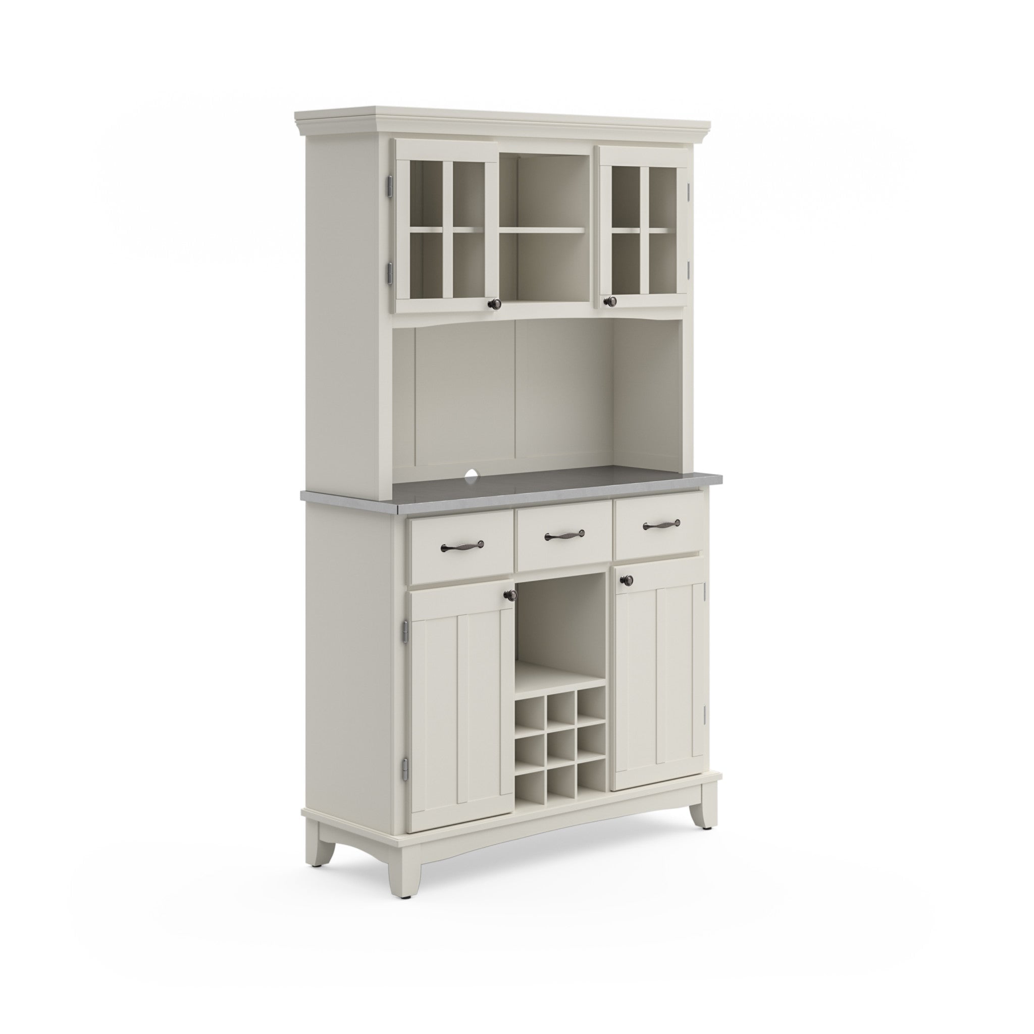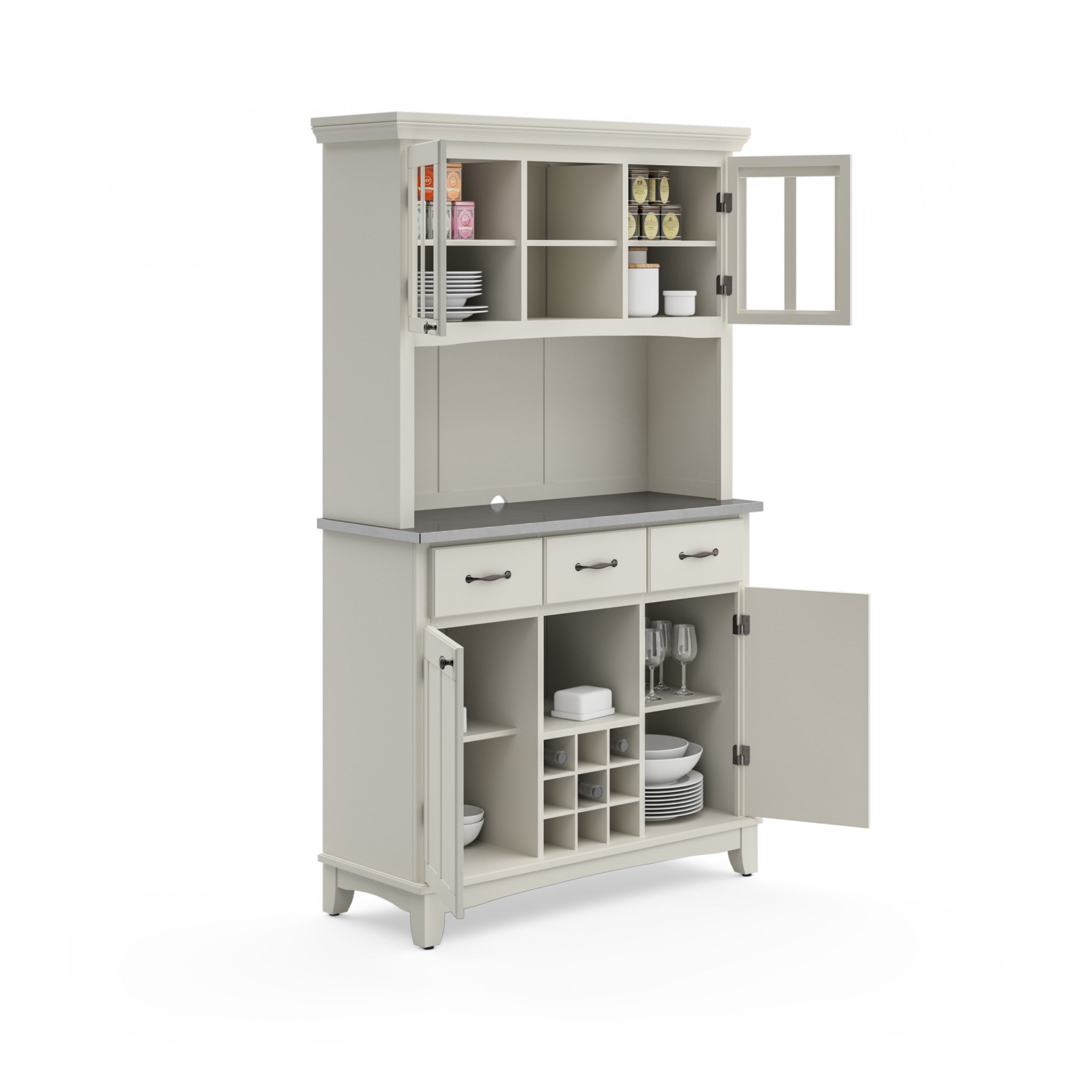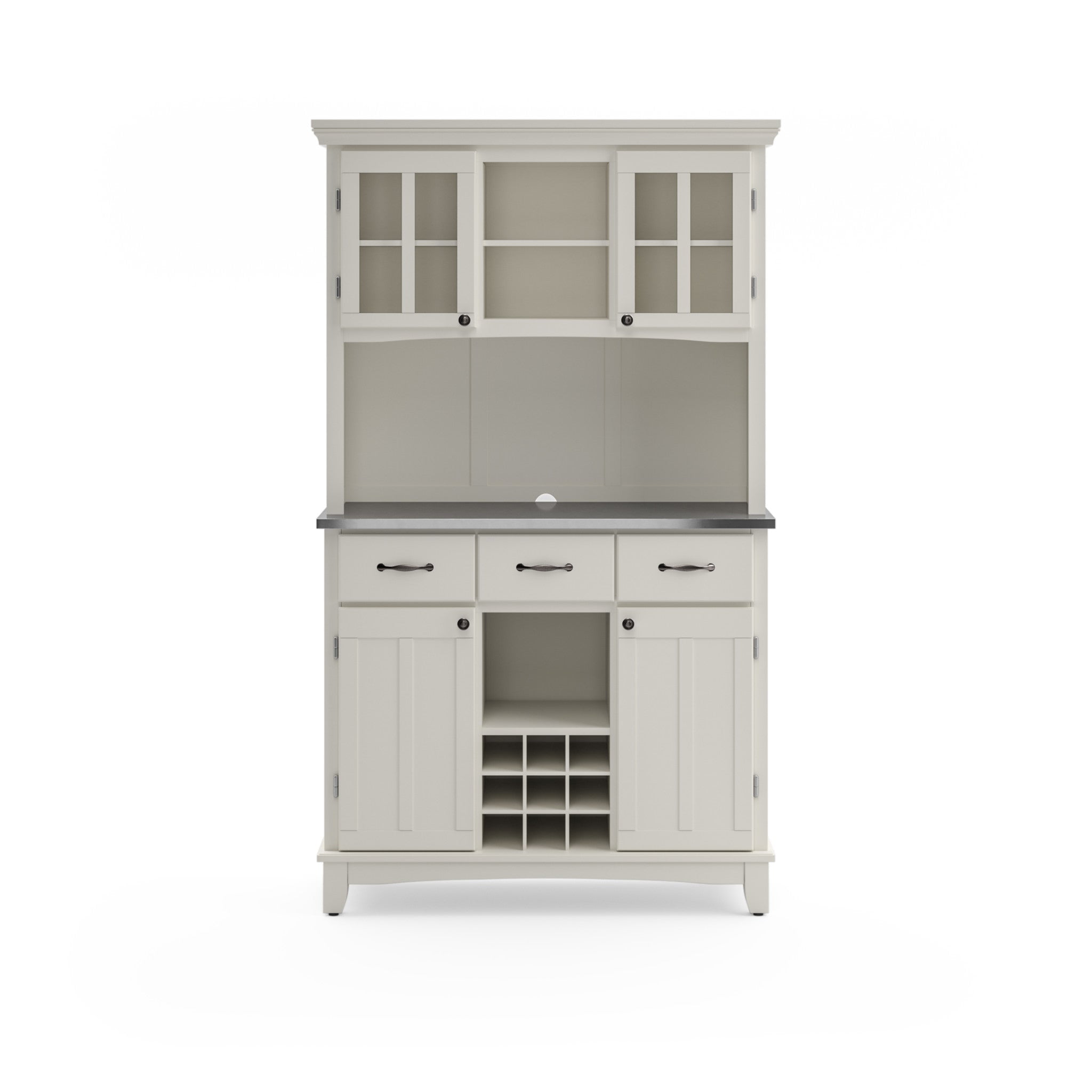 Store it all, display it all, and have it all with the Homestyles Buffet of Buffets Server with Hutch. Whether used in the kitchen, dining room, or anywhere else, it brings organization to your life and style to your home. The variety of storage options from cabinet shelves to drawers to wine racks gives you the flexibility to figure out what’s just right for you. Glass cabinet doors on the top put your most special items on display, while the stainless steel top always has a sleek look. Pack more storage into a smaller footprint with this off white server that easily coordinates with a variety of environments. Features: Hardwood is incredibly strong, easy to clean and maintains its beauty for ages. Three drawers, upper cabinets and two cabinets with adjustable shelves accommodate a variety of sizes and shapes. Timeless 18-gauge stainless steel top is incredibly strong, lightweight, rustproof and easy to clean. Removable wine storage provides flexibility for wine bottles or simply open storage. Hutch features two wood-framed glass doors with an adjustable shelf inside Brushed steel hardware is extremely durable for high-traffic areas. Some assembly required using our easy-to-understand directions. Specifications: Assembly Required: Yes Hardware: Hardware Included Weight Capacity: 300 Warranty: Yes Number of Doors: 4 Number of Drawers: 3 Number of Shelves: 6