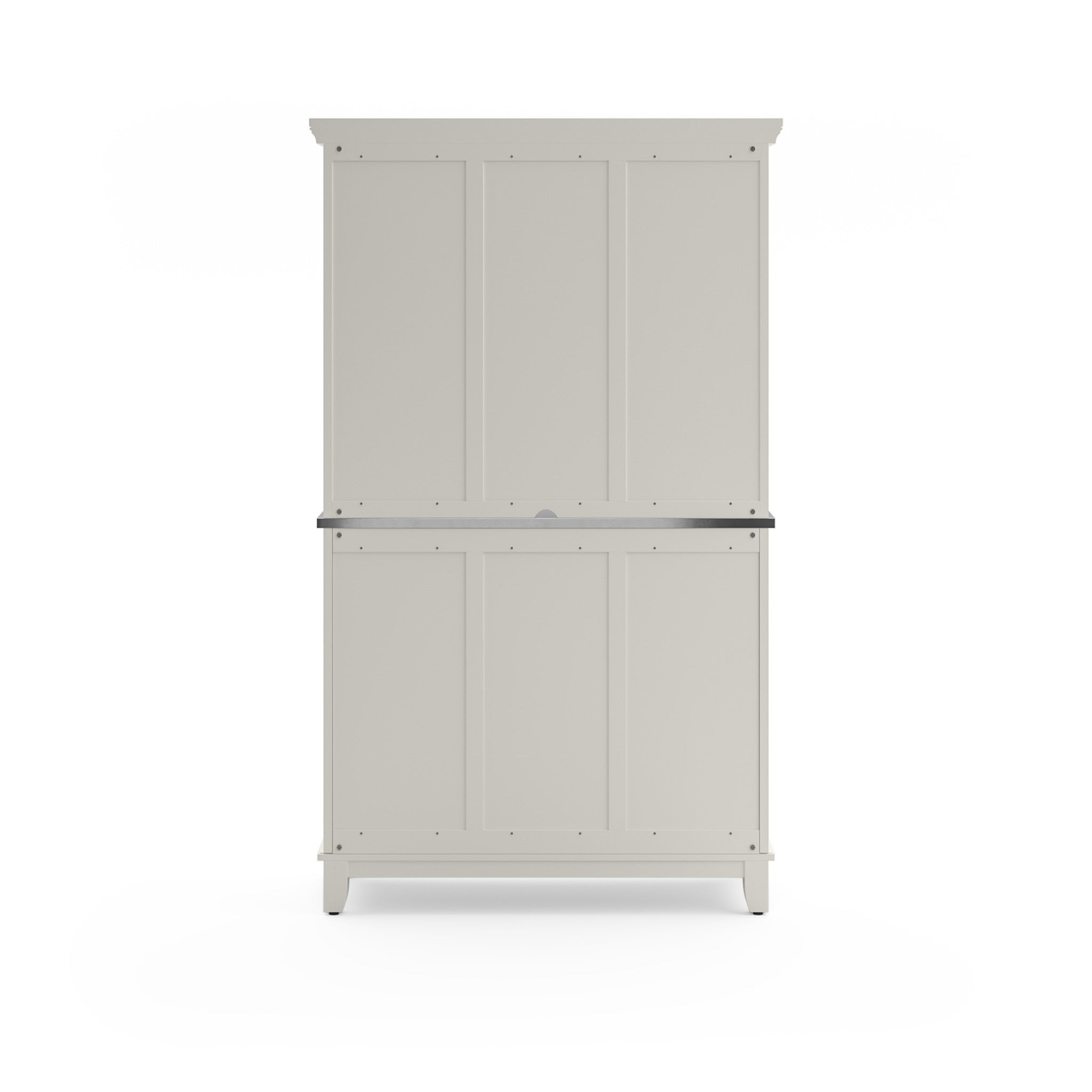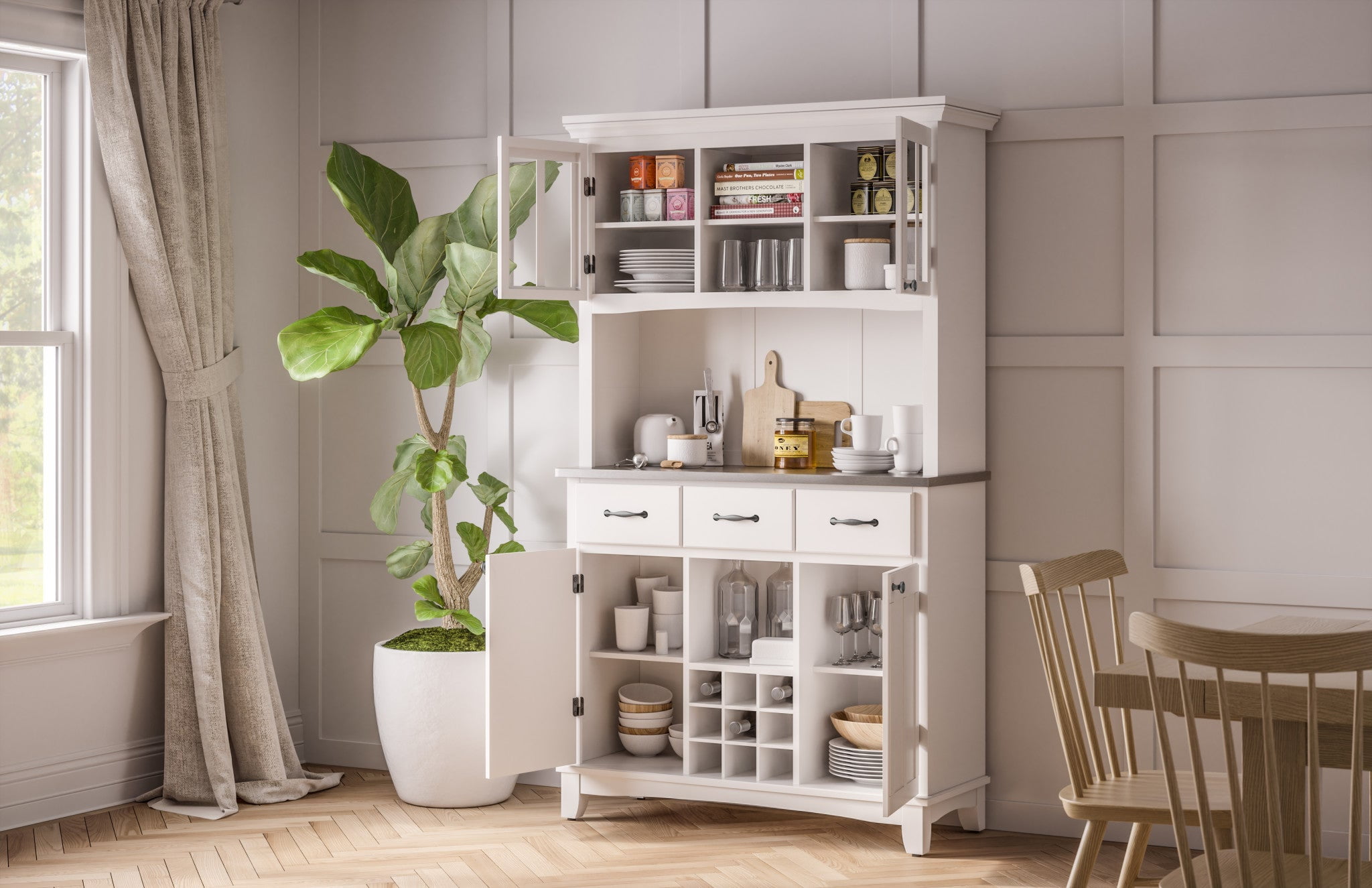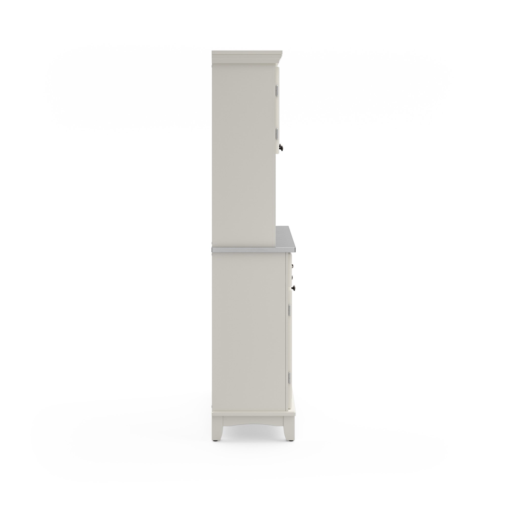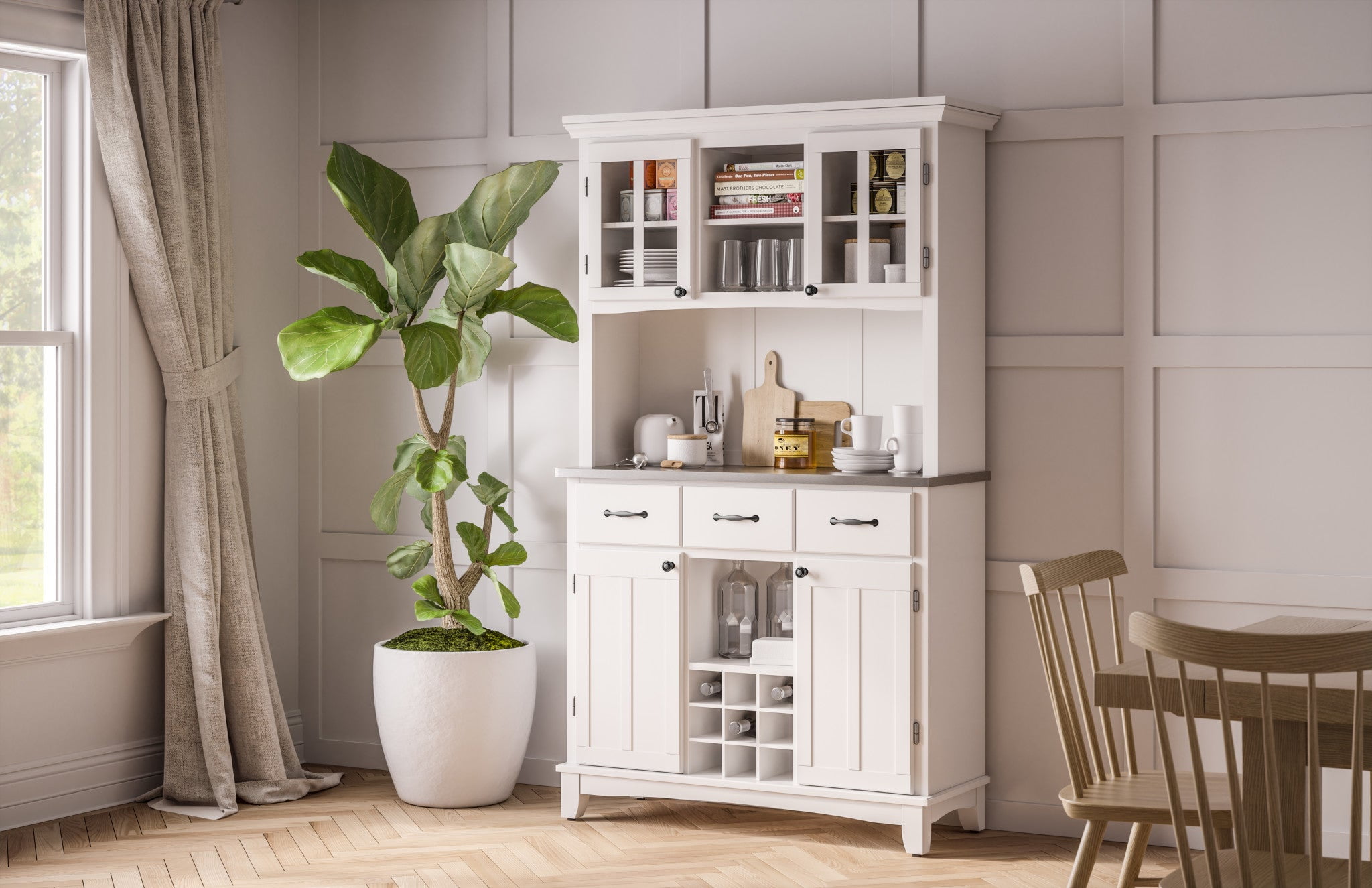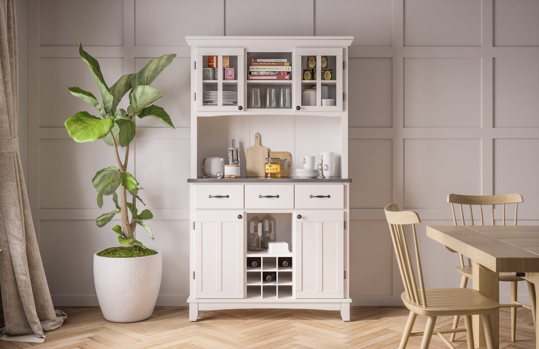 Store it all, display it all, and have it all with the Homestyles Buffet of Buffets Server with Hutch. Whether used in the kitchen, dining room, or anywhere else, it brings organization to your life and style to your home. The variety of storage options from cabinet shelves to drawers to wine racks gives you the flexibility to figure out what’s just right for you. Glass cabinet doors on the top put your most special items on display, while the stainless steel top always has a sleek look. Pack more storage into a smaller footprint with this off white server that easily coordinates with a variety of environments. Features: Hardwood is incredibly strong, easy to clean and maintains its beauty for ages. Three drawers, upper cabinets and two cabinets with adjustable shelves accommodate a variety of sizes and shapes. Timeless 18-gauge stainless steel top is incredibly strong, lightweight, rustproof and easy to clean. Removable wine storage provides flexibility for wine bottles or simply open storage. Hutch features two wood-framed glass doors with an adjustable shelf inside Brushed steel hardware is extremely durable for high-traffic areas. Some assembly required using our easy-to-understand directions. Specifications: Assembly Required: Yes Hardware: Hardware Included Weight Capacity: 300 Warranty: Yes Number of Doors: 4 Number of Drawers: 3 Number of Shelves: 6