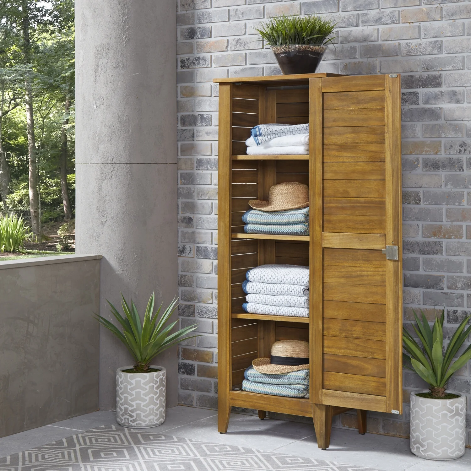 Maintain a clean area around the deck or the pool with this Homestyles Maho Outdoor Storage Cabinet. The design adds a little island flair to your outdoor spaces, and the spacious area behind the cabinet door adds plenty of storage capability. The entire cabinet is constructed of durable, water-resistant acacia wood for years of reliable performance. Features: Acacia wood is highly durable, water-resistant and easy to maintain for long-term enjoyment. Finished in a golden teak stain and sealed with linseed oil to bring out the wood’s natural beauty. Locking mechanism on door to keep items safe and secure. Three adjustable and removable shelves to accommodate a variety of items. It’s a great choice for both indoor and outdoor use. Some assembly required using our easy-to-understand directions. Furniture conveniently delivers straight to your home. Specifications: Assembly Required: Yes Hardware: Hardware included Frame Material: Wood Number of Shelves: 4