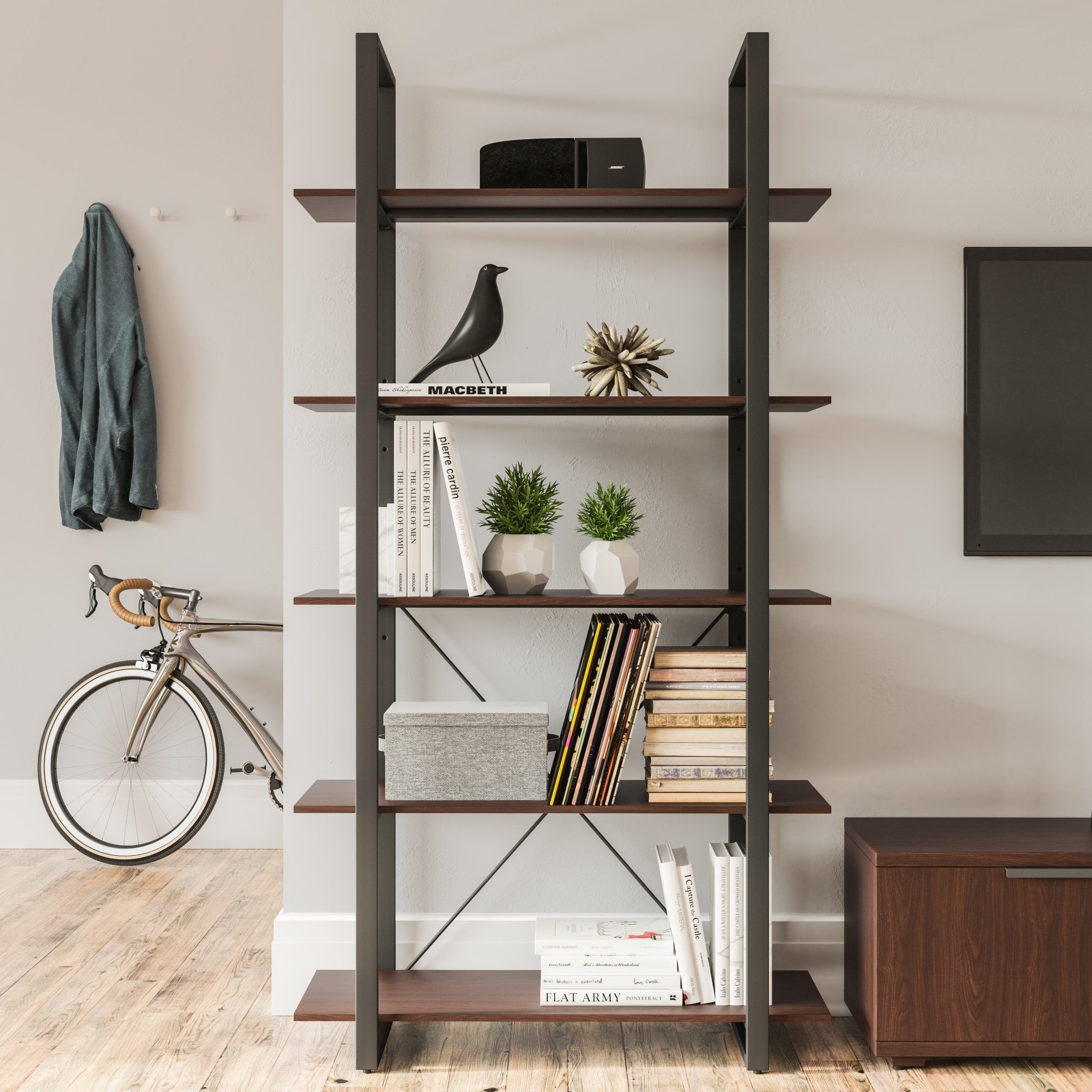 Homestyles Merge Engineered Wood 5-Shelves Bookcase in Walnut Brown Stain
