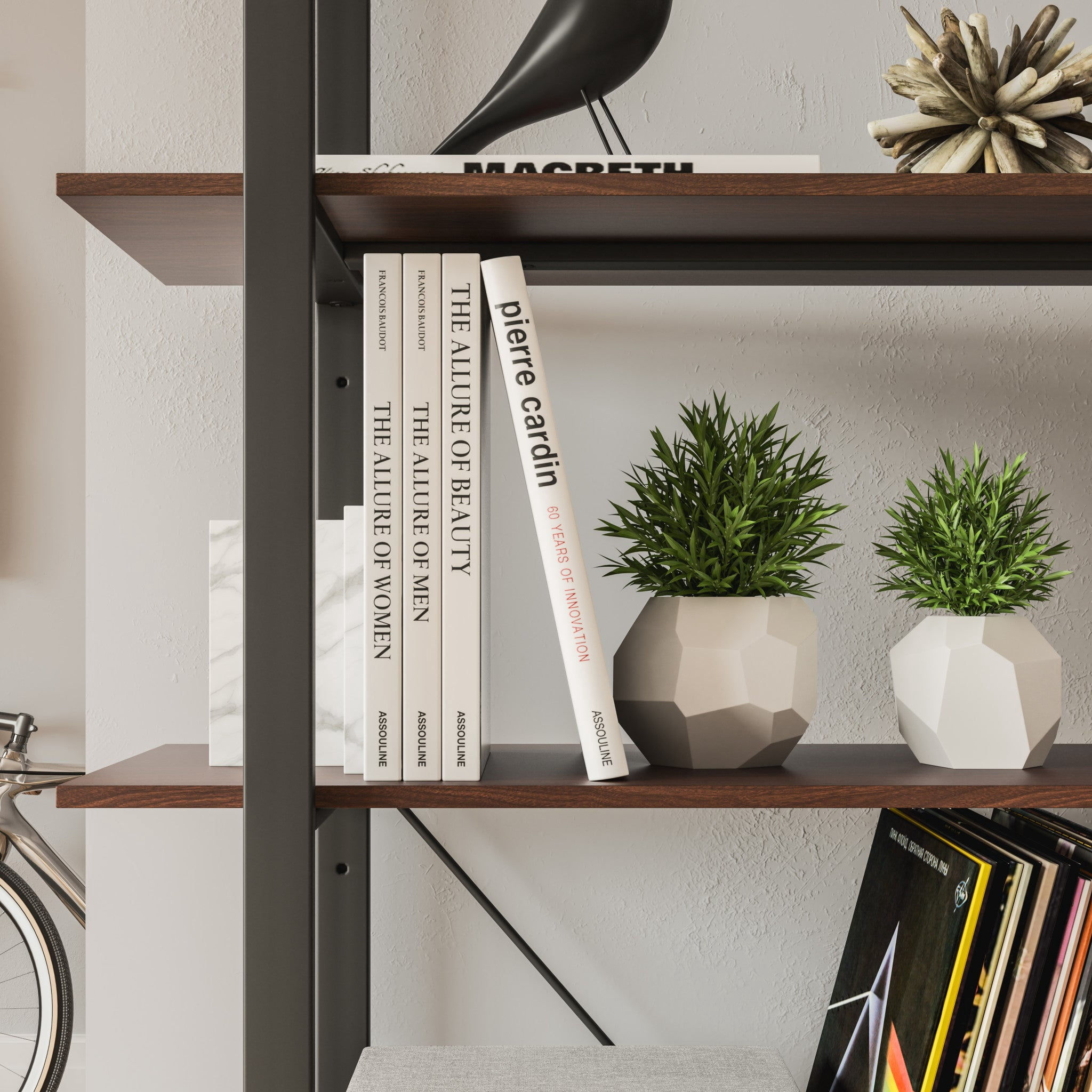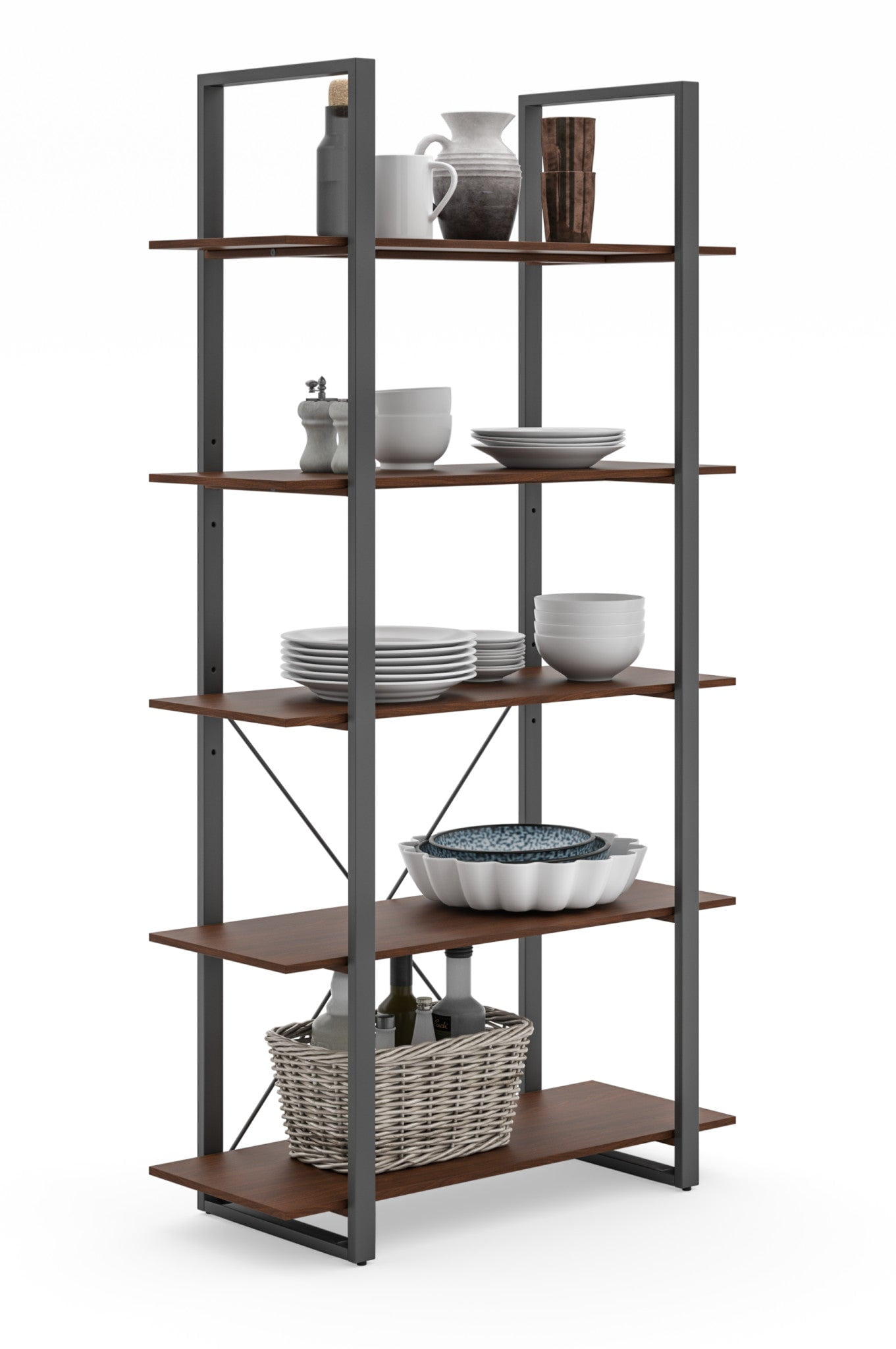 Organize books or showcase valuables with this Homestyles Merge Five-Shelf Bookcase. Whether used in an office setting, living room or bedroom, this vertical storage solution is ideal for smaller spaces. The two middle shelves are adjustable to achieve desired heights for storing items. The light scale frame gives it a minimalist appeal, which accentuates the warm walnut veneer. The lacquer top coat protects the finish and creates totally worry-free ownership. Features: Finish: Walnut Brown Stain Material: Solid Mahogany combines with Walnut Veneer and Engineered Wood, Metal Multi-functional piece that can be used in a variety of spaces Engineered wood offers incredible structural strength and durability Some assembly required using our easy-to-understand directions. Compact size is a comfortable solution for small spaces Two (2) middle shelves are adjustable Specifications: Assembly Required: Yes Hardware: Hardware Included Product Dimensions: 69″H x 36″W x 15″D Product Weight: 65.6 lbs Number of Shelves: 5