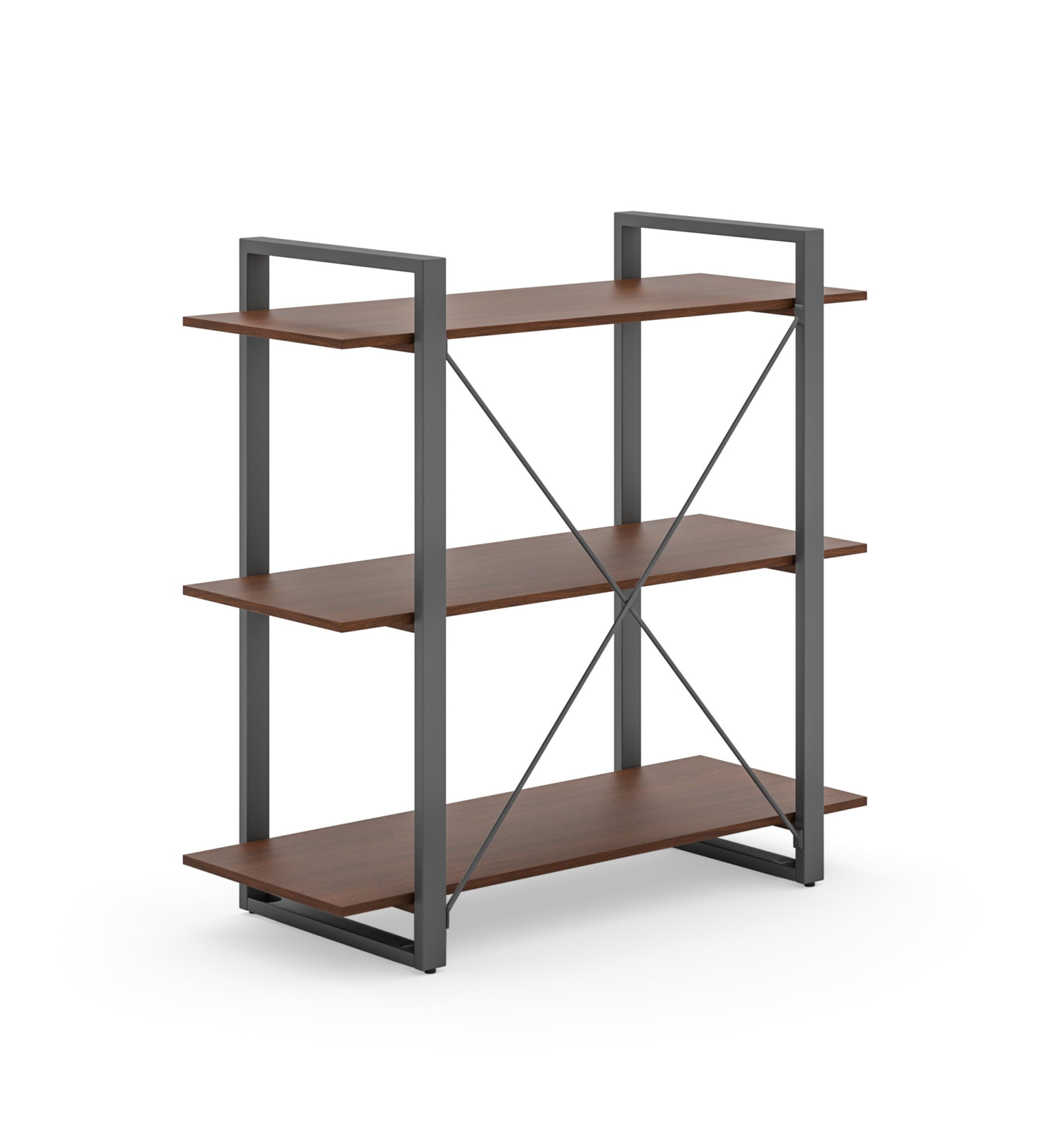 Organize books or showcase valuables with this Homestyles Merge Three-Shelf Bookcase. Whether used in an office setting, living room or bedroom, this vertical storage solution is ideal for smaller spaces. The light scale frame gives it a minimalist appeal, which accentuates the warm walnut veneer. The lacquer top coat protects the finish and creates totally worry-free ownership. Features: Multi-functional piece that can be used in a variety of spaces. Walnut finish creates a clean, modern look. Compact size is a comfortable solution for small spaces. Engineered wood offers incredible structural strength and durability. Some assembly required using our easy-to-understand directions. Furniture conveniently delivers straight to your home. U.S.-based Homestyles has delivered exceptional online furniture experiences for more than 20 years Specifications: Assembly Required: Yes Number of Shelves: unspecified Hardware: Hardware Included