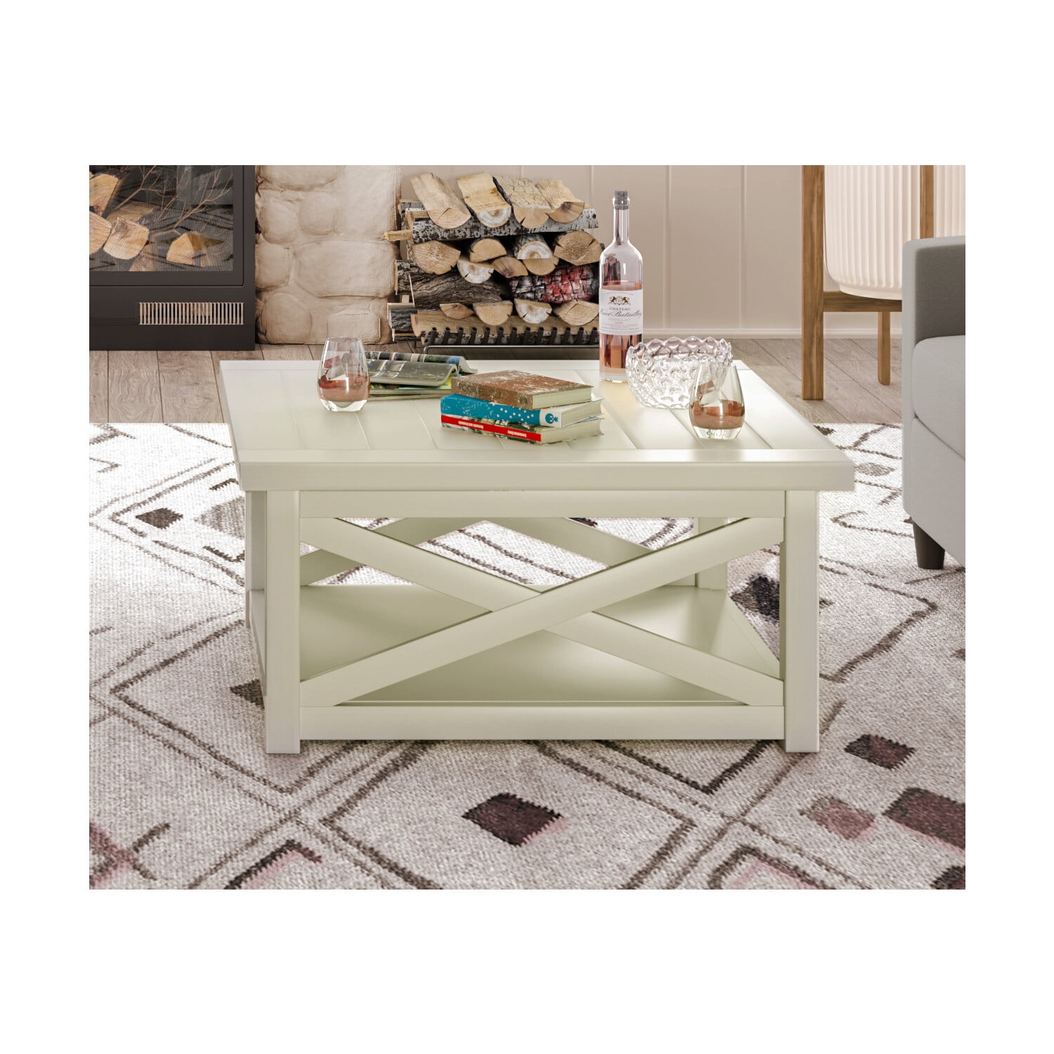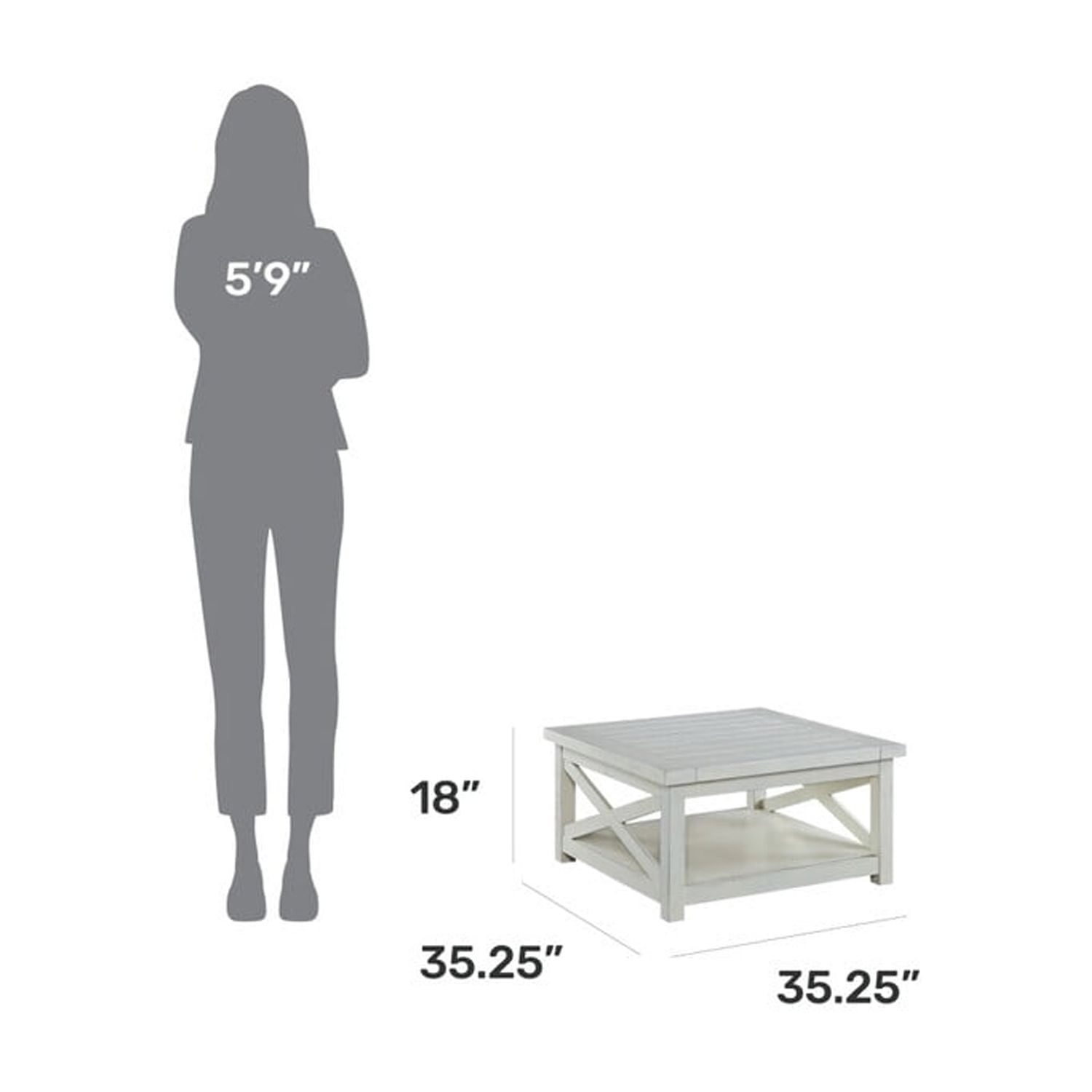 Whether outfitting the family room or any open area in your home, add the finishing touches with this Homestyles Seaside Lodge Coffee Table. The combination of open storage and a large top creates a place for displaying or organizing a variety of items. The weathered finish is easy to clean and will continue to add style to your space for years to come. Features: off white finish is refined and timeless. Mahogany hardwood is mixed with engineered wood for supreme strength. Wire-brushed veneer gives it a unique multi-toned finish. Plank top creates a rustic look. Open storage allows you to optimize your storage options. Some assembly required using our easy-to-understand directions. Furniture conveniently delivers straight to your home. 5523-21