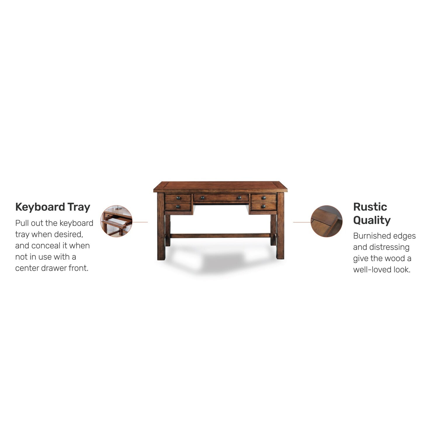 Hardwood and engineered wood offers incredible structural strength and durability. Aged maple for a classic warm finish. Veneer provides the beauty and feel of natural woodgrain Keep space looking tidy by closing drop-down keyboard tray when not in use. Drawers provide convenient and easy-to-access storage. Timeless antique bronze finish on hardware adds a touch of warmth and beauty to your home. Some assembly required using our easy-to-understand directions. 5412-15