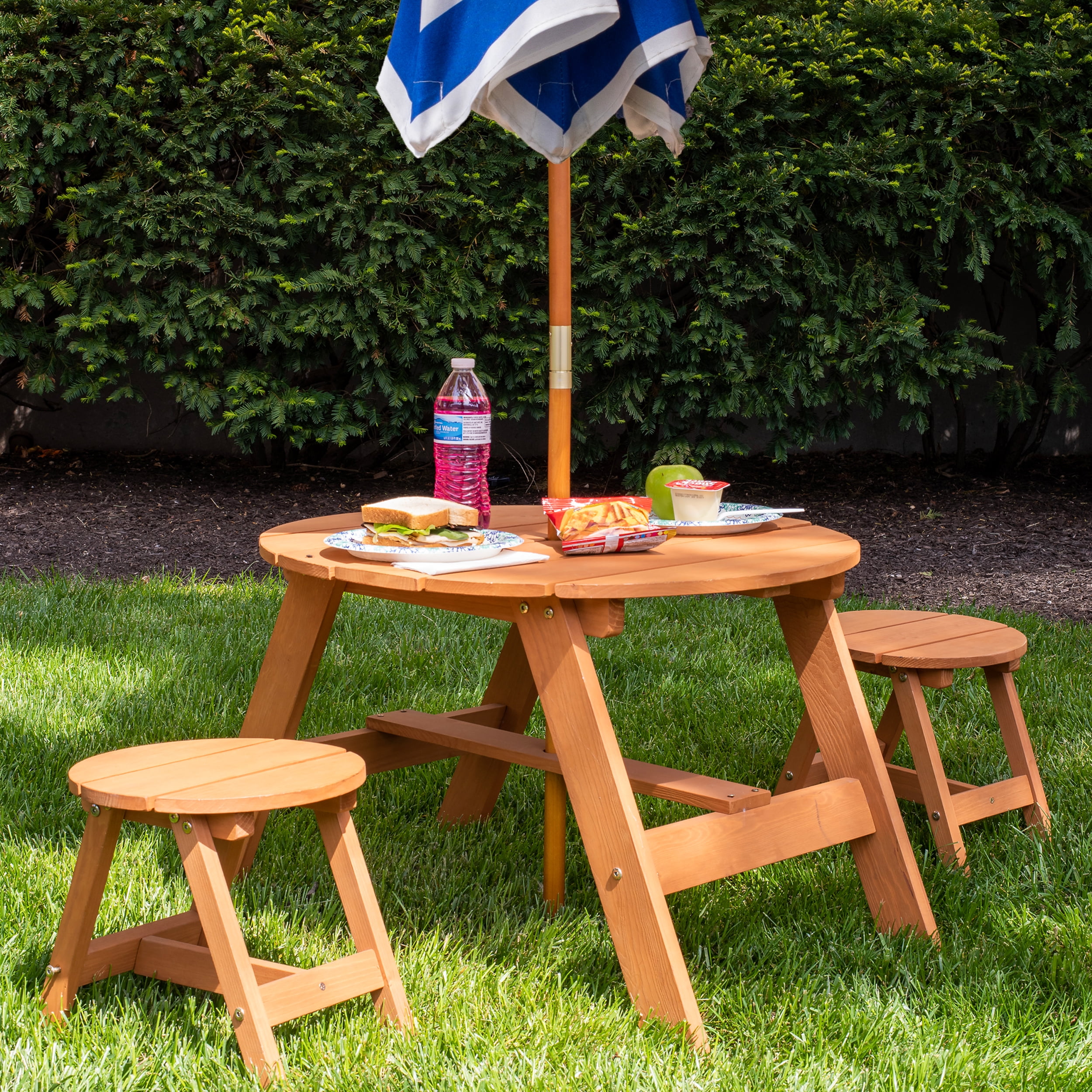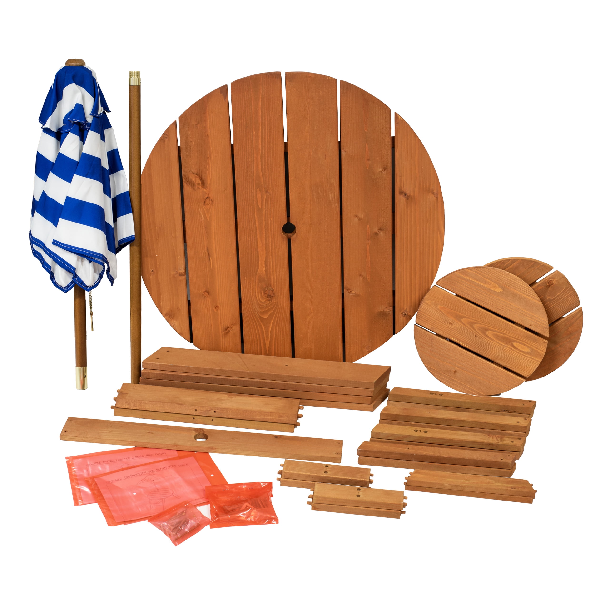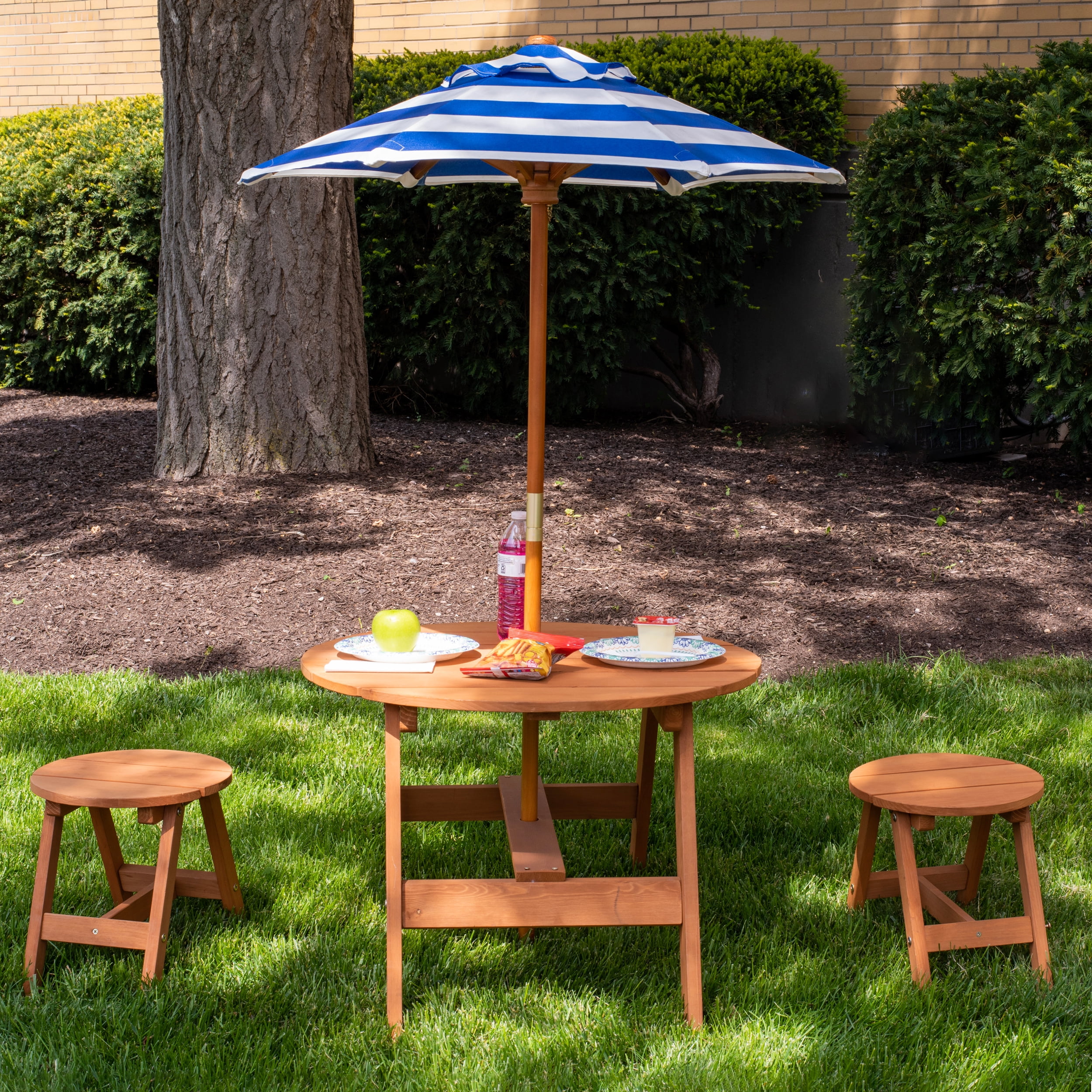 Create more backyard magic with the Durable Homeware Wood Round Table, 2 Chairs and Umbrella. This set features a blue-and-white striped umbrella for shade and ambiance. The Brown round Wood table is unique and stands upon a wide, stable four-legged base. The Set has round stools with slatted tops and are just right for ages three years and up. The kids will have their own Table and Chair set to sit at for Backyard Cookouts or use indoors in a playroom without the umbrella. Great for Lunch Time, Snack Time, or crafts. Each stool can handle up to 66 pounds. The perfect addition to your backyard. Check out the matching Lounger Chair #1000, or Deck Chair #1025. This set is recommended for children ages 3 years and up.