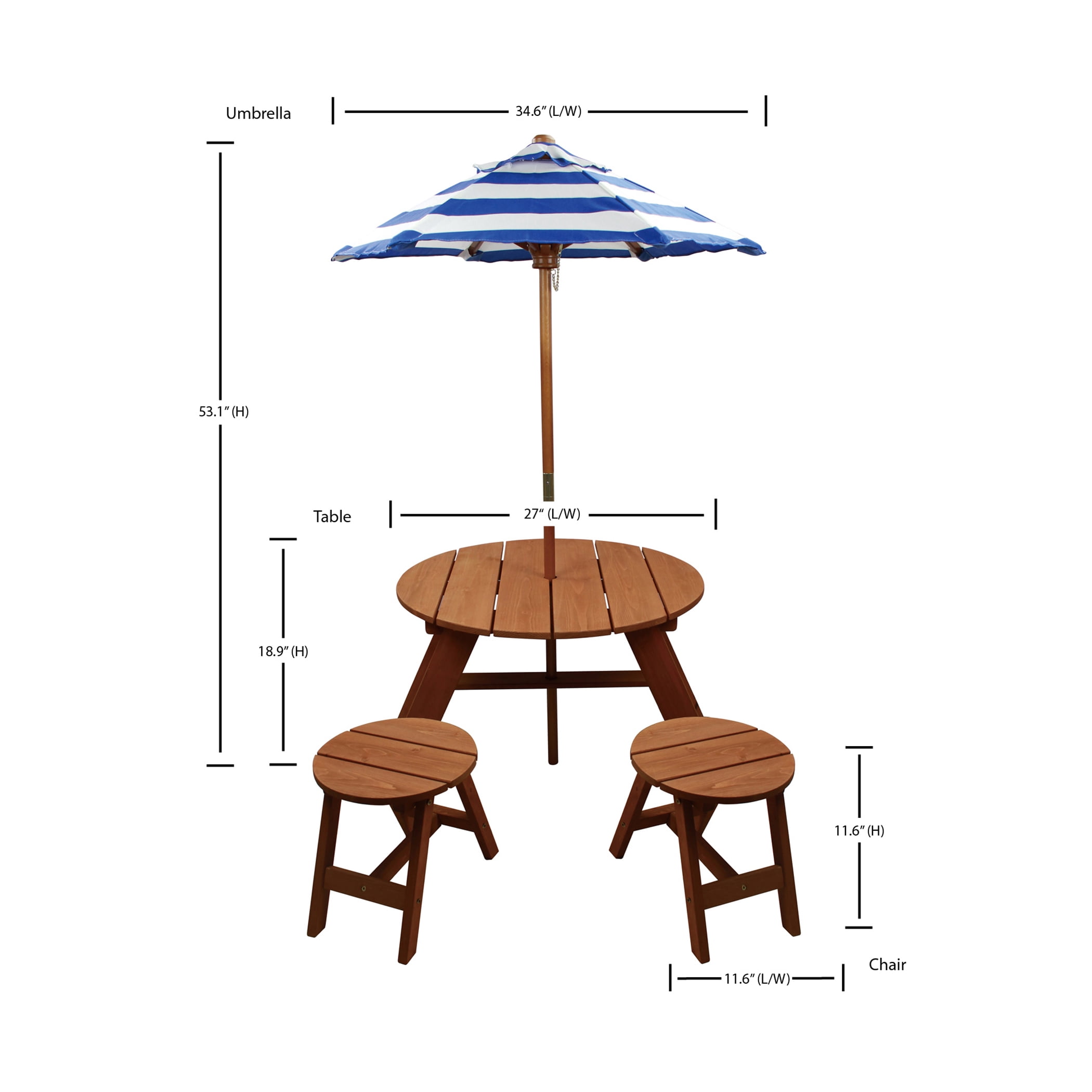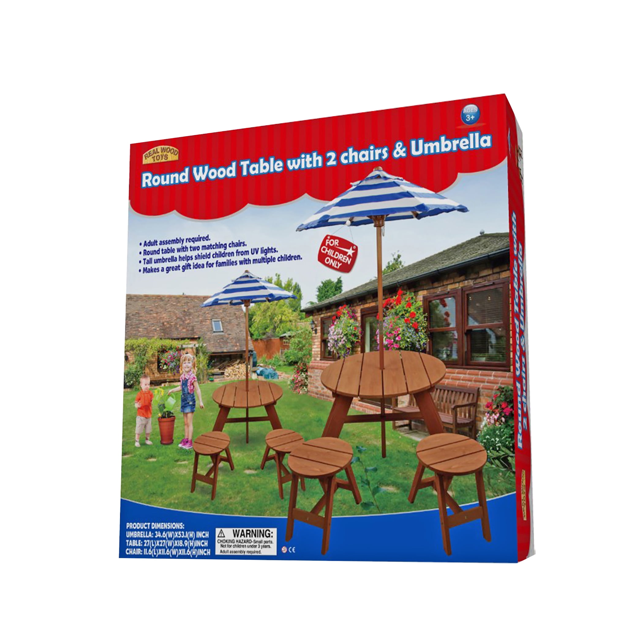 Homeware Classic Wood Round Table with Umbrella and 2 Chairs: Age range: 3 to 6 years Includes 2 chairs, round table and umbrella Umbrella: 34.6″W x 53.1″H Table: 27″L x 27″W x 18.9″H Chair: 11.6″ x 11.6″ x 11.6″ Table height: 18.5″ Solid wood Easy to assemble Made of weather-resistant sturdy wood Weight limit: 66 lbs per seat