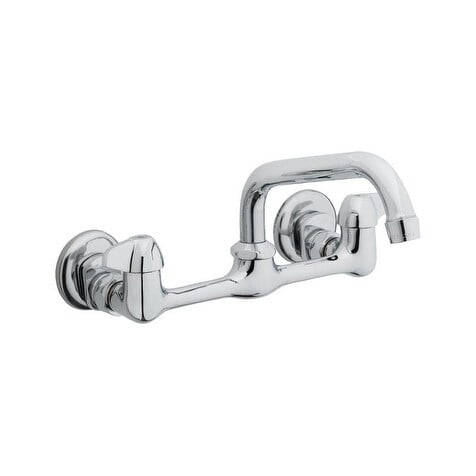 Brand Name: Homewerks Style: Wall Mount Number of Faucet Handles: Two Handle Finish: Chrome Product Type: Kitchen Faucet Side Sprayer Included: No Supply Lines Included: No Spout Reach: 8 in. Built In Water Filter: No Soap Dispenser Included: No Handle Type: Lever Packaging Type: Boxed On Center Measurement: Adjustable Adjustable Flow Rate: No ADA Compliant: No Spout Type: Low Arc Number of Installation Holes Required: 2 Flow Rate: 1.8 gpm Valve Material: Ceramic Department – PLUMBING/HEATING mdseClass – FAUCETS prodGroup – SINGLE BASIN FAUCETS