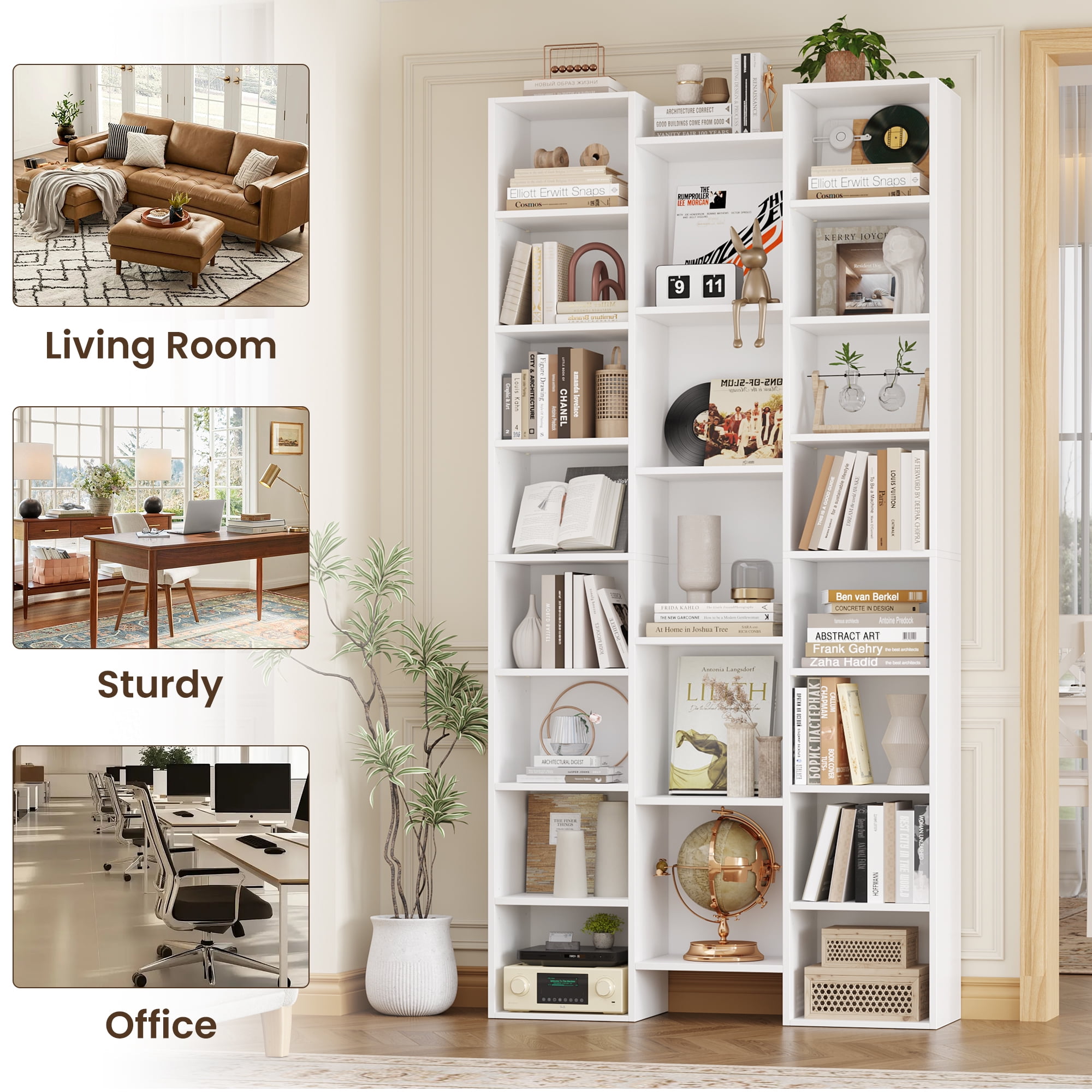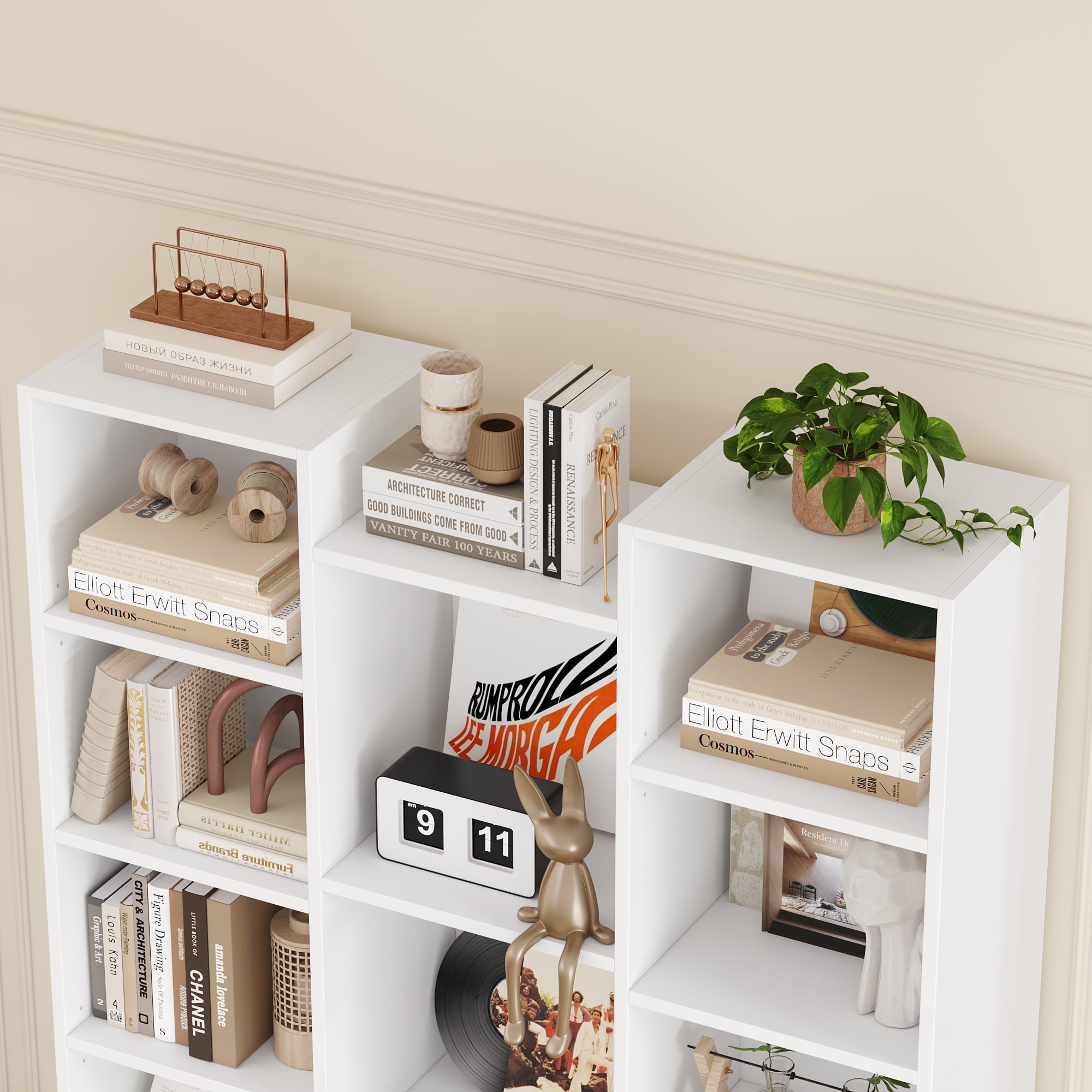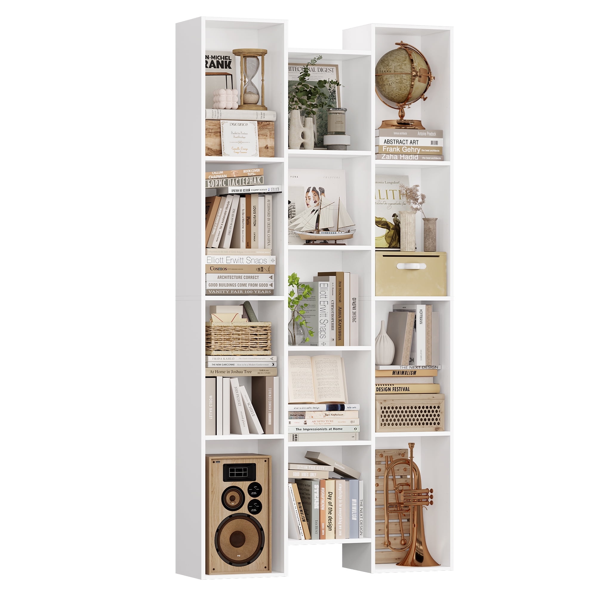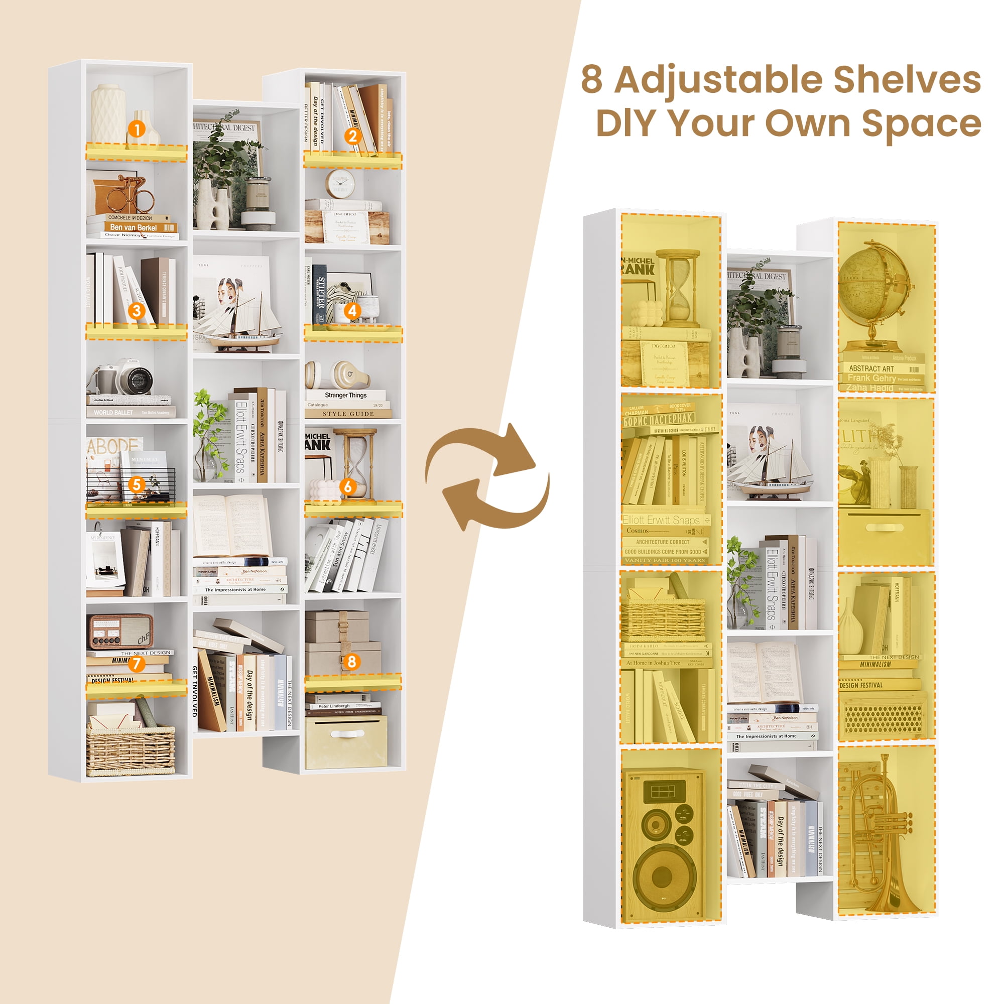 Features: 【Spacious Storage Space】Triple width storage shelf has 21 storage organizers, which can provide powerful storage space according your needs. 【Modern Storage Shelf】The special “H” structure of this display shelf has elegant look with clean-lined stylish, adding a modern feeling to your home. 【Sturdy and Durable】Selected wood, our modern bookcase is enough strong and durable to hold all of your items. 【 Eco-friendly Material】Made from the high quality particle board, this storage organizer will be non-toxic and safe to both you and your family. 【Adjustable Shelves】 The both sides of this media storage shelf are designed with 4 adjustable shelves, allowing you to adjust the height of each storage compartment to meet your daily use. 【 Easy to Clean】The smooth surface make the display rack easy-to-clean. 【Anti-tipping Device】With the anti-tipping device, the tall bookshelf can fixed stably to the wall to prevent it from tipping over. 【Easy to Assemble】According to the detailed instructions, this open wood shelf can be easily and quickly assembled by 2 adults. 【24/7 Customer Service】 We provide quality customer support, if you have any questions with this 71.3” bookshelf, please email us and we will reply within 24 hours. Specification Color: White Material:Particle Boards Overall Size: 71.3” H x 9.3” W x 35” L Overall Product Weight: 75.4 lb Middle Shelf Size: 12”H x 11.7” L Side Shelf Size: 10.7”L x ” L 8.3”H Tip over Restraint Device Included: Yes Adjustable Interior Shelves: Yes Assembly Required: Yes Packaging Includes 1 x Cube Bookcase 1 x Assembly Kit 1 x Instructions