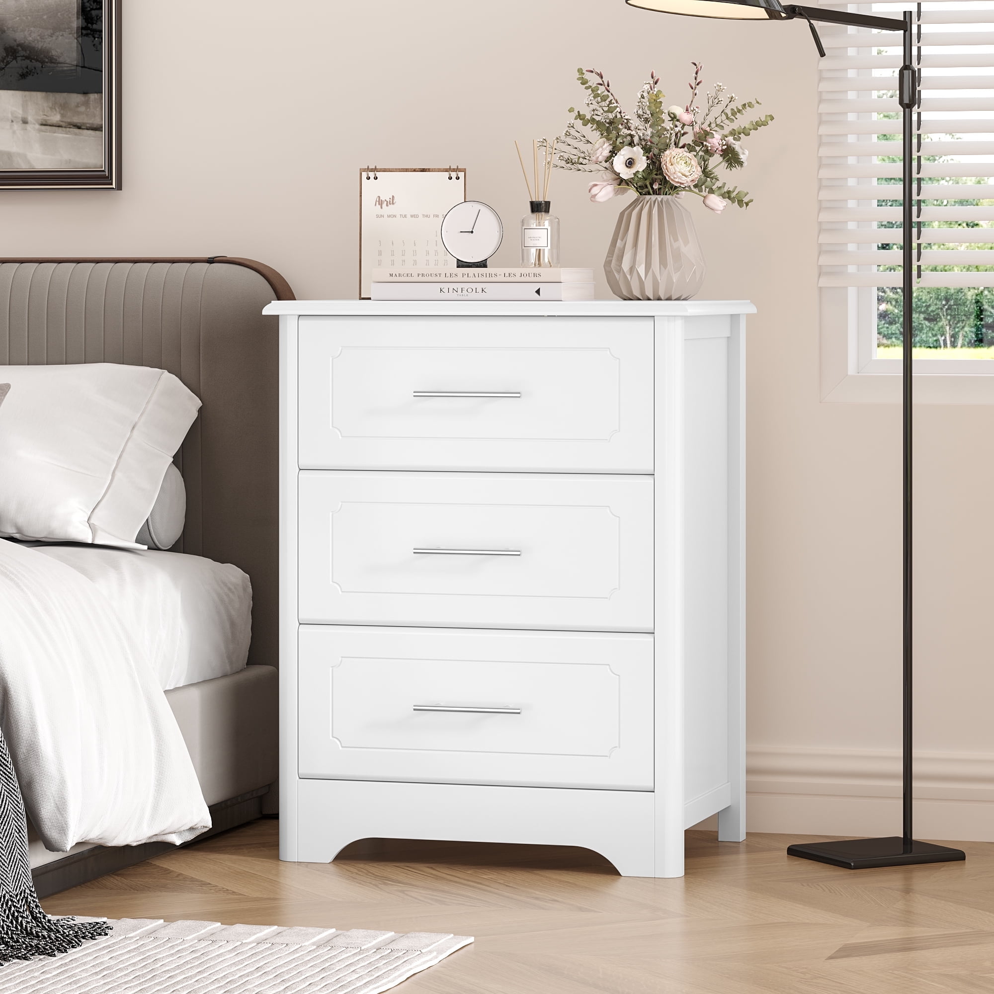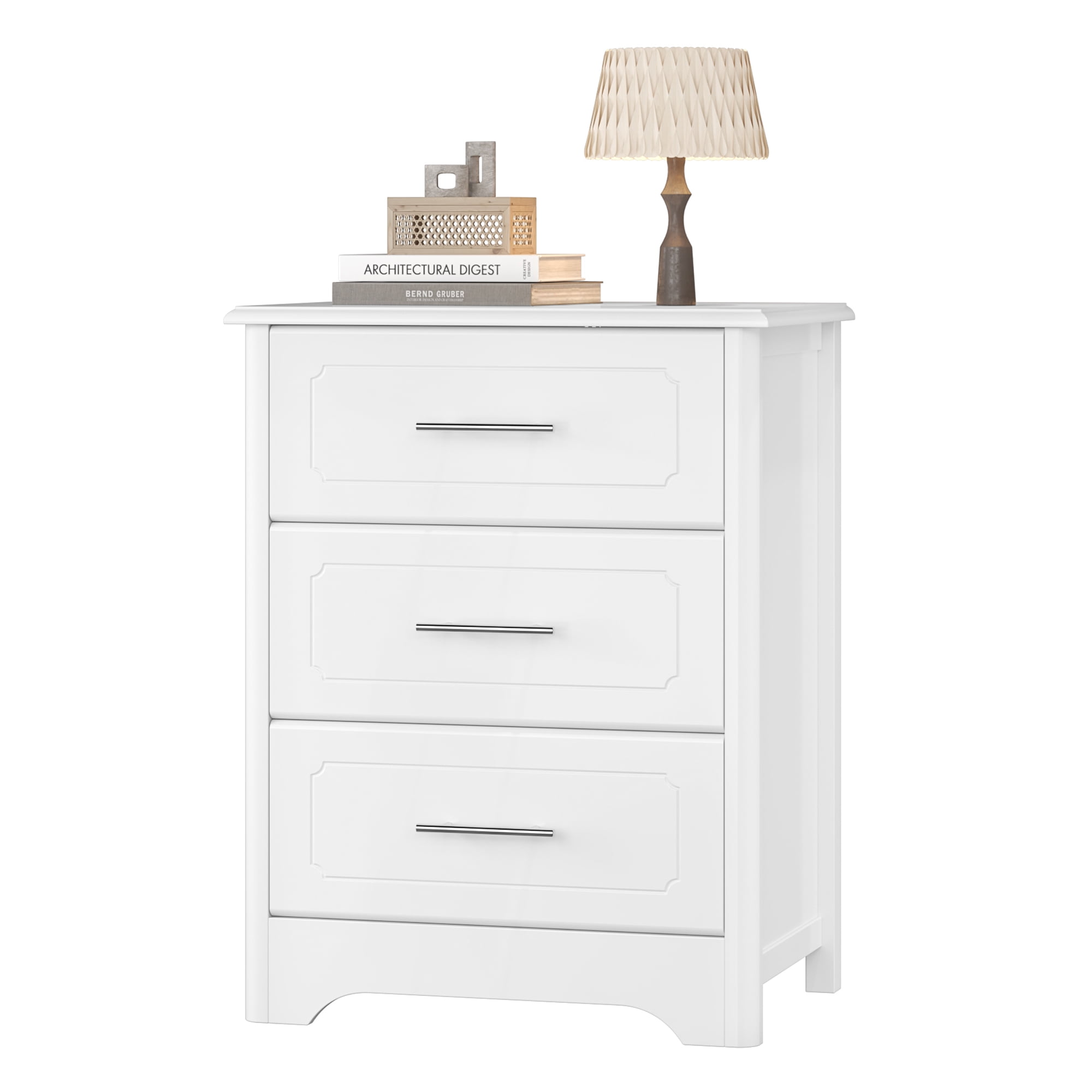 Features 【Modern Design】The 3 drawer dresser has a minimalist white look with elegant silver handles that will go perfectly with any of your furniture decor style. 【Extra Storage Space】With 3 easy-glide drawers, this modern drawer chest offers more space for your bedroom. 【Sturdy and Durable】Constructed of high-grade manufactured wood, this bedroom nightstand is durable for years and easy maintenance. In addition, its anti-tippling device adds more safety. 【Perfect for Small Space】The simple square structure and compact size are perfect for small rooms or apartments. 【Multi-scene Use】It not only can be used alone or in pairs as a nightstand, but also as well as a bedroom dresser, or as a sofa table, end table, side table, storage accent table for living room or hallway. 【Easy to Assemble】Coming with the detailed and illustrated instructions and numbered parts, the wood 3 drawer nightstand can be easily assembled by 1 person. 【24/7 Customer Service】 We provide quality customer support, if you have any questions, please email us and we will reply within 24 hours. Specification Material: MDF Color: White Overall Size: 23.6” L x 15.7” W x 32” H Item Weight: 51 lb Number of Drawers: 3 Packaging Include 1 x White Nightstand 1 x Accessory Kit 1 x Instructions Manual