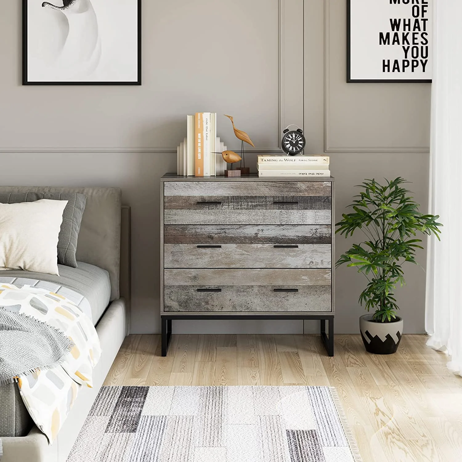 Features: 【3 Drawer Wide Dresser】This 3 drawer modern bedroom dresser, nightstand, side table is suitable for bedroom, living room, nursery, entrance and so on. Wide drawers and tops are used to organize books, lamps, files, vases, cosmetics, photo frames and more! 【Quality Material】Sturdy steel legs increase the stability of the locker and prolong its life. In addition, the high-quality chipboard is covered with 3D stickers, which are odorless and easy to clean, so you can rest assured that it’s safe to leave it at home. Simply wipe with a damp cloth when cleaning. 【Simple Style】Gray tone wood grain, matte black frame and handles, elegant look and practicality matches any home style tone. The chest of drawers with metal frame is suitable for most spaces in your home! 【Practical Size】Overall dimensions are 31.5 L x 14.9 W x 32.3 H, with 4.3 inches of internal drawer storage depth. For more information on dimensions, please see pictures. 【Easy to Assemble】The assembly instruction diagram is easy to understand and each part is numbered, you can effortlessly assemble the wide dresser within 1 hour! 【24/7 Customer Service】We provide quality customer support, if you have any questions, please email us and we will reply within 24 hours. Specification: Color: Wash Gray Material: particle board, steel legs Overall Size: 32.3” H x 31.5” W x 15.6” D Main Drawer Interior: 5.1” H x 28.7” W x 12.6” D Main Drawer Weight Capacity: 55 lb Overall Product Weight: 70.88 lb Package contains: 1 x 3 Drawer Dresser 1 x Accessory Kit 1 x Assembly