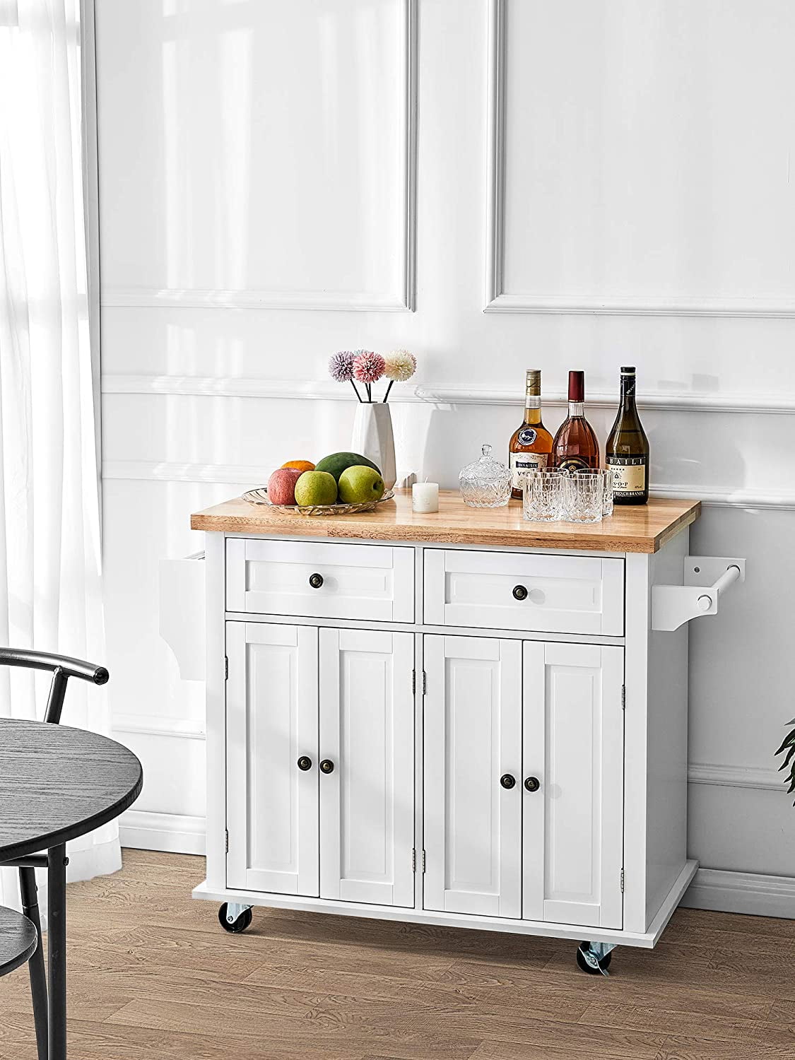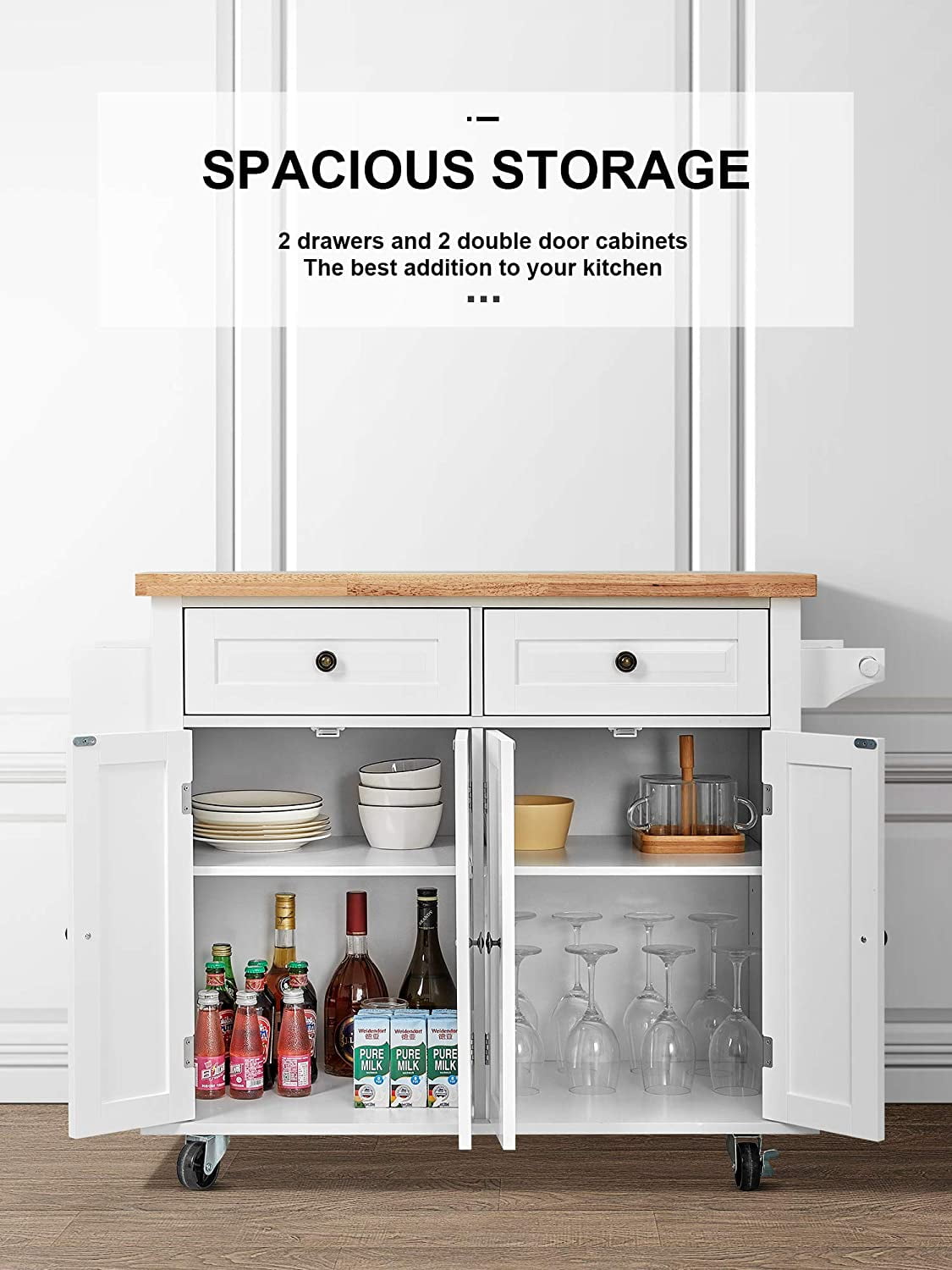 Homfa 35.5” Kitchen Island Cart on Wheels, 4-Doors 2-Drawers Rolling Storage Cart with Adjustable Shelves & Rubberwood Countertop, White