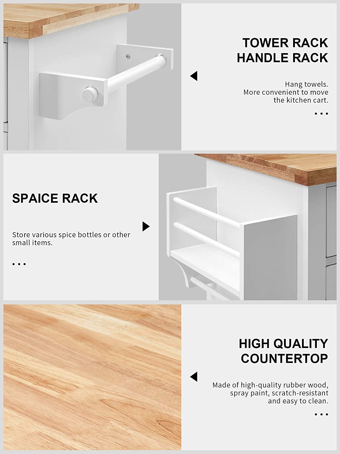 【Large Storage Space Kitchen Cart】Equipped with 2 drawers, 2 storage cabinets, and towel rack, spice rack, this kitchen island provides spacious storage space for kitchen and dining essentials. The countertop can be placed with small appliances such as microwave ovens, toasters, etc. 【Sturdy and Durable】The kitchen island on wheels is made of high-quality MDF material and rubber wood. It is sturdy and durable. 【 Easy to Clean】With exterior spray paint, the surface of the kitchen island cart is not deformed or moldy, scratch-resistant, and is easy to clean. 【Rolling Kitchen Island with Lockable Casters】With 4 universal wheels, the kitchen island cart can be moved smoothly in various places in the home, saving you effort. The locking design of the casters can make the kitchen island stop steadily where you want 【Adjustable Shelves】The shelves in the storage cabinet is an adjustable design, you can adjust the height of the shelves according to the size of the kitchen utensils, to best meet your needs 【Easy to Assemble】 With the assembly instructions, the kitchen island can be easily assembled by one person in 1 hour. Color: White Material: Rubber Wood and MDF Product Dimension: 35.5″ L x 17.8″ W x 32.3″ H Item Weight: 65.3 lbs. / 29.6 kg Package Weight: 70.5 lbs. / 32 kg Assembly Required: Yes 1 x Kitchen Island Cart 1 x Assembly Kit 1 x Instructions