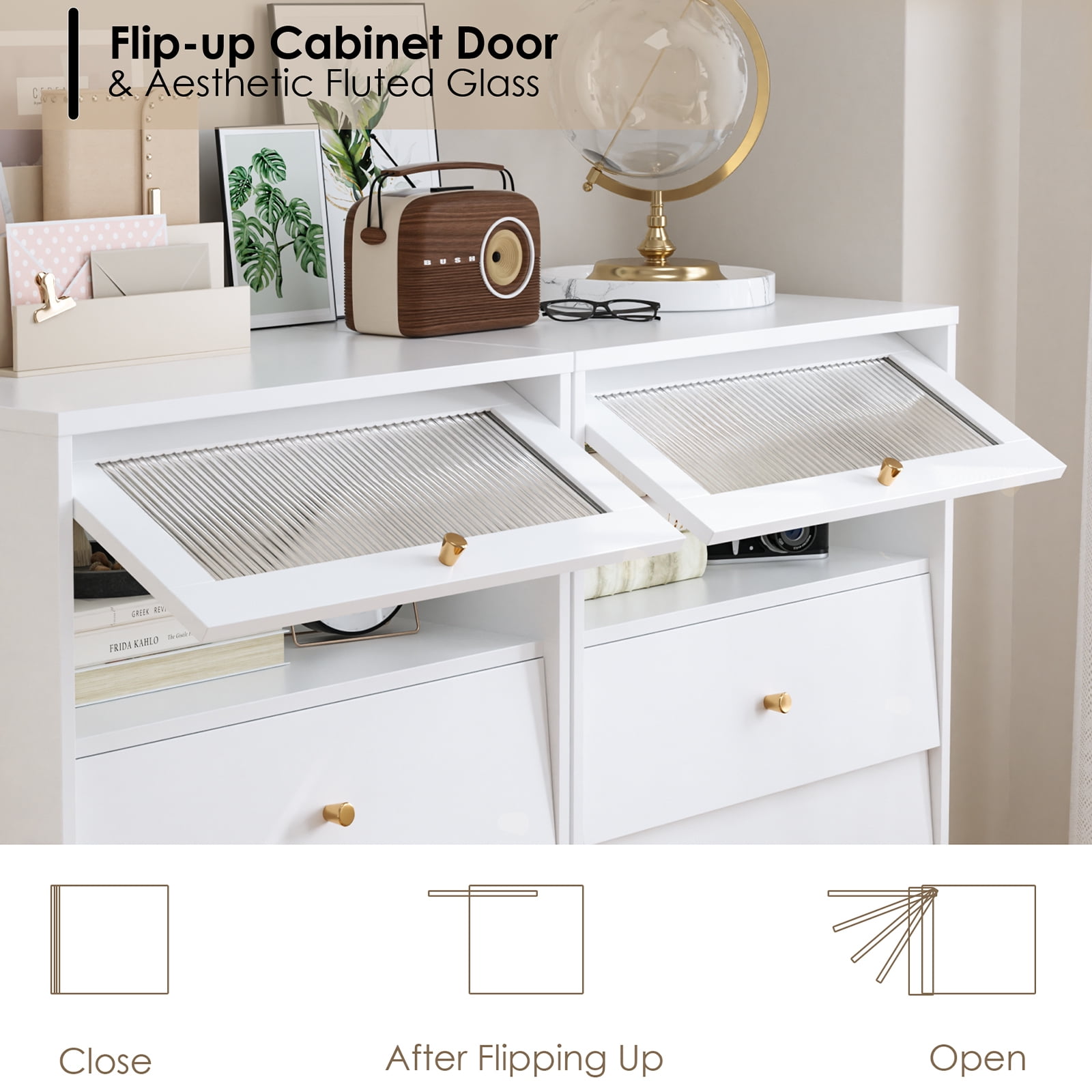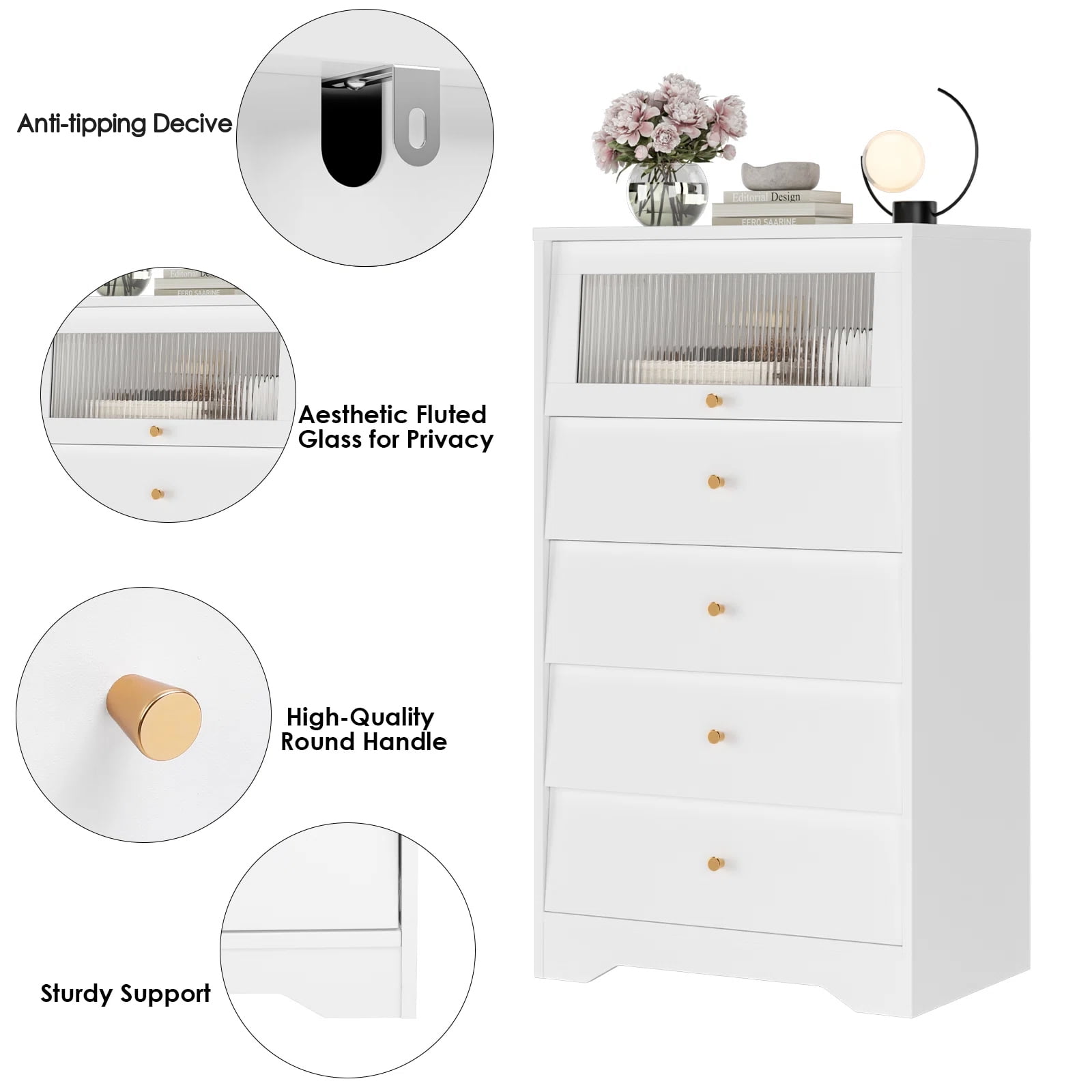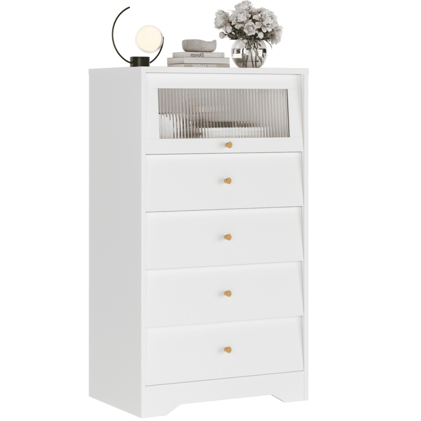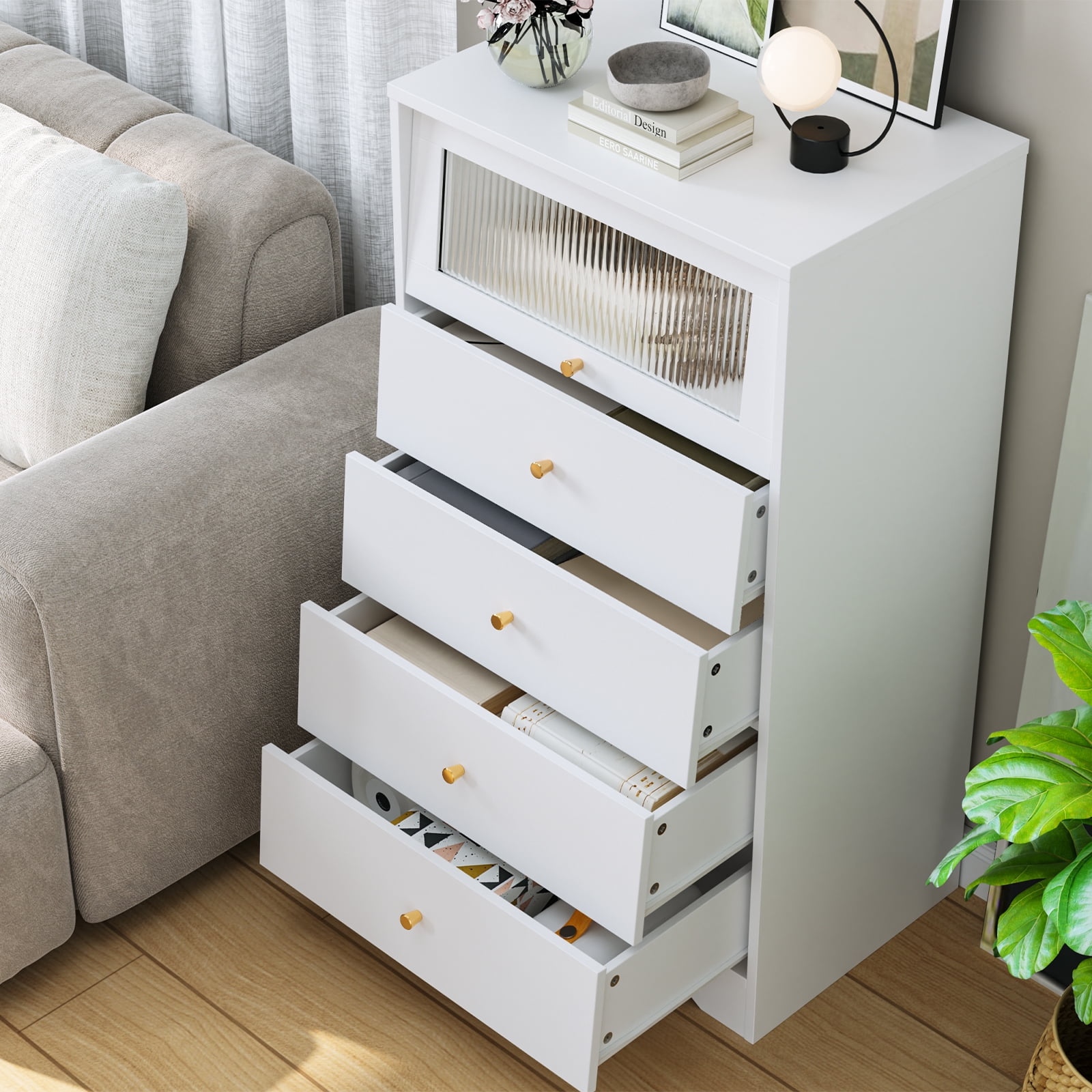 Homfa 4 Drawer Tall White Bedroom Dresser Night Stand with 1 Flip Up Glass Door, Modern Wood Storage Cabinet for Living Room Hallway