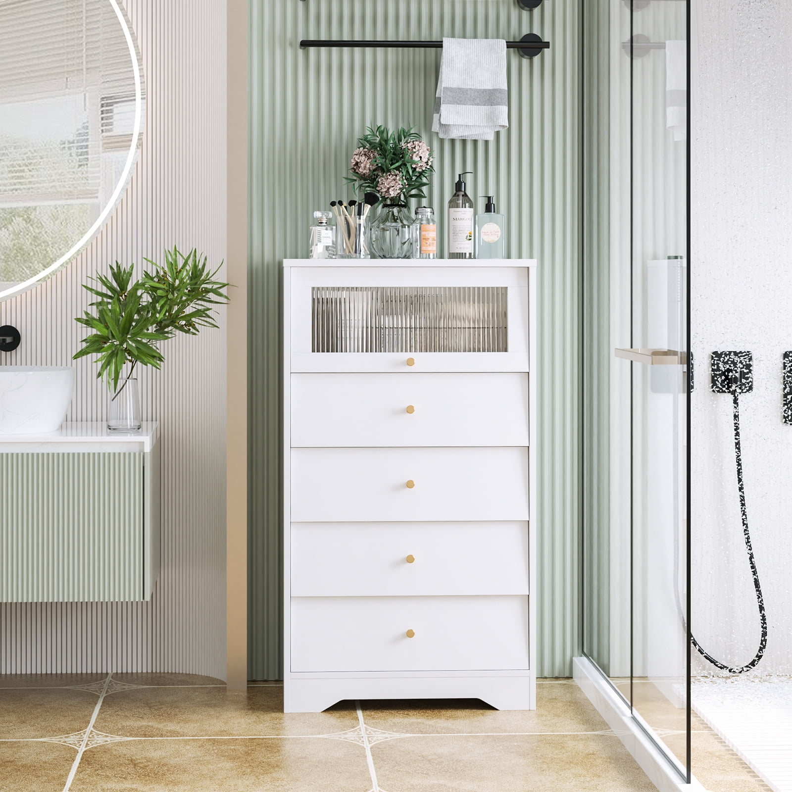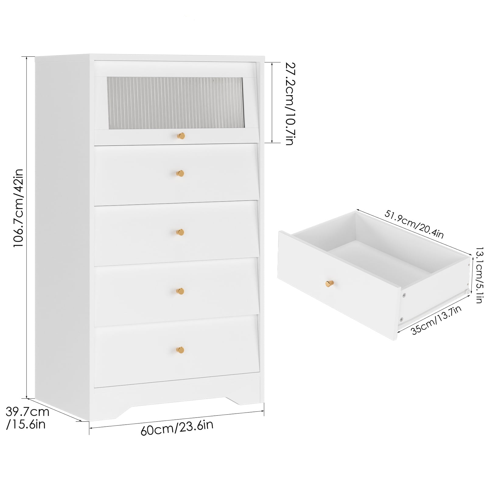 Features: 【Flip-up Cabinet Door & Aesthetic Fluted Glass】Flip-up door drawer pattern can be stored in the shelf after flipping up 90° to save your space. Fluted glass of drawer will balance aesthetics and privacy protection well. 【White Dresser with Smart Arrangement】4 dresser drawer close spcae, 1 storage shelf and clean dresser top surface for item display, providing as much storage space as possible for a wide range of storage needs. 【More than A Bedroom Dresser】This modern chest of drawers can not only keep your daily items in your bedroom, but also as a nice white dresser storage unit for iving room, entryway and other places, saving your valuable space. 【Anti-Toppling Device】This homfa 4 drawer white dresser includes 1 anti-falling device to prevent the cabinet from falling over! 【Easy Assembly】Everything needed for assembly comes collected in a package sent to you. The 4 drawer white dresser could be easily assembled in less than 1 hour by 2 adults with the instructions. 【24/7 Customer Service】We provide quality customer support, if you have any questions, please email us and we will reply within 24 hours. Specifications: Material: MDF Wood Color: White Overall Size: 23.6″L x 15.6″W x 42″H Overall Product Weight: 83 lb Number of Drawers: 4 Number of Shelf: 1 Assembly Required: Yes Package Contents: 1 x Dresser Cabinet 1 x Accessory Kit 1 x Instructions Manual