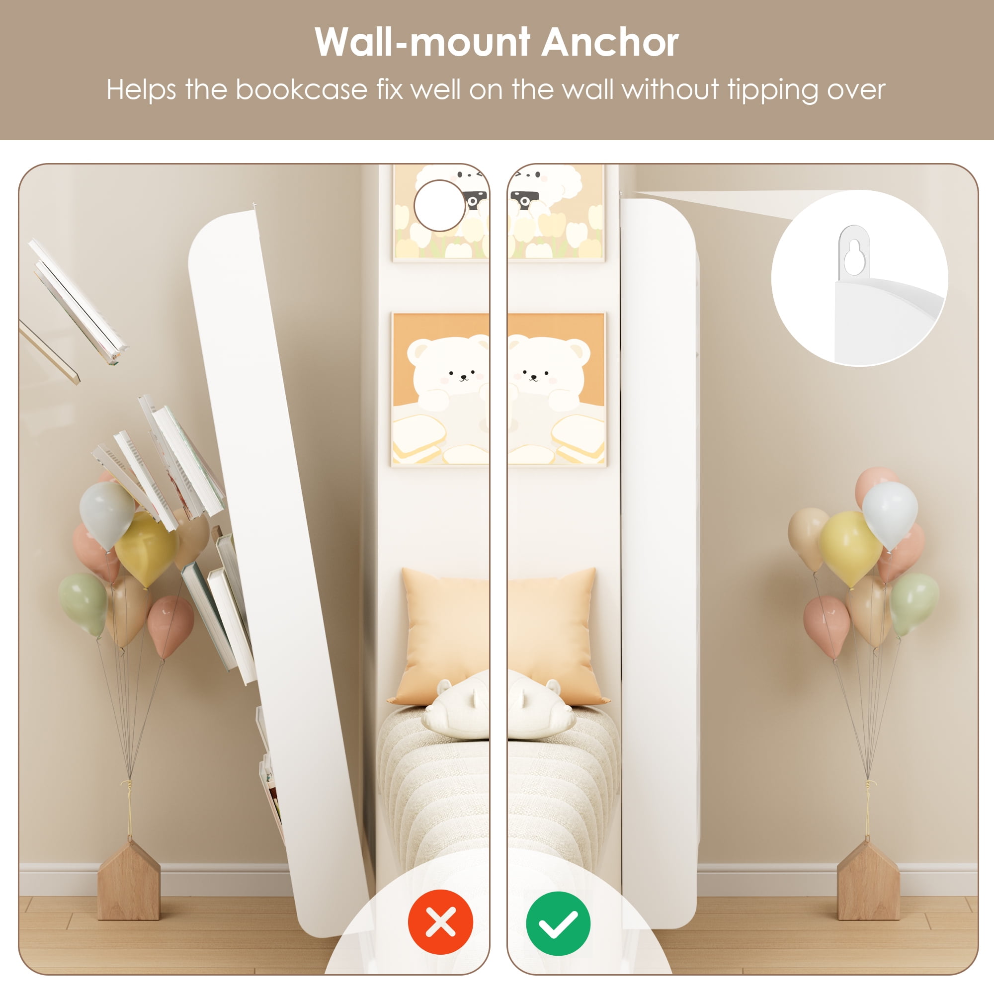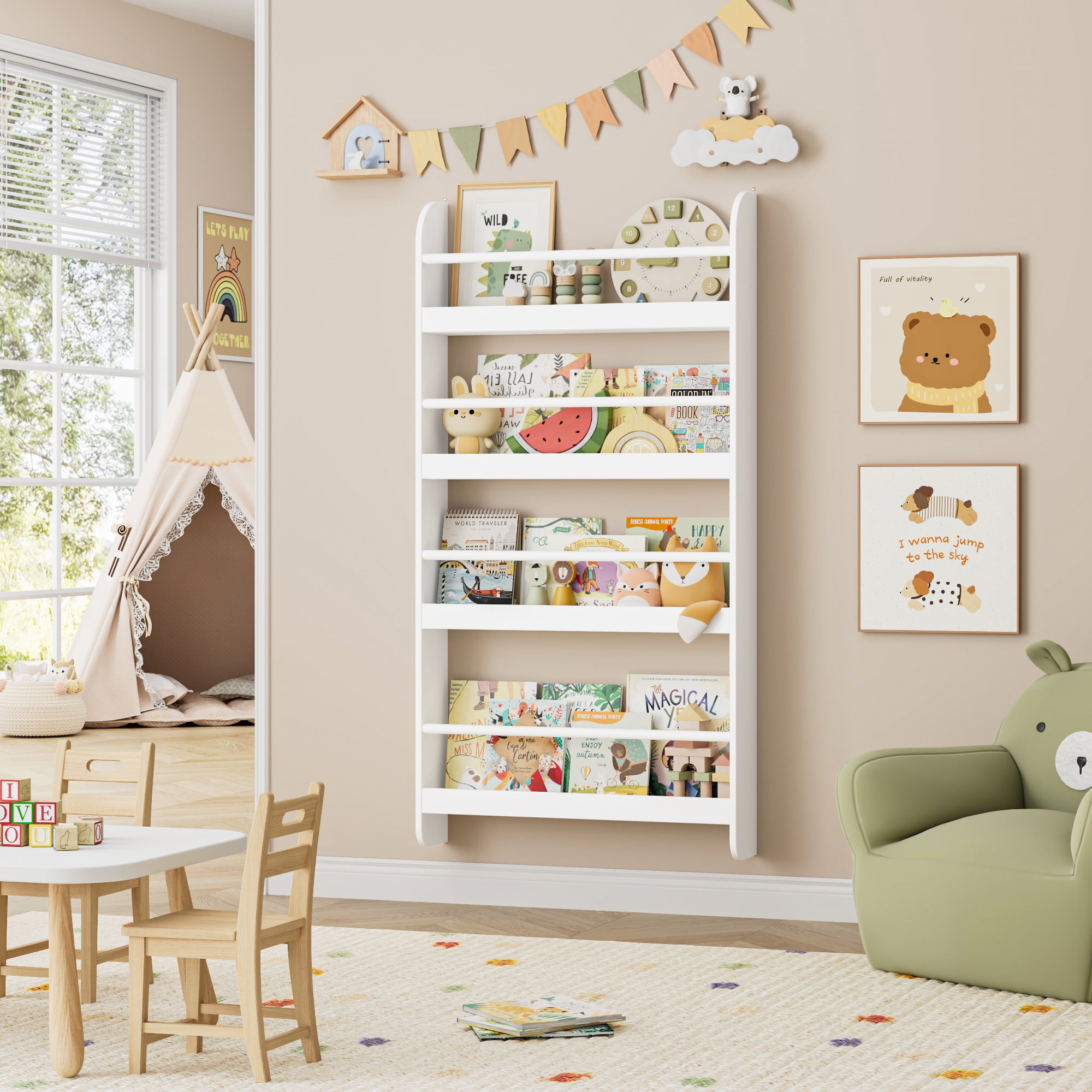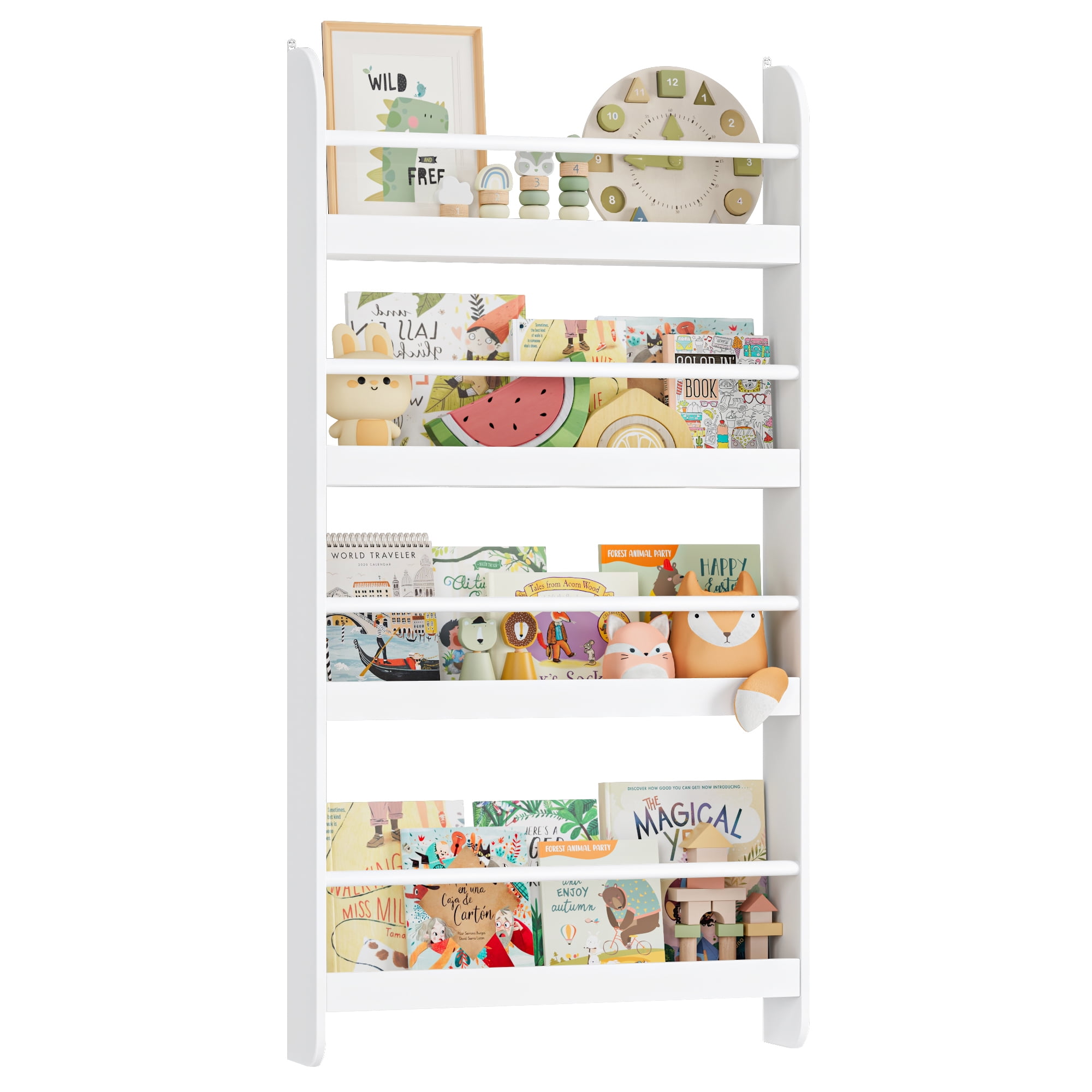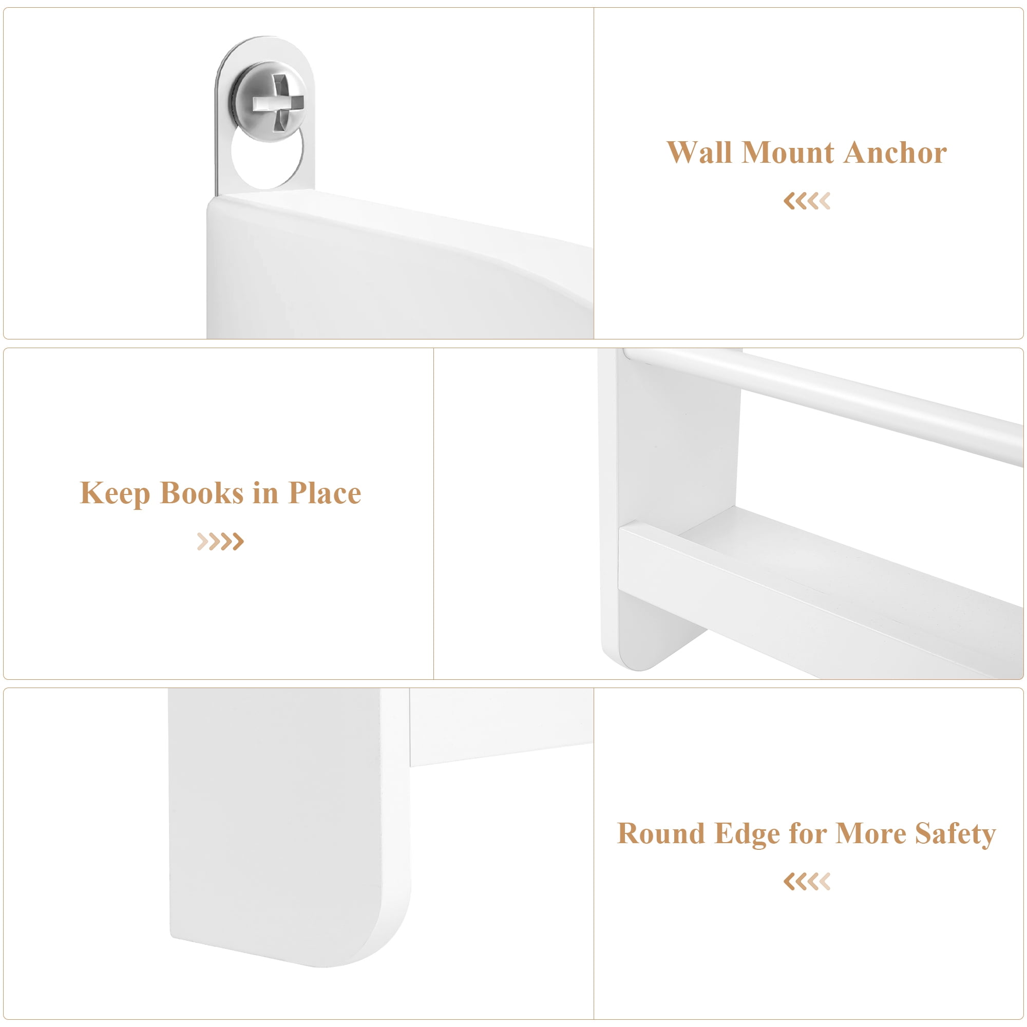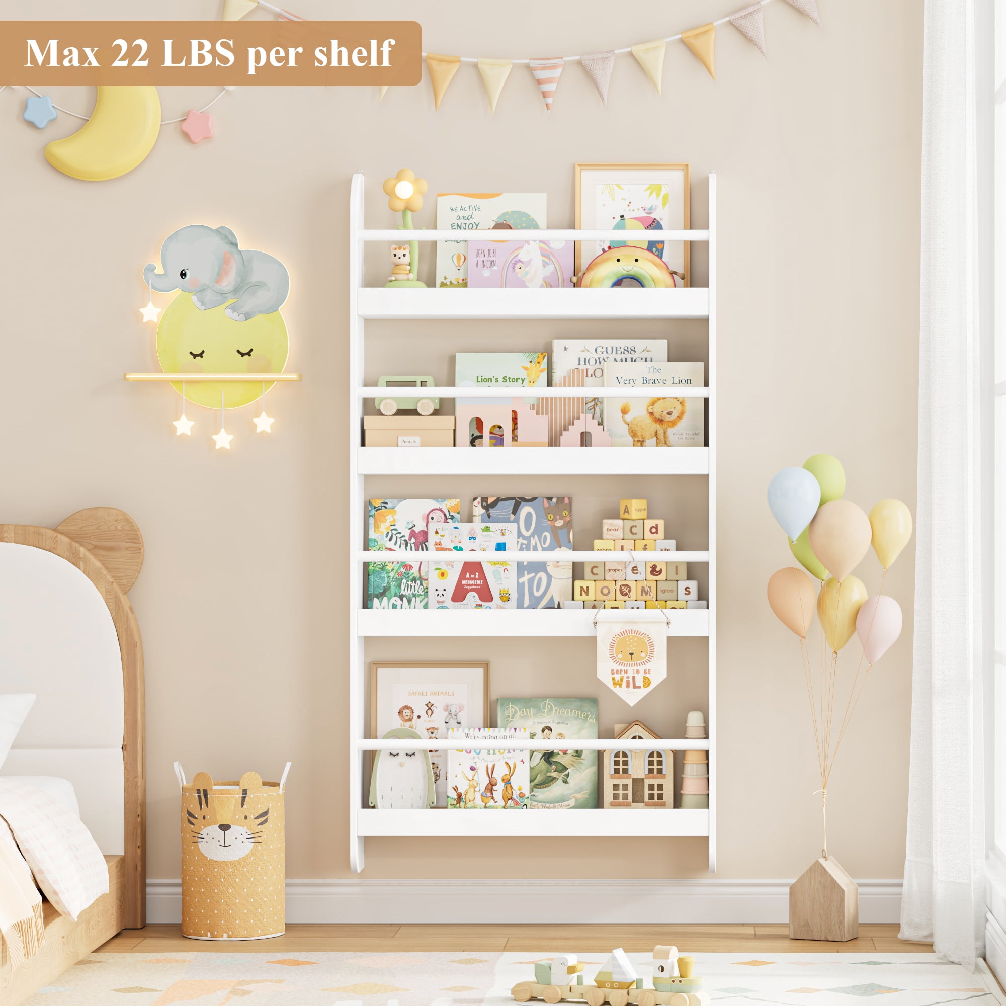Features 【Wall-mounted – Space Saving】The wall-mounted bookshelf helps to develop good habits and encourage children to read and return books by themselves. The wooden rod prevents books from falling and helps children to easily identify and grab books. 【Selected Environmentally Friendly Materials】Protect Your Kids: The 4-layer wall bookshelf is made of high-quality natural medium-density fiberboard, environmentally friendly paint and moisture-proof spray paint, which does not contain harmful chemicals, is durable and easy to clean. The smooth touch is perfect for your child’s collection. 【4-layer Bookshelf – Large Storage】Measures: 22.8″ L x 4.7″ W x 43.7″ H. The bookshelf for kids is designed with 4 layers, which can easily store at least 25 children’s books. In addition, the bookcase and bookshelf can easily organize books, newspapers, magazines and even small toys, allowing you to easily clean the room and save more space. 【First-class Stability – Full Safety】The book storage rack is equipped with 4 fixing points and can be fixed to the wall. It is not easy to deform or damage; don’t worry about its durability and sturdiness. The surface is smooth and flat, and it can be easily cleaned with a damp cloth. 【Easy to Assemble & 24/7 Customer Service】The books and toys display shelf comes with all mounting hardware and detailed instructions; 1 adult can complete it easily in 10 mins. 24/7 quality customer service so you don’t have to worry about lost and damaged parts. Specifications Material: MDF, Spray Paint Color: White Number of Tiers: 4 Dimensions: 22.8″ L x 4.7″ W x 43.7″ H Interior Shelf: 22.8″ L x 4.7″ W x 11.3″ H Package Contents 1 x Wall-mount Kids Bookshelf 1 x Assembly Kit 1 x Instructions