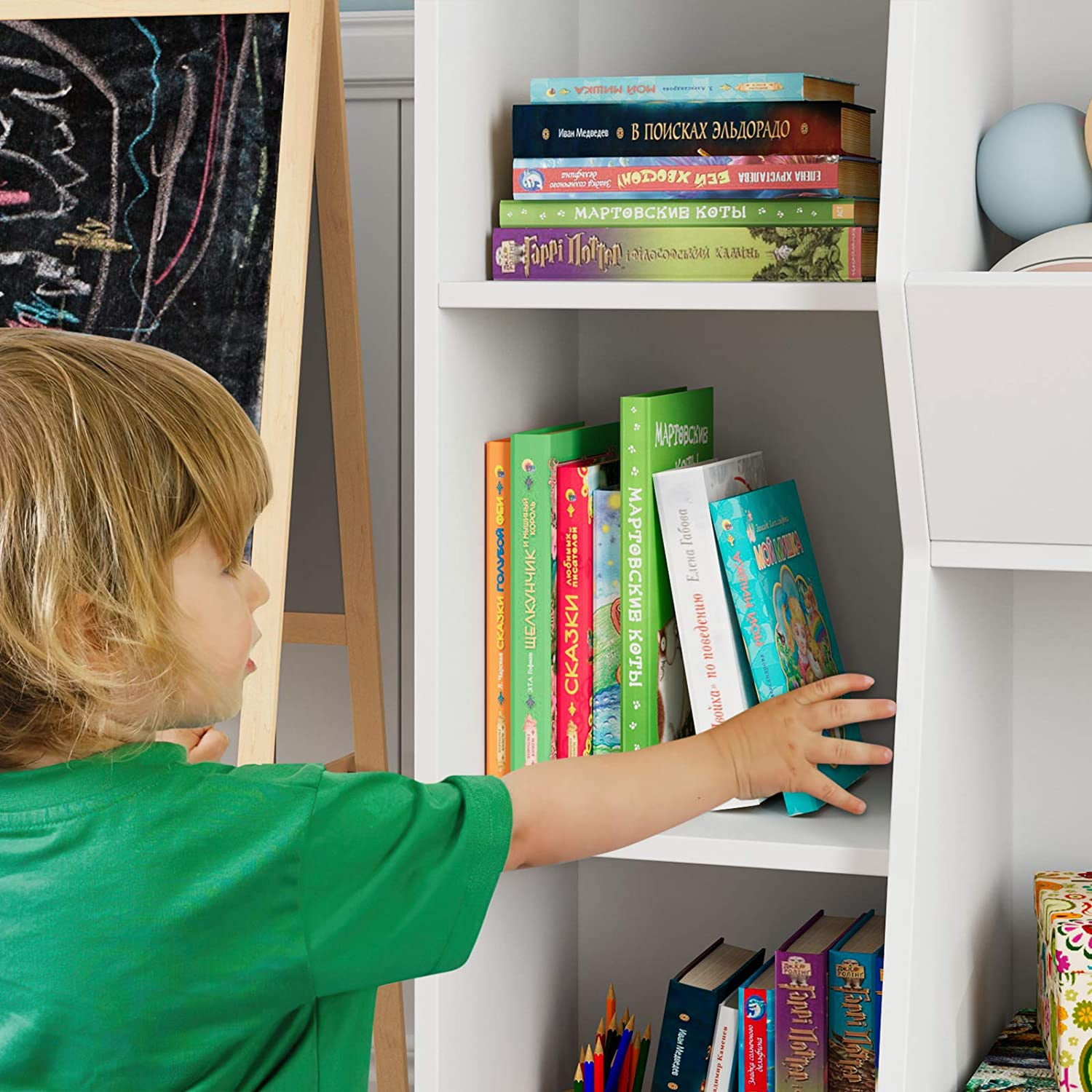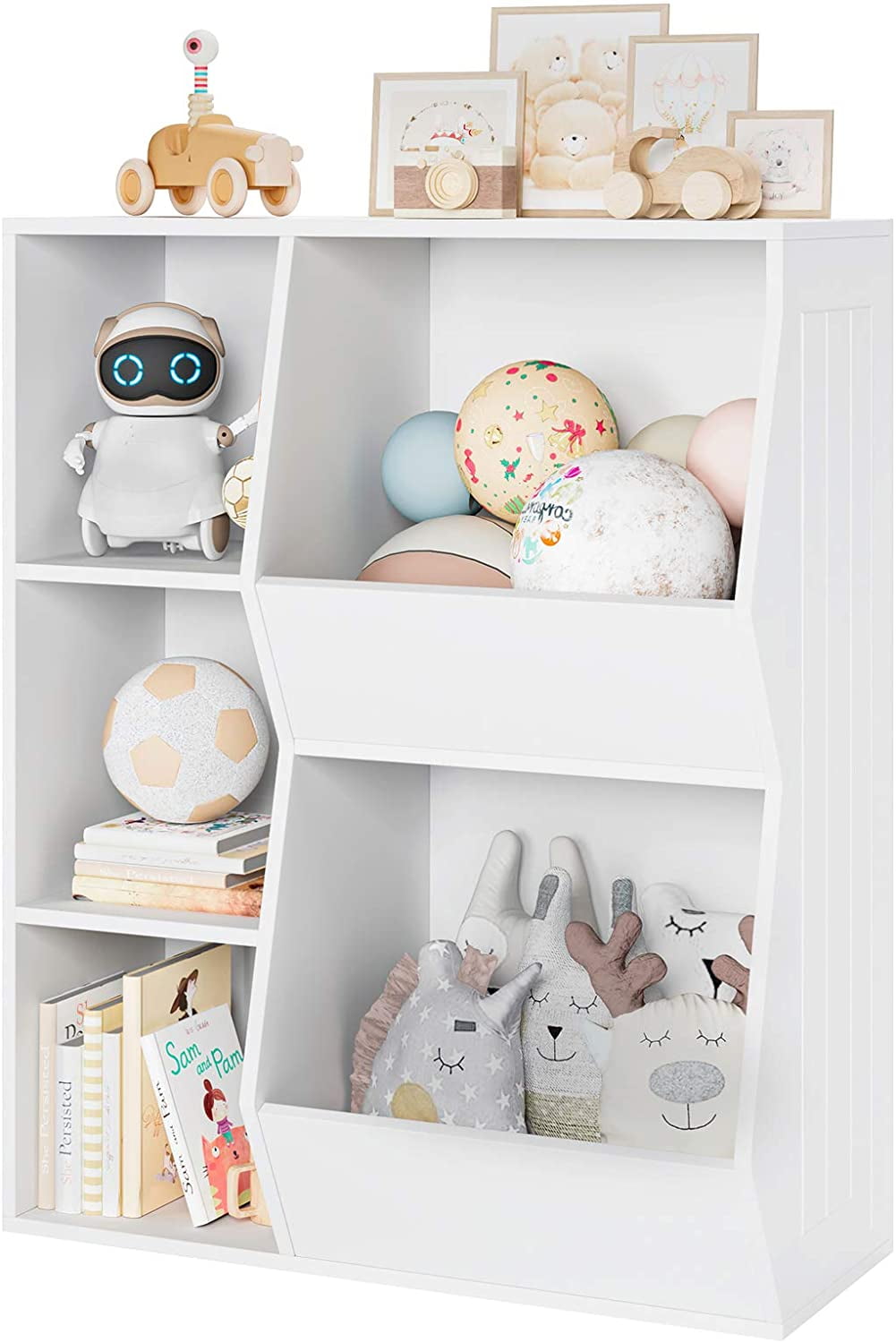 Features: 【Multifunctional Toy Cabinet】 Children’s toy cabinets, storage cabinets, and bookcases are designed with 5 large compartments, equipped with 3 bookcases and 2 large boxes, which can help you organize different types of items such as plush toys, books, footballs or backpacks. In addition,you can display souvenirs and photo albums on the top of the cabinet. 【Storage Function】This children’s bookcase is a great tool for children of all ages, teaching them how to organize their own things and clean up the items in the play area. 【Environmental Material】The white toy storage cabinet is made of durable and environmentally friendly artificial wood with an environmentally friendly white paint surface, which is strong, scratch-resistant and easy to clean. The product is durable and child-friendly. The height of this children’s storage box is suitable for children to reach easily. 【Multiple Occasions】From the living room to the bedroom to the children’s room in the home office, the modern simplicity and appearance make this cabinet easy to integrate into any room. 【Safety Design】For safety, an anti-dumping device is installed in the cabinet. This is the best gift to accompany your child! 【Easy Assembly】All parts are numbered and detailed assembly instruction is provided, you can finish the assembly within 1 hour. 【24/7 Customer Service】We provide quality customer support, if you have any questions, please email us and we will reply within 24 hours. Specifactions: Size: 30.1*10.8*36.6in Color: White Material: MDF Overall Product Weight: 35.6 lb. Package Including: 1 x Toy Storage Cabinet 1 x Accessory kit 1 x Instruction
