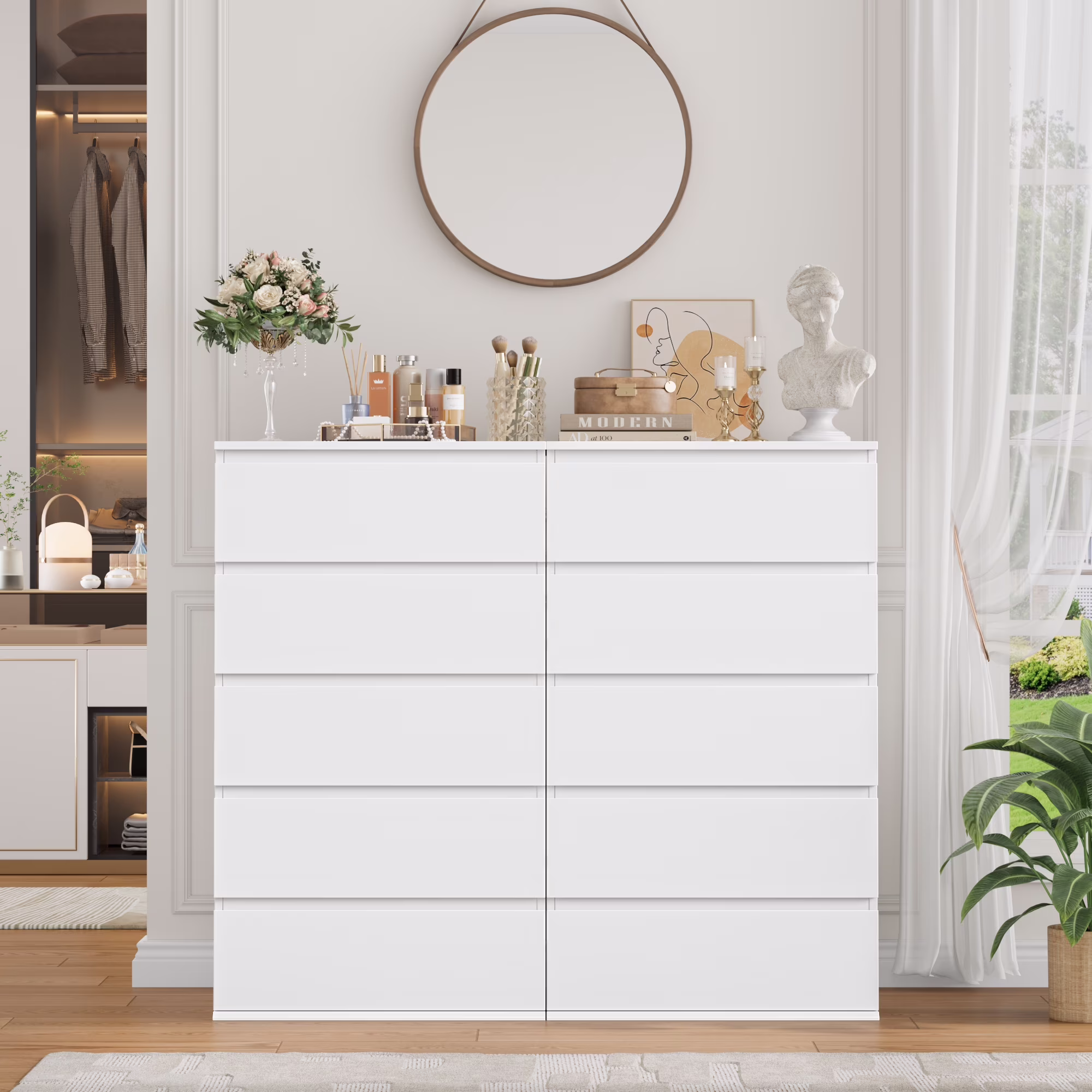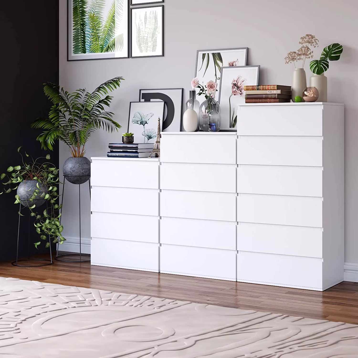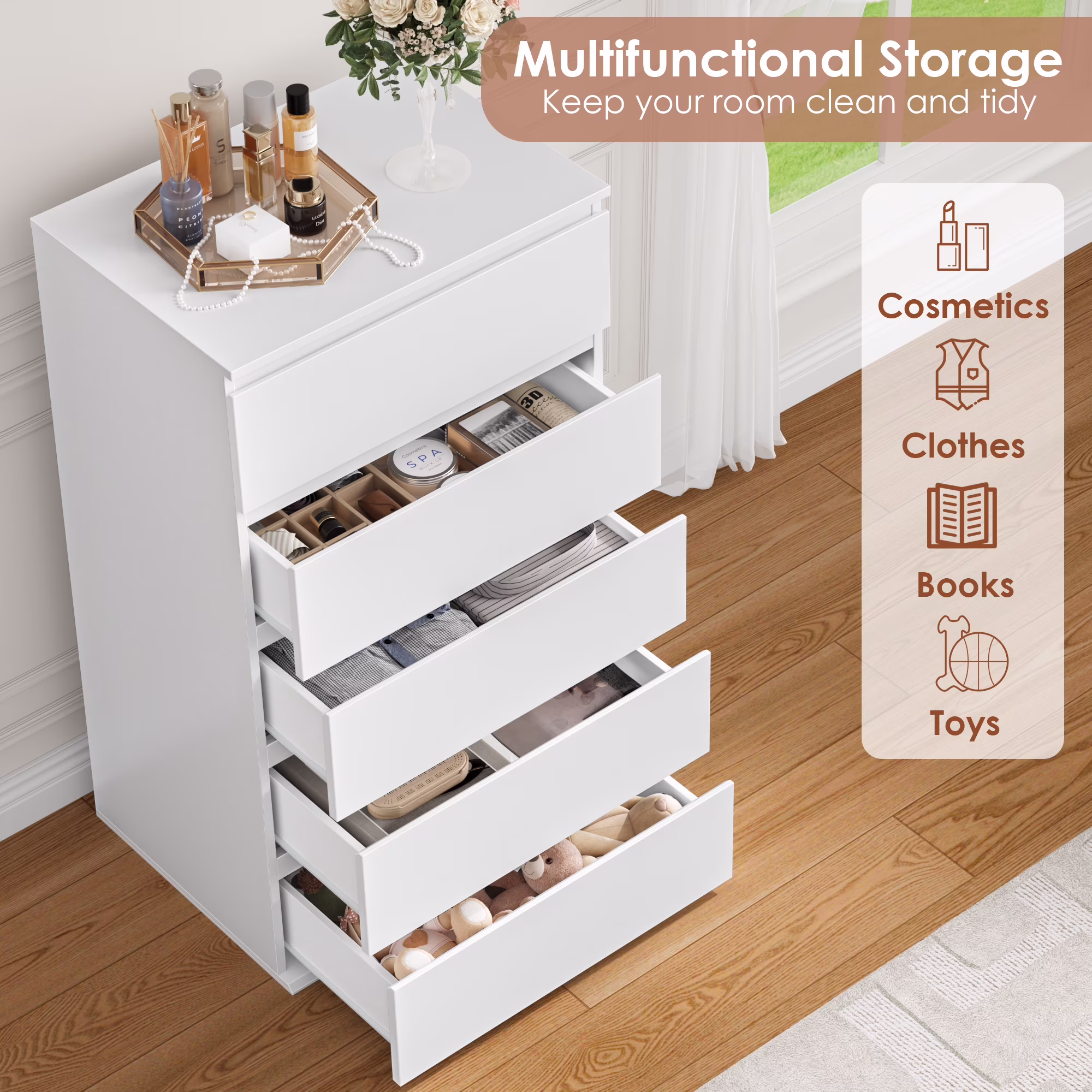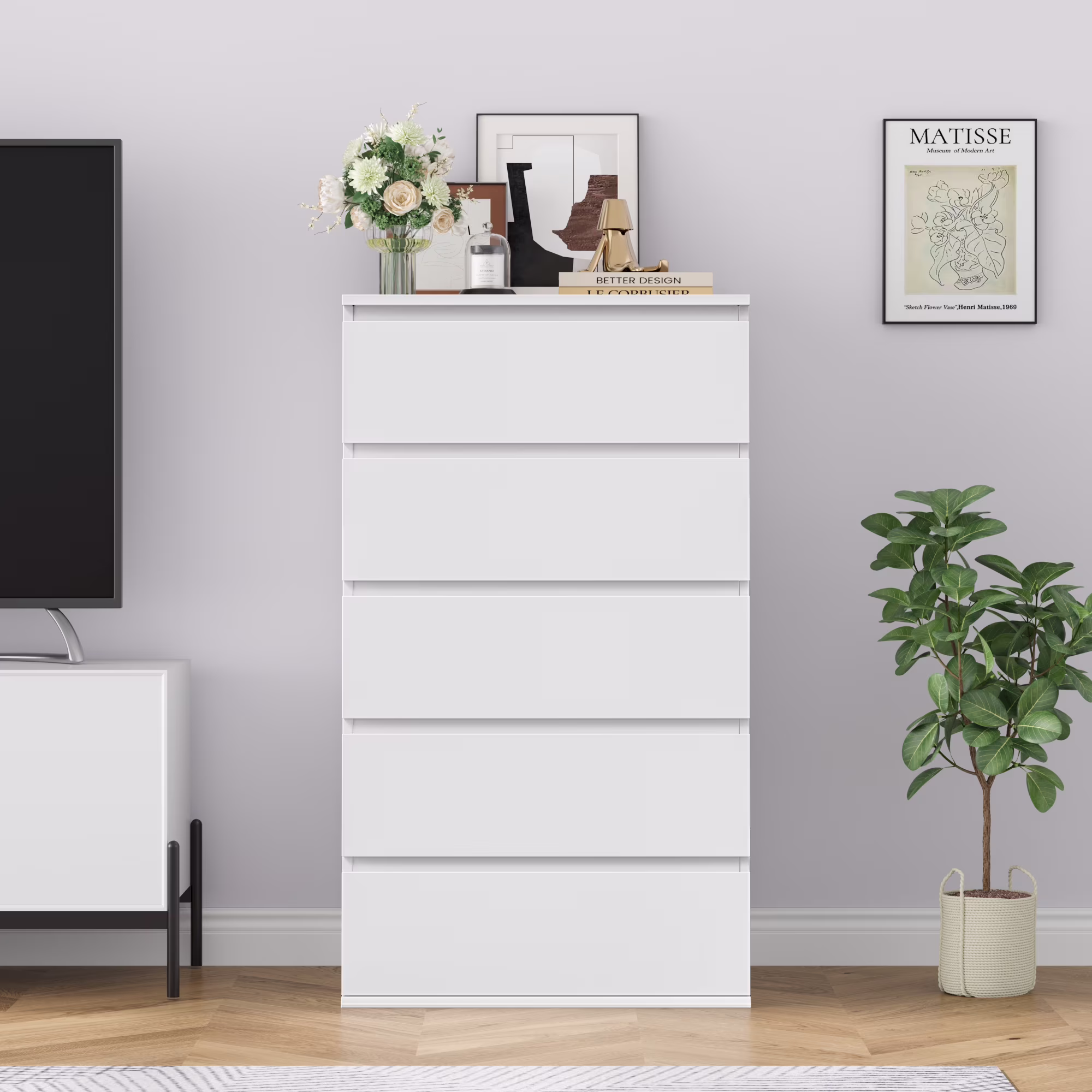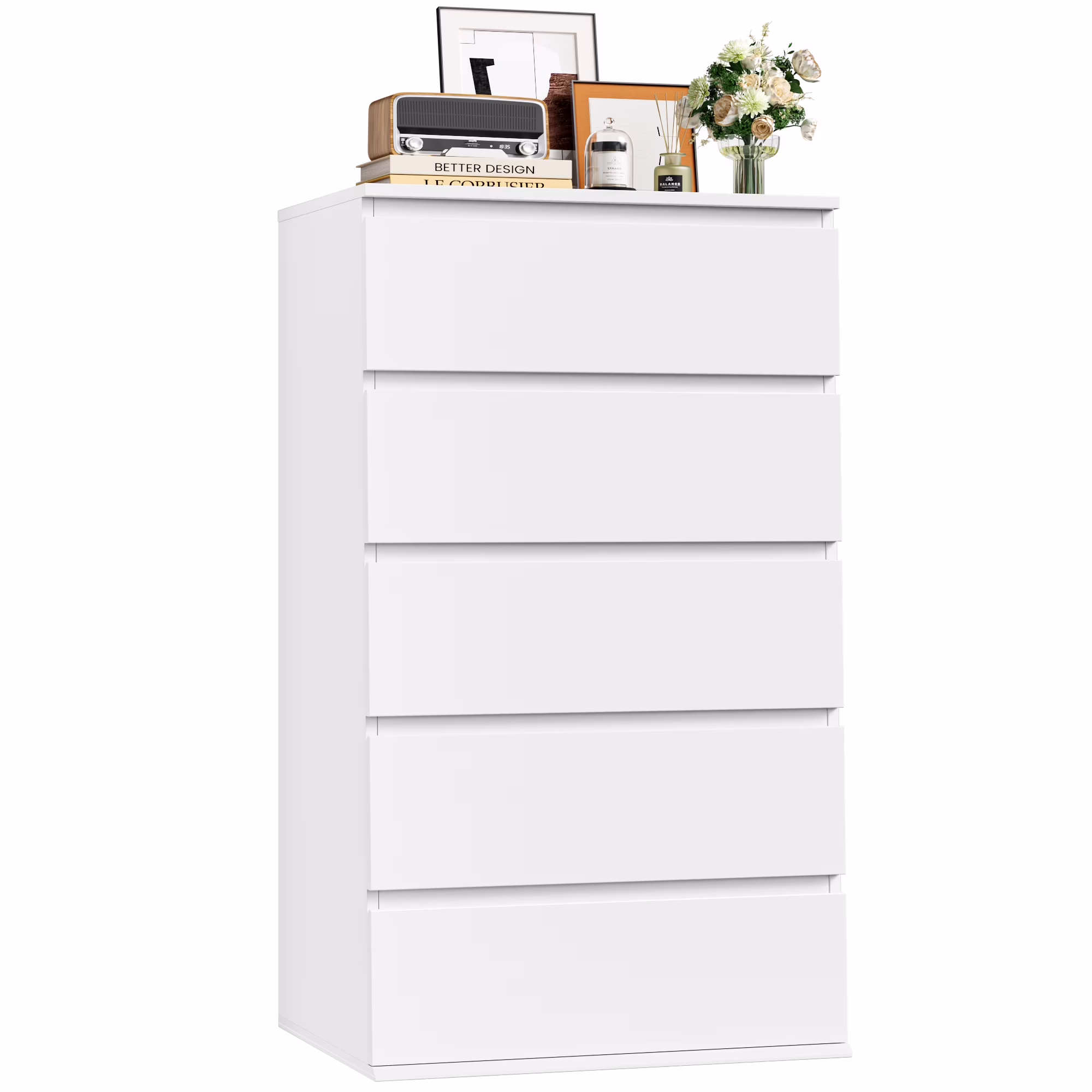 Features: 【5 Spacious Drawers for Versatile Storage】With 5 roomy drawers—each equipped with 2 smooth-glide metal rails for effortless opening and closing—this handle-free tall dresser keeps clothes, jewelry, cosmetics, and more neatly tucked away. The sleek, minimalist design (no bulky handles!) maximizes organization while the expansive wooden top offers prime space for photo albums, collectibles, or decor. The chest of drawers is perfect for bedrooms, living rooms, home offices, or entryways—wherever you need stylish storage! 【Elegant Modern Aesthetic】The crisp white finish and clean, contemporary lines of this multi-functional bedroom storage dresser blend seamlessly with any decor. Its timeless look elevates your space while staying subtly sophisticated. 【Durable MDF Construction】Crafted from premium MDF (medium-density fiberboard)—stronger and more warp-resistant than solid wood—this tall dresser for bedroom stands up to daily use. The water-resistant painted surface wipes clean in seconds with just a damp cloth, making maintenance a breeze. 【Safe & Stable Design】A trapezoidal side structure adds natural stability, while the included anti-tip safety kit lets you securely anchor it to the wall—essential for homes with kids or pets. No wobbles, no worries—just peace of mind. 【Easy Assembly】All parts are numbered and detailed assembly instruction is provided, you can finish the homfa white dresser’s assembly within 1 hour by 2 adults. 【24/7 Customer Service】We provide quality customer support, if you have any questions, please email us and we will reply within 24 hours. Specifications: Color: White Material: MDF Overall size: 23.6*17.5*46.7in Drawer size: 12.8*20.4**4.5in Number of drawers: 5 Assembly required: Yes Package Contents: 1 x 5-Drawer White Dresser 1 x Assembly Kit 1 x Instruction