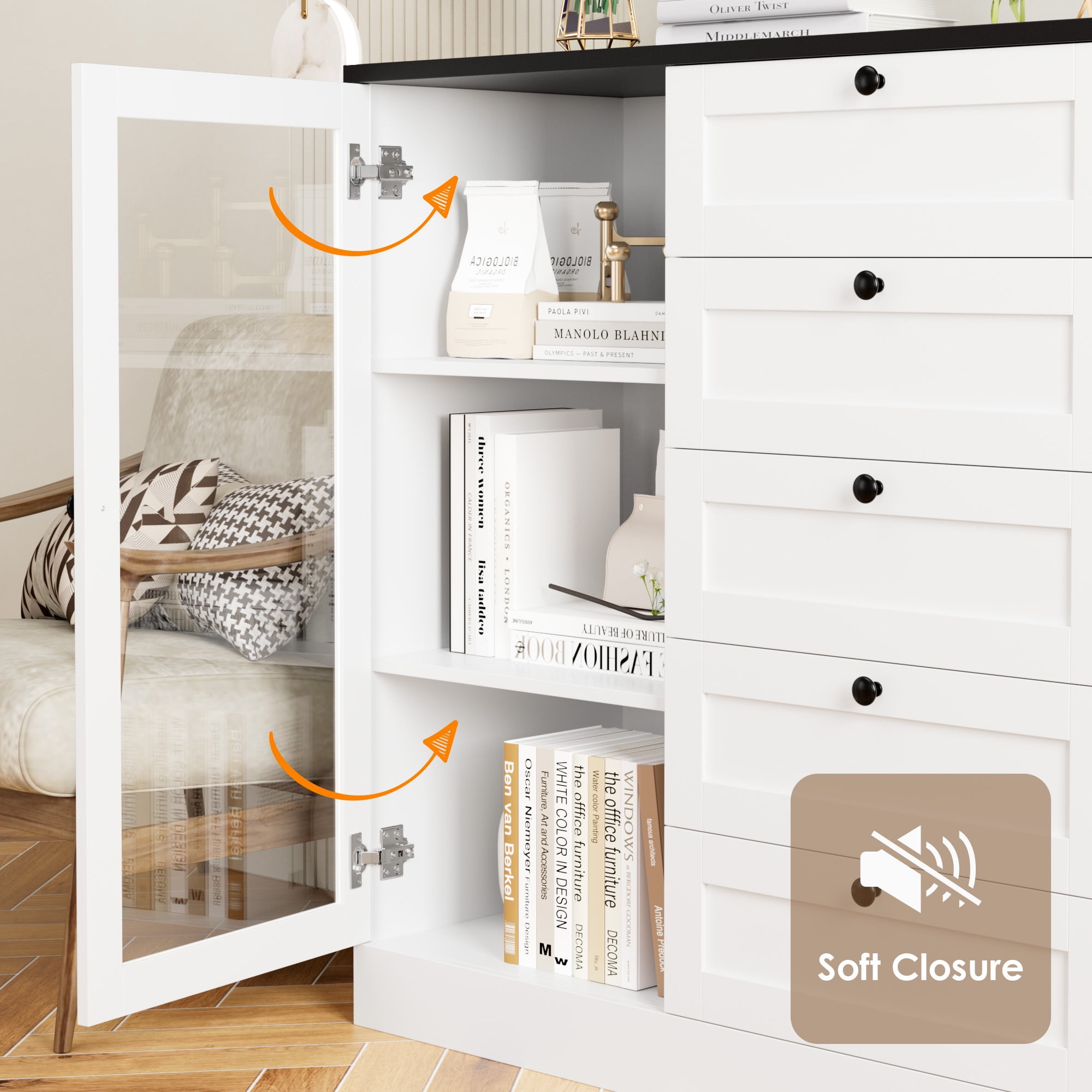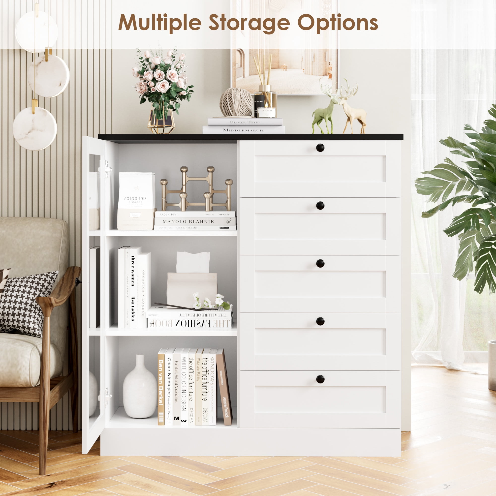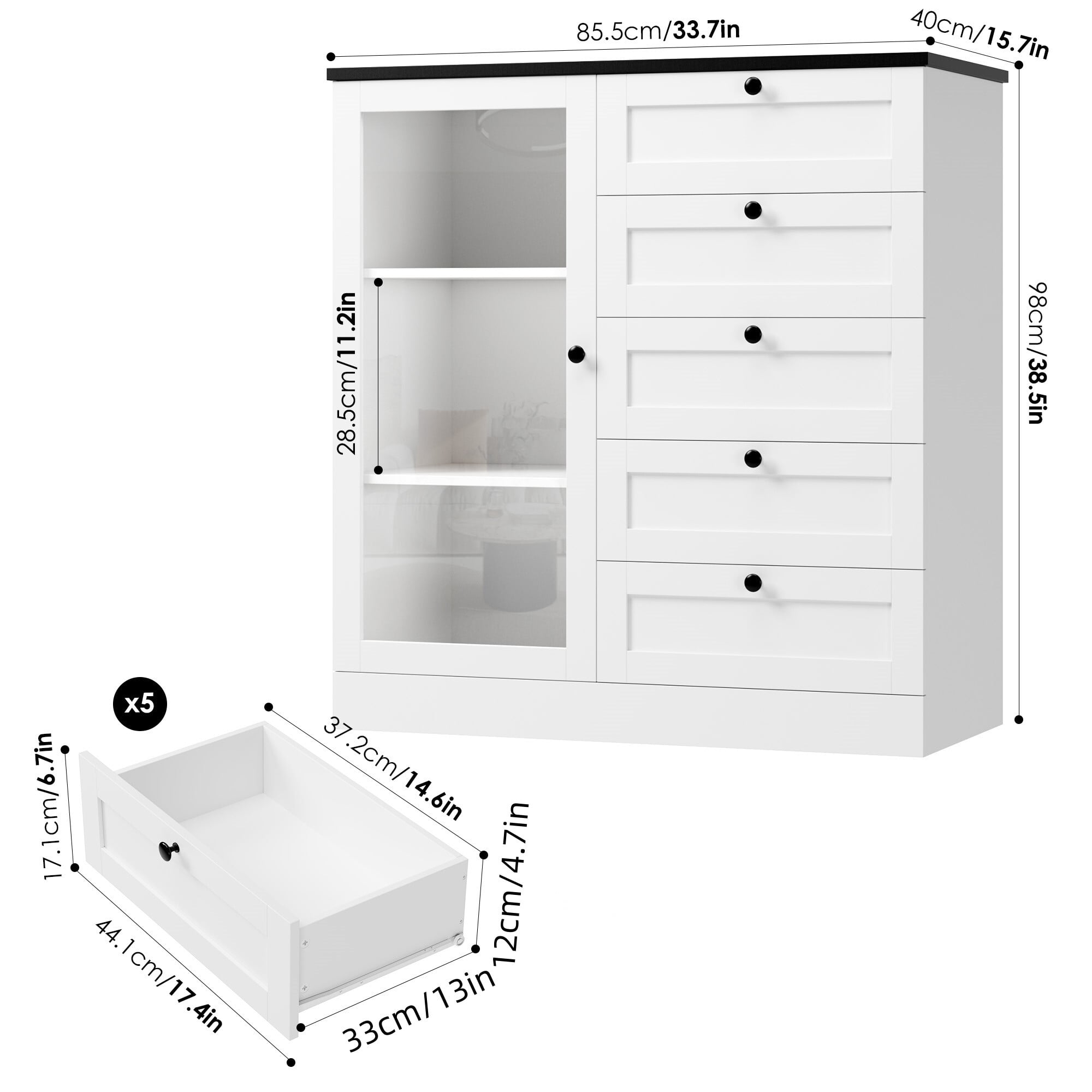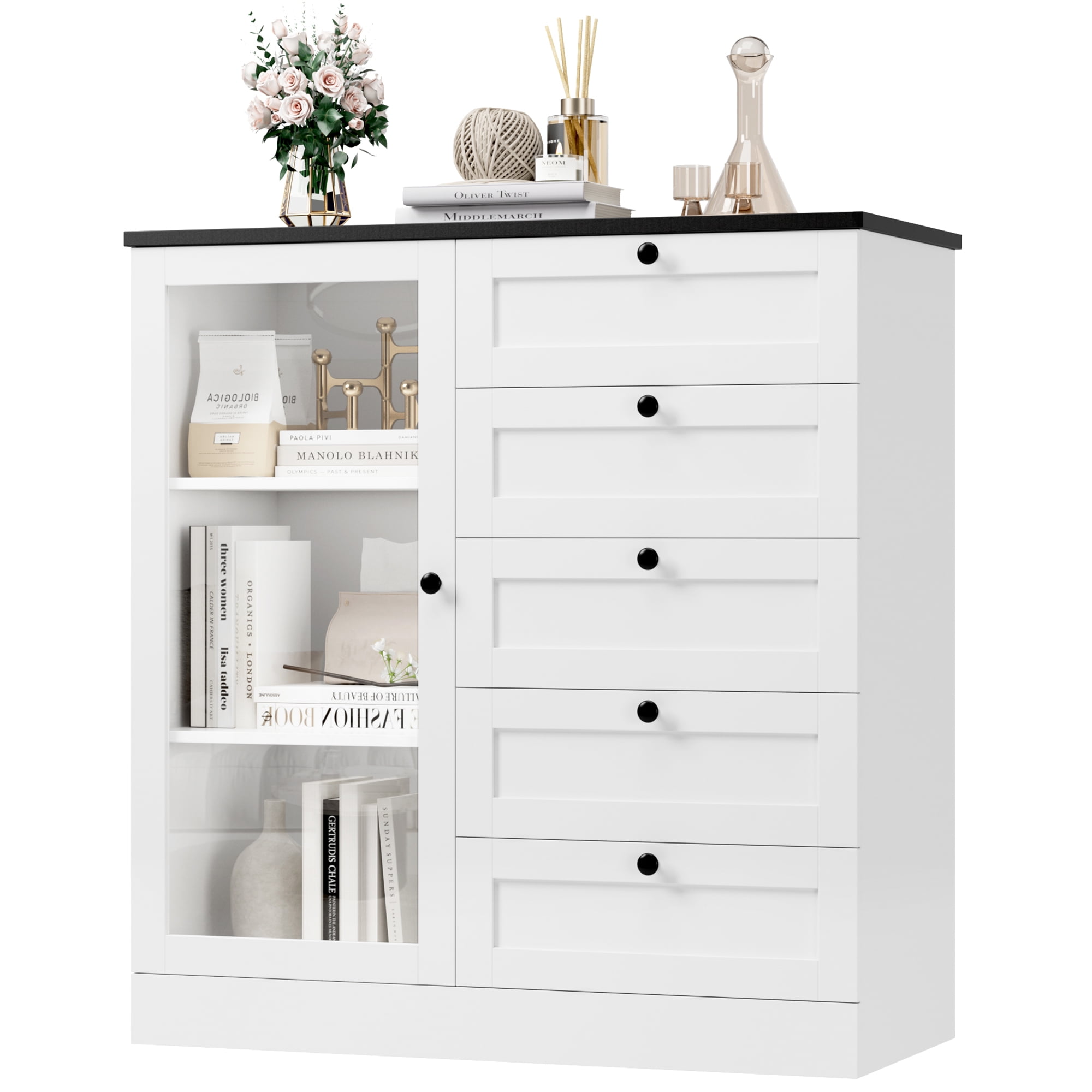 Homfa 5 Drawer White Dresser with Glass Door, Modern Wood Chest of Drawers for Bedroom Living Room Hallway
