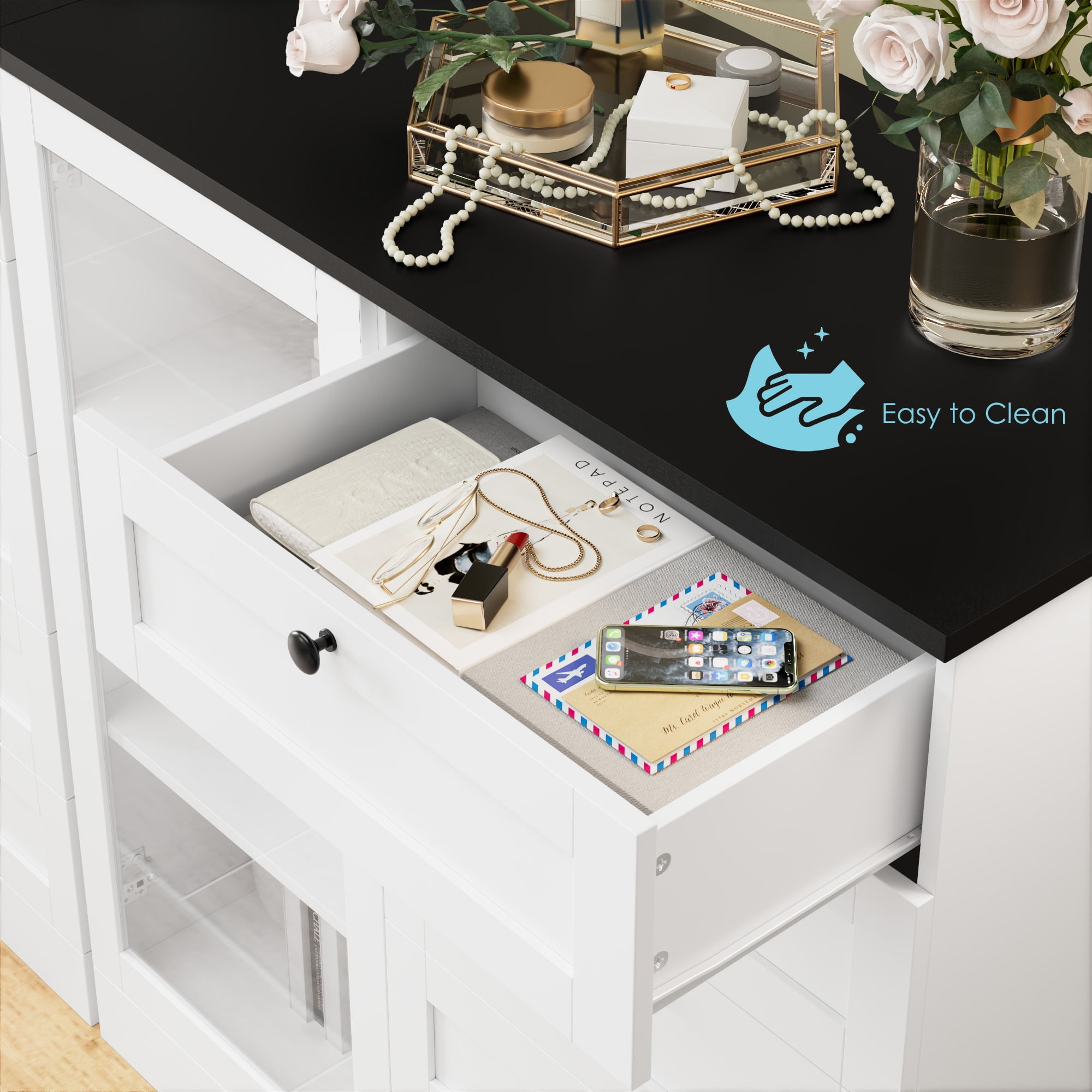 Features: 【5 Drawer Dresser with Cabinet】5 large drawers and 1 cabinet provide ample storage space. The white storage cabinet is suitable for different flexible storage purposes. 【Space Saving】The modern chest of drawer is suitable for small space apartments and small rooms; Overall size: 33.7*15.7*38.4inches. 【Transparent Glass Door】The white storage cabinet’s transparent glass door not only adds a modern look,but makes it easy to identify and take items. It is suitable for bedroom, living room etc. 【Sturdy & Durable】This white dresser features a quality wood frame and smooth metal rails. In addition, the top can hold up to 275 pounds and each drawer can hold up to 55 pounds. It can be used for a long time. 【Modern Style】Classic white color combined with glass door, this bedroom dresser perfectly reflects the elegant modern style and farmhouse taste. Adding a clean and tidy look to your living space while complementing your home decor. 【Easy to Assemble】This modern bedroom chest of drawers comes with clear step-by-step instructions. You can assemble it in 1 hour and get a modern dresser with door! 【24/7 Customer Service】We provide excellent customer support, if you have any questions, please email us and we will reply within 24 hours. Specifications: Material: Manufactured Wood Color: White Product size: 33.7*15.7*38.4in Drawer size: 13*14.6*4.7in Overall Product Weight: 95.68 lb. Number of Drawers: 5 Drawer Glide Mechanism: Roller Glides Package Contents: 1x 5 Drawer Dresser 1 x Assembly Kit 1 x Instruction
