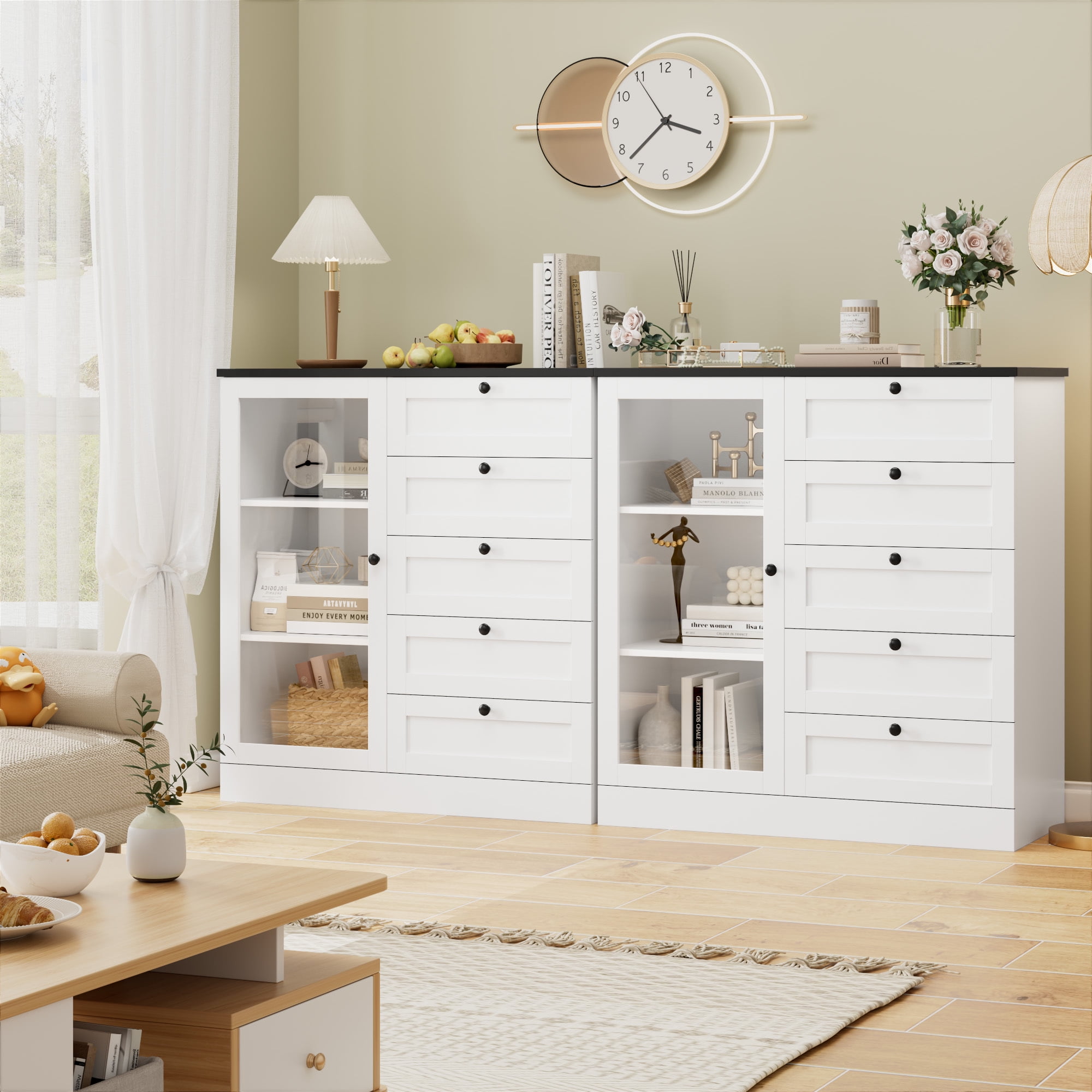 Homfa – Create a comfortable life! Still struggling with a cluttered and unorganized room? This modern dresser with glass door is a versatile option with a vertical design that can fit into a bedroom, living room, entry way or dining room as a dresser, feature cabinet.Elegant white finish and the glass door design add a sense of fashion to your room. The dresser for bedroom on the left contains 3 storage shelves and the 5 spacious drawers on the right open and close on smooth metal glides. Can be used to store personal daily items. The tabletop of this white dresser is perfect for displaying photos,books, ornaments, table lamps and more. In addition, the glass door design makes it easy to identify and take items. It won’t take up too much space but keeps the room tidy. What’s more, it’s perfect for maximizing your storage space and creating a coordinated look with single or multiple side-by-side placements.The modern chest of drawers is made of high quality engineered wood and premium smooth gliding metal slides for excellent stability and durability.