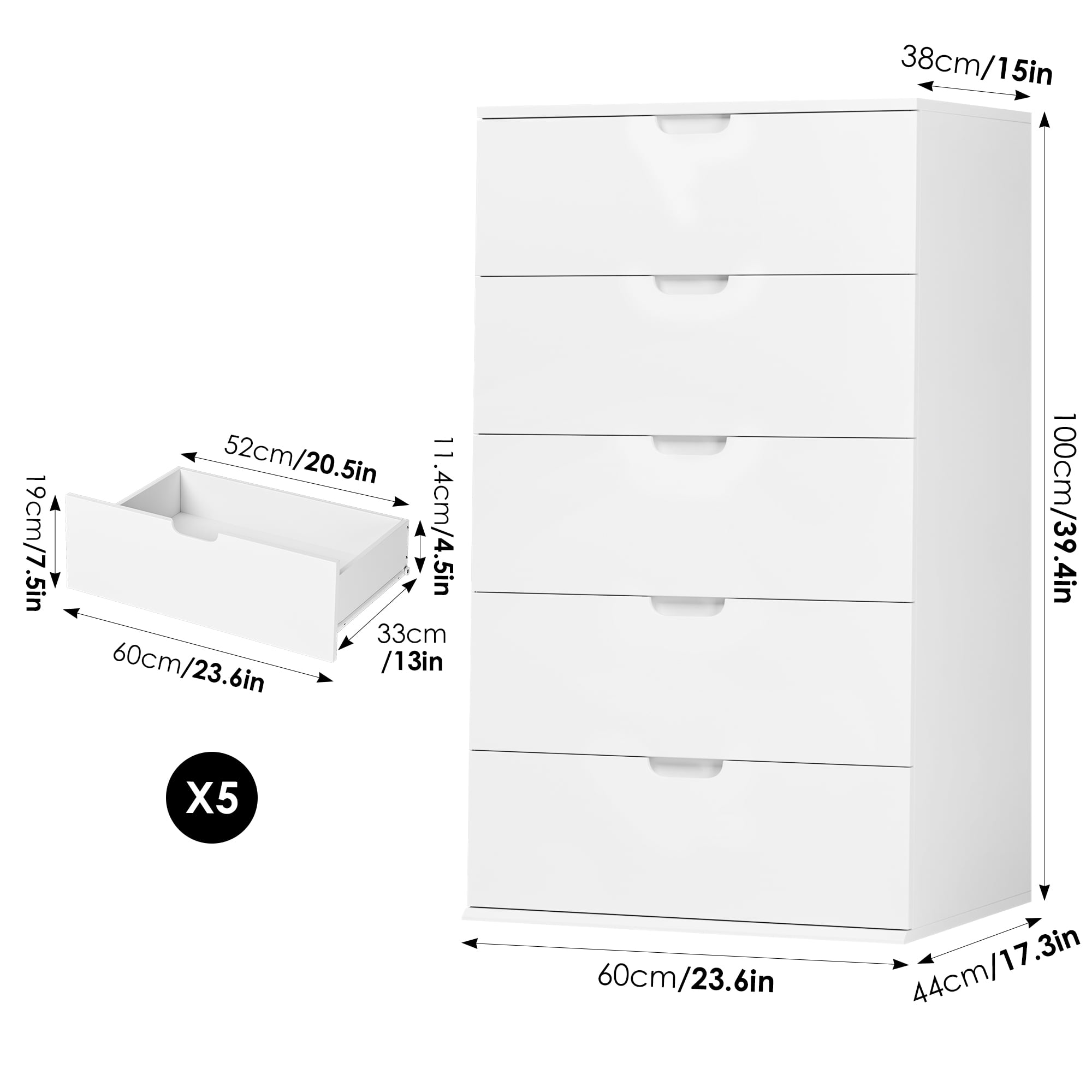 Features 【Modern Style】Minimalist, beautiful, and functional chest of drawers. 【Wide Surface Area】 23.6″ x 17.3″ x 39.4 (L x W x H). The dresser’s spacious storage space can be used as a display table for your favorite decorations. It is large enough to accommodate everyday items, greenery, small storage baskets, etc. 【Drawer Storage】The white dresser sideboard has 5 large-capacity drawers to provide you with powerful storage, streamline your storage space, and conveniently store various household items. 【Sturdy Materials】 Made from select wood panels, this dresser chest is sturdy, durable and visually appealing with a white, water-resistant finish. The drawers’ metal glides ensure smooth opening and closing. 【Easy to Assemble】This white dresser includes detailed instructions and all needed parts. If you have any questions, please feel free to contact us. Specifications Material: MDF Color: White Overall: 23.6″ L x 17.3″ W x 39.4″ H Drawer Interior: 20.5” L x 13″ W x 4.5” H Drawer Weight Capacity: 22 lbs Number of Drawers: 5 Package Contents 1 x White Dresser 1 x Accessory Kit 1 x Instructions Manual