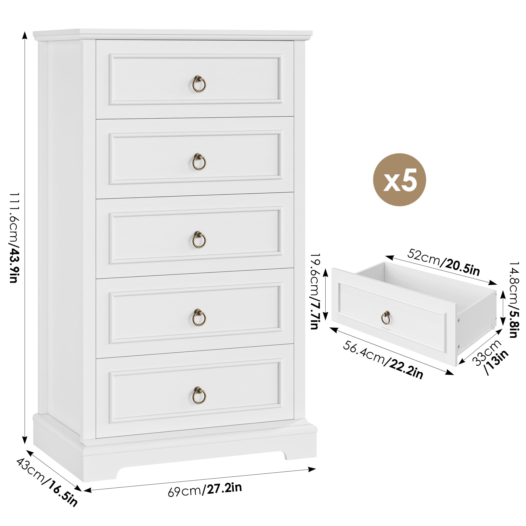 Features: 【5 Large Drawers】5 wide drawers provide plenty of space for sorting and organizing toys, books, documents and other daily necessities. 【Sturdy & Durable】Our storage cabinet is designed with sturdy wooden frame and the back crossbar makes the drawer nightstand stable and durable. The drawer surface is smooth enough and, it is easy to clean. 【Modern Appearance】Clean line design, pure white appearance with brass-colored knobs, this tall dresser is the perfect decoration for your bedroom and living room space. 【Round Ring Pulls】The 5 drawer dresser beautifully round ring pulls make the 5 drawers easy to open, and the pulls can be changed at will. 【Anti-tipping Device】The dresser with drawers comes with an anti-tip device on the back, so you don’t have to worry about the dresser falling and hitting your families anymore! 【4 High Feet】Not only look unique, but also easy to clean the bottom of the cabinet. 【Easy to Assemble】Detailed assembly instructions and labels allow you to have a beautiful wooden decorative cabinet in less than 1 hour. 【24/7 Customer Service】We provide excellent customer service, if you have any questions, please email us and we will reply within 24 hours. Specifications: Material: Manufactured wood;metal Drawer Glide Material: Metal Handle Material: Metal Color: White Overall Size:26.8*15.6*44.1inches Drawer Inner Size: 20.5*13*5.8inches Overall Product Weight: 91.07 lb Number of Drawers: 5 Drawer Glide Mechanism: Roller glides Package Contents: 1 x 5 Drawer Dresser 1 x Accessory Kit 1 x Instruction