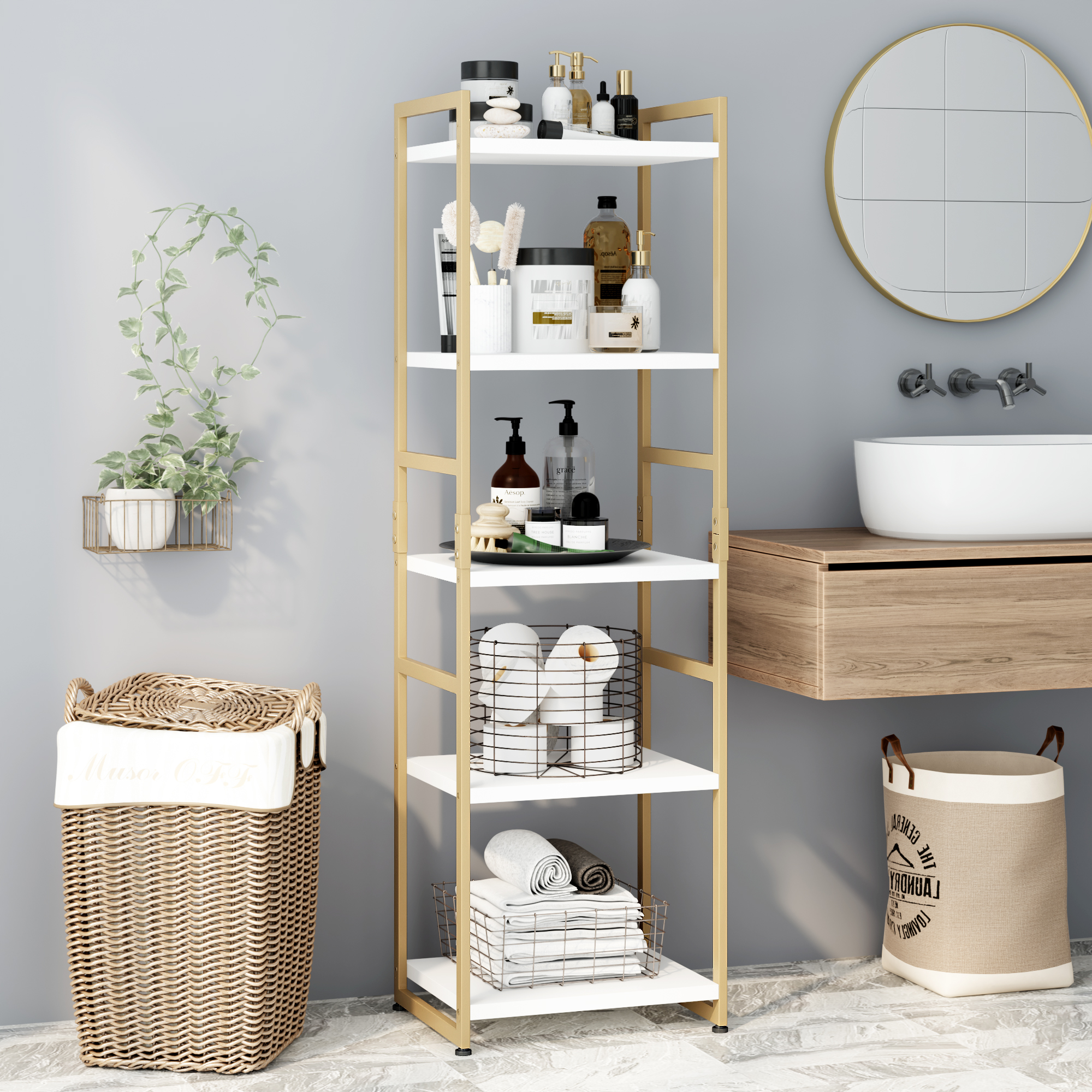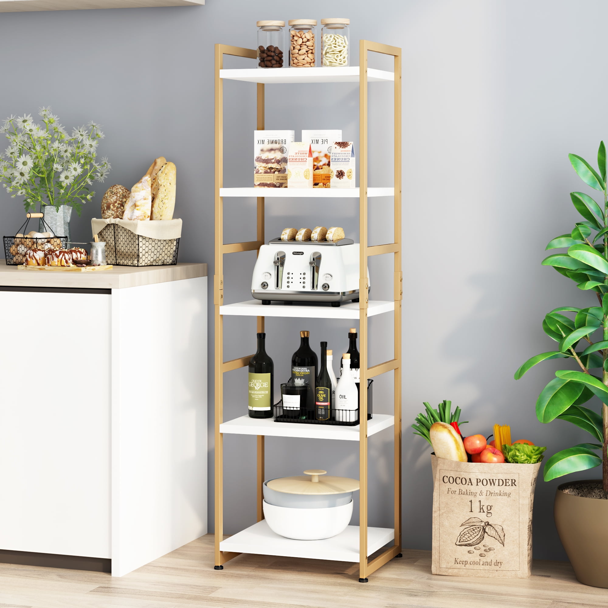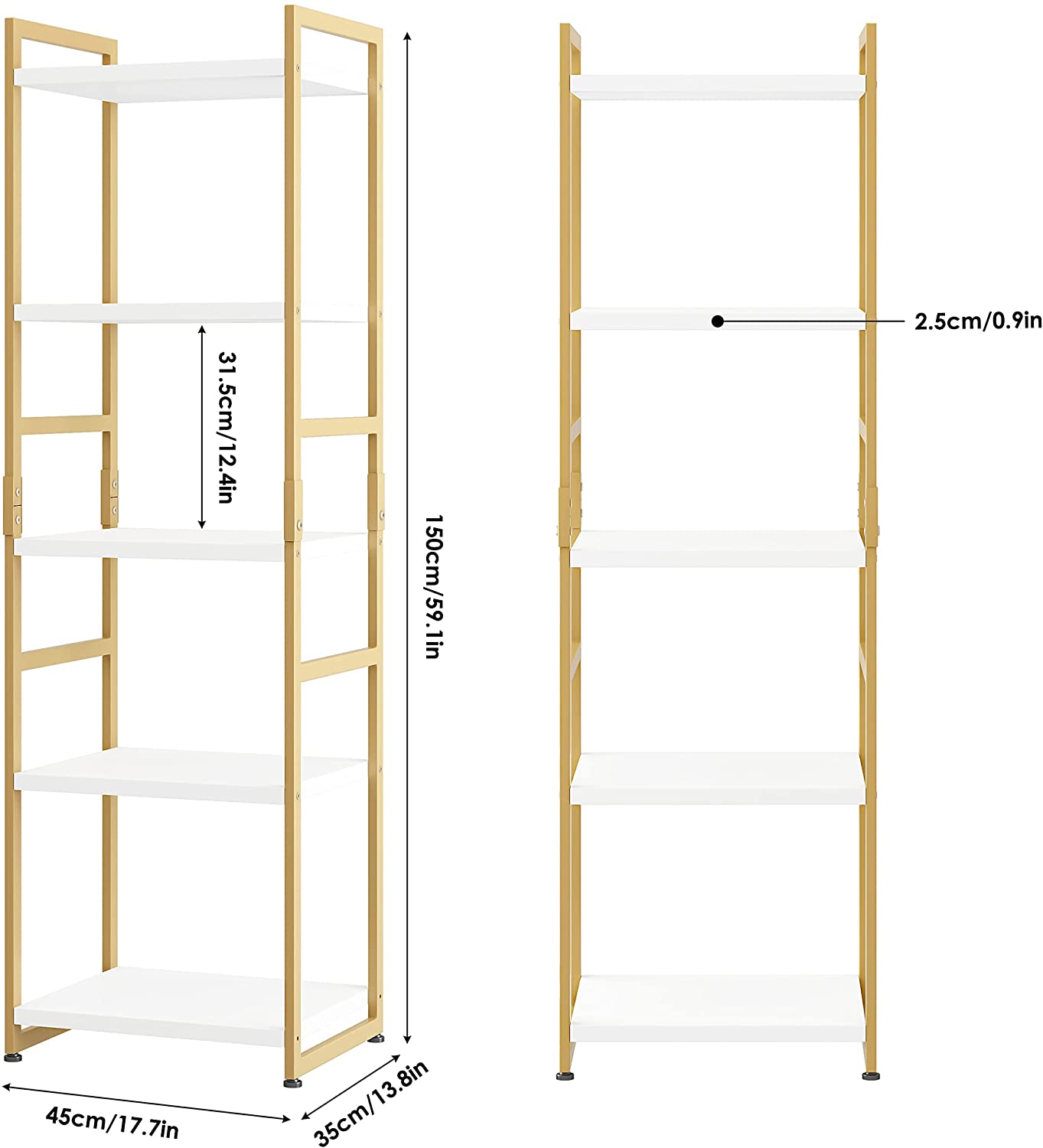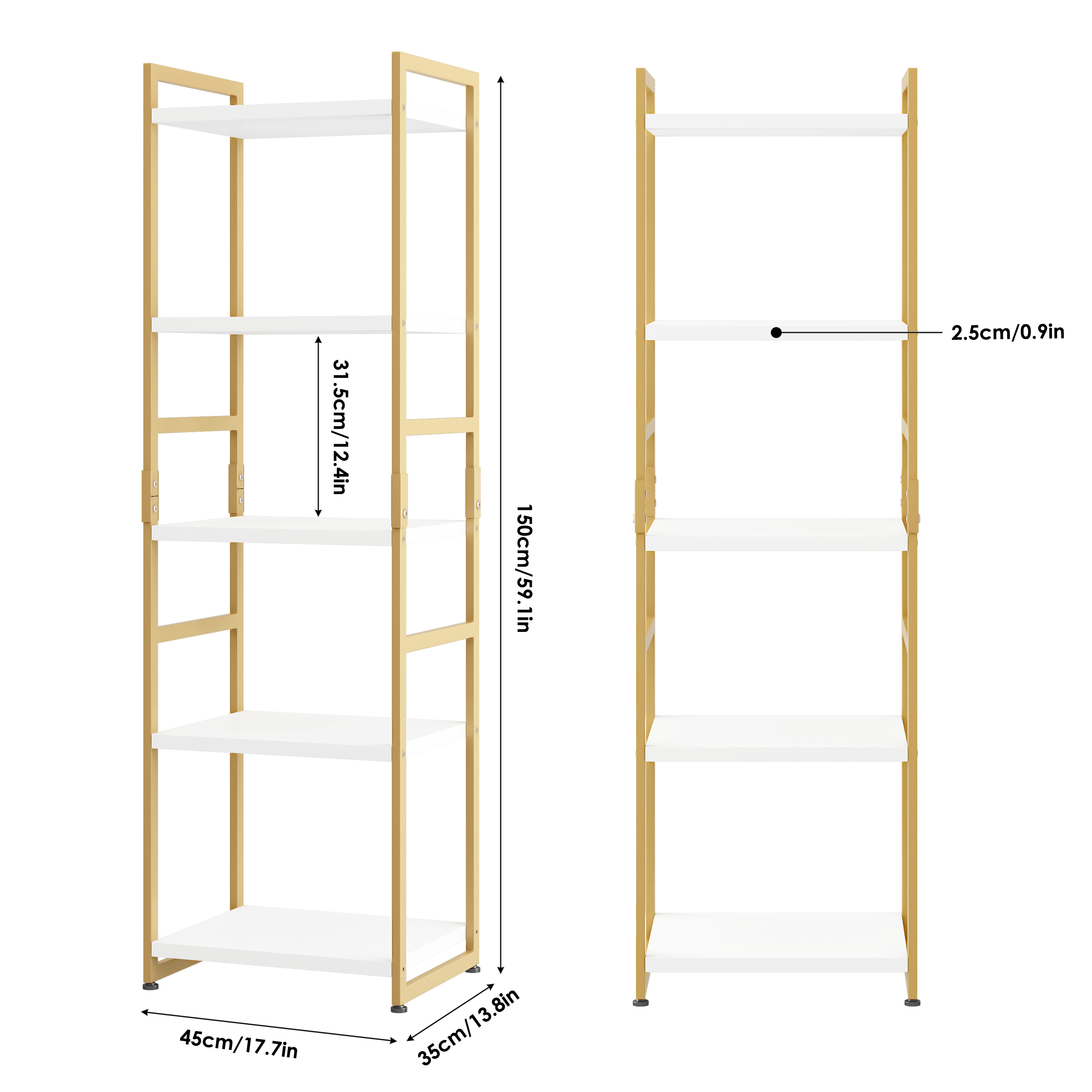 Homfa 5 Tier Gold and White Bookshelf, Tall Freestanding Storage Shelf with Metal Frame for Living Room