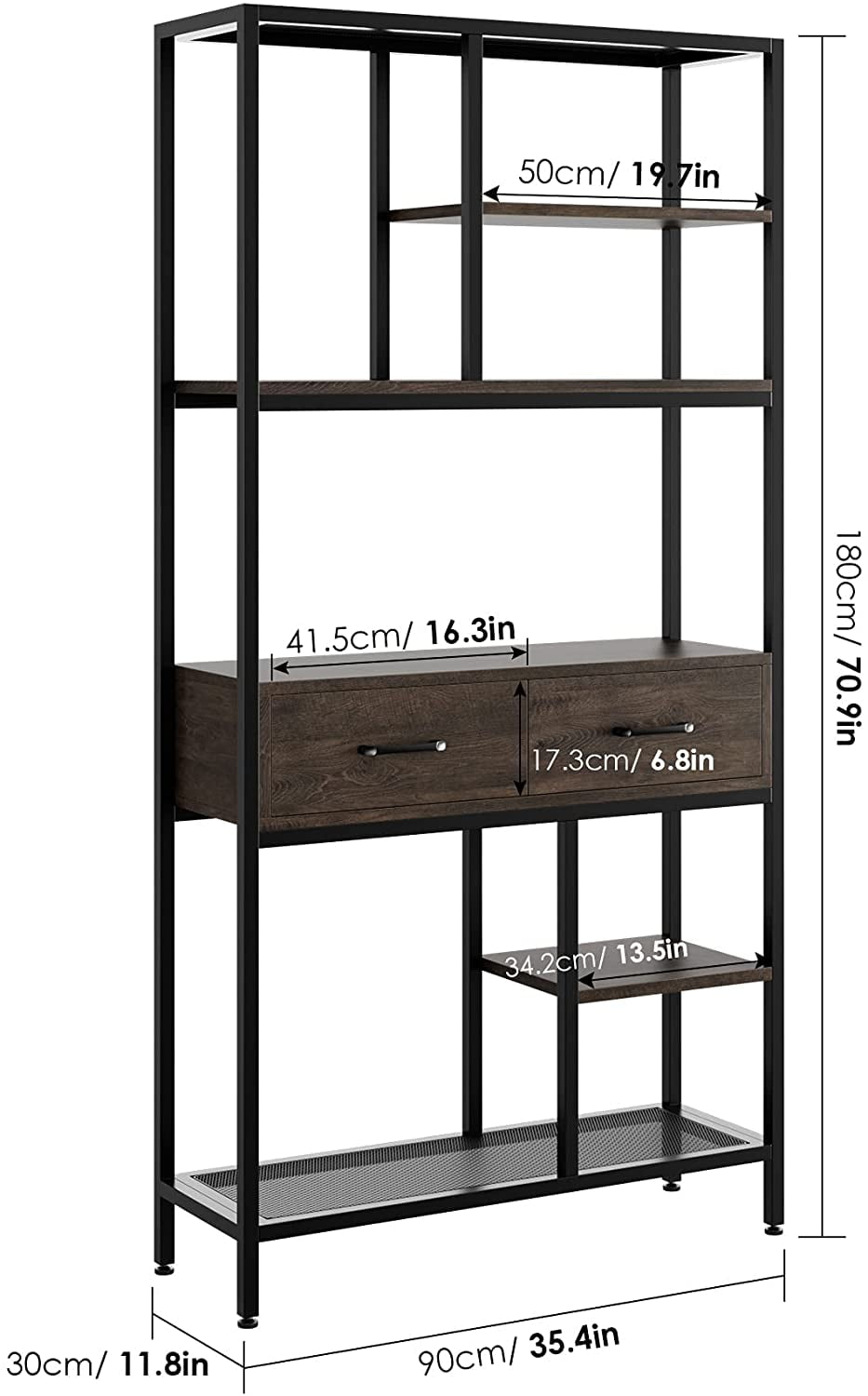 Features: 【Abundant Storage Space】With geometric open shelves and wooden drawers, this tall bookshelf not only maximizes vertical storage space to help you organize books or other decorations, but also brings enclosed space to keep your important documents 【Multifunctional Shelving Unit】Whether you are looking for a bookcase for your office, a room divider in the living room, or a display shelf on the balcony to arrange your plants nicely, this bookcase is any must-have piece of furniture in your home 【Strong and Durable】Made of high-grade faux wood and metal frame, this iron bookcase with drawers has excellent load bearing and incredible durability for long-term use. 【Safety Design】With the help of the anti-tipping kit, the freee standing bookshelf can be fixed to the wall for added safety 【Industrial Style】The elegant industiral look gives this bookshelf a touch of industrial charm and some retro warmth, and it goes well with any existing home decor scheme. 【Easy to Assemble】This bookcase with drawers comes with numbered parts and step-by-step instructions for easy assembly. If you have any questions before or after your purchase, please feel free to contact us, we will reply as soon as possible within 24 hours Specifications: Color: Dark brown Material: Manufactured Wood Overall: 70.9” H x 35.4” W x 11.8” D Shelf: 35.4” W x 11.8” D Overall Product Weight: 56.4 lb. Drawer Interior: 6.8” H x 16.3” W x 9.41” D Package Contents: 1 x Iron Bookcase 1 x Accessory 1 x Instruction Warm note: We provide high-quality after-sales service, any questions, please send us an email, we will reply within 24h