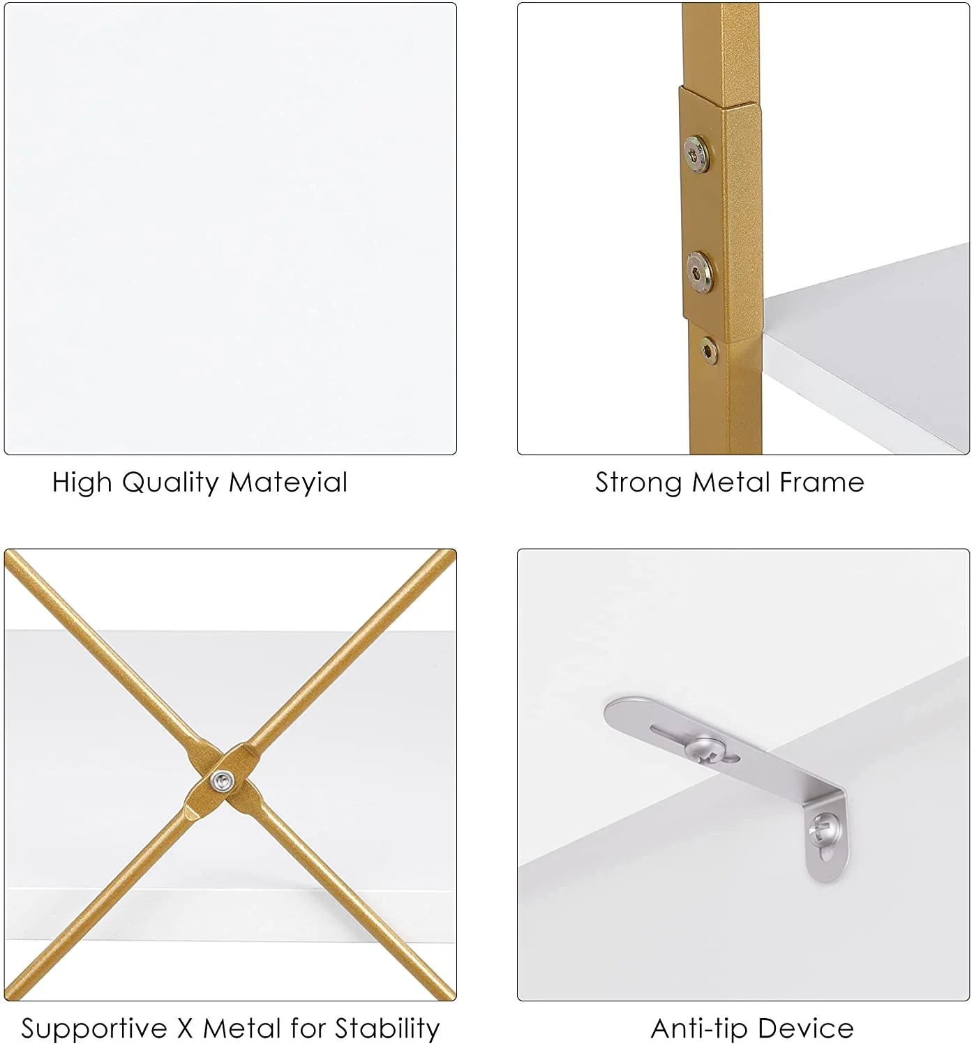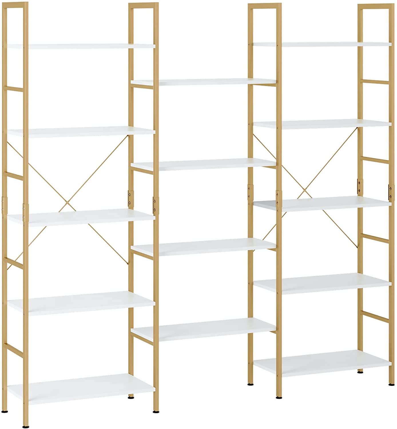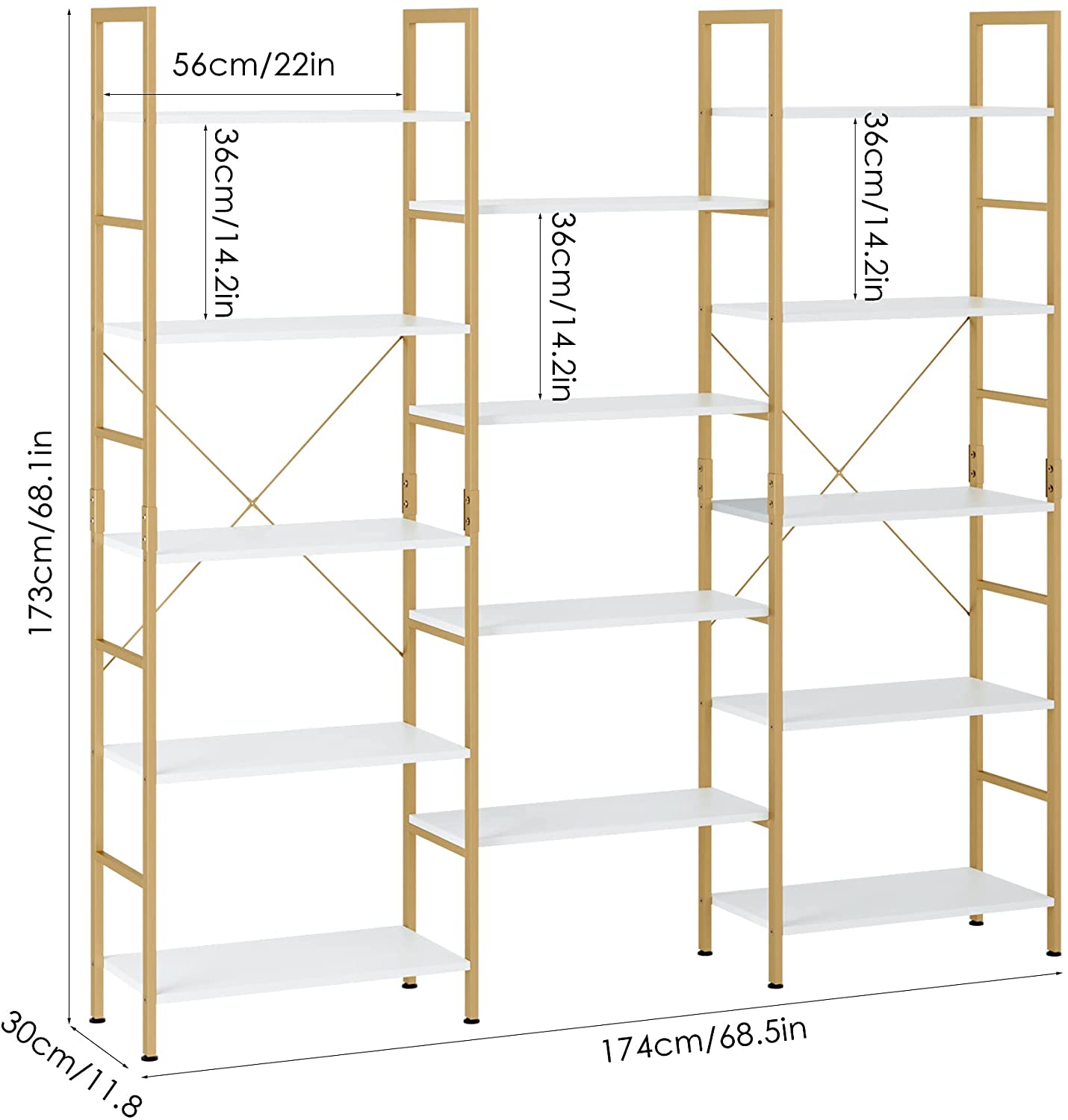 Features: 【Ample Storage Space】Our 5-Tier triple-wide book shelf features with 14 open shelves, this tall display shelf can maximize the vertical storage space while keep your daily essentials in organize. No need to buy two more traditional separate ladder shelf. 【Not Just a Bookshelf】This bookcase and bookshelf is an ideal accent furniture for your living room, bed room, office, indoor garden, etc. Create a peace corner only for you. It can meet all your needs for displaying your books, plants, sundries, photos, collections, magazines, toys and and small items you love. 【Modern White Gold Shelf】Seamlessly blends modern stylish gold metal elements with a white shelf look, triple wide 5-tier book storage shelves is quiet stylish, exquisite. 【Stable & Durable】Sturdy gold coated iron frame with extra back bars as well as anti-tipping fittings for a better stability and resistance. So you don’t need to worry about the tall bookshelf will fall down.And high quality particle board makes this well built contemporary decorative plant stand durable. 【Easy Assembly】All parts are numbered and detailed assembly instruction is provided, you can finish the book organizer’s assembly within 1 hour by 2 people. 【24/7 Customer Service】We provide quality customer support, if you have any questions, please email us and we will reply within 24 hours. Specification: Material: Wood, iron Color: White gold Size: 68.5*11.8*68.1in Each shelf bears 22-33 lbs (10-15 kg) Overall Product Weight: 65.03lb. Number of shelves: 14 Assembly required: Yes Package Contents: 1 x Triple Wide 5-Tier Bookshelf 1 x Accessory Kit 1 x Instruction