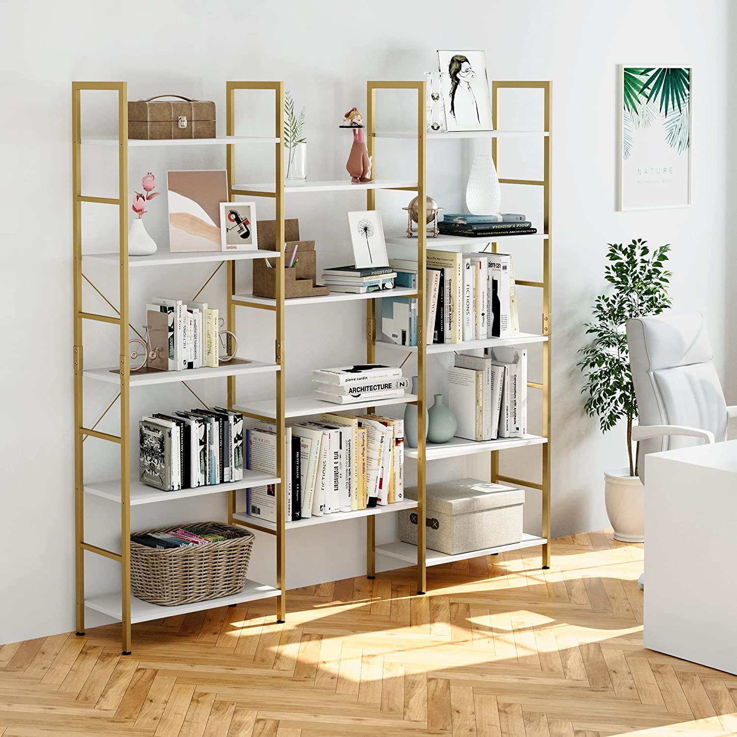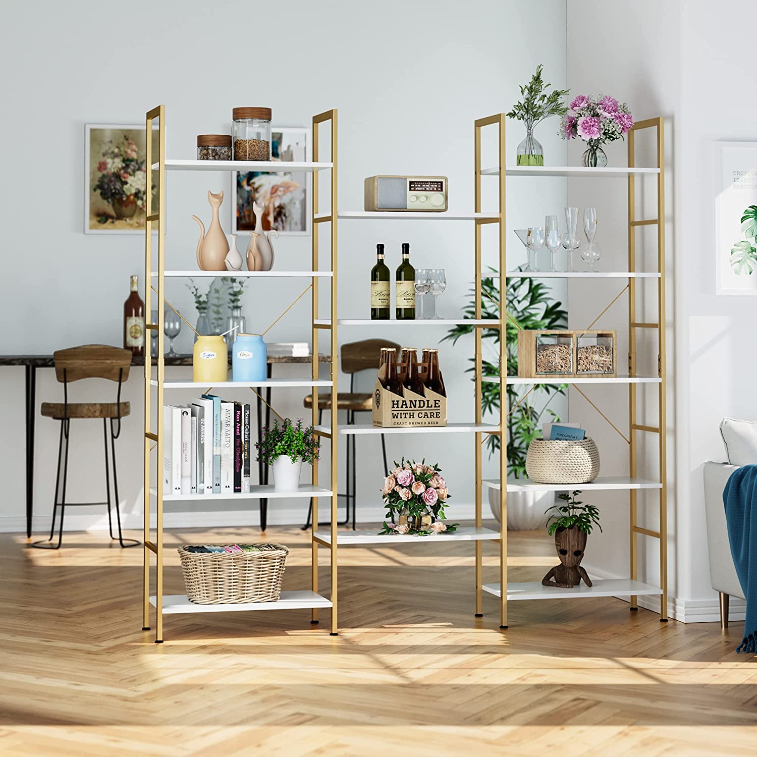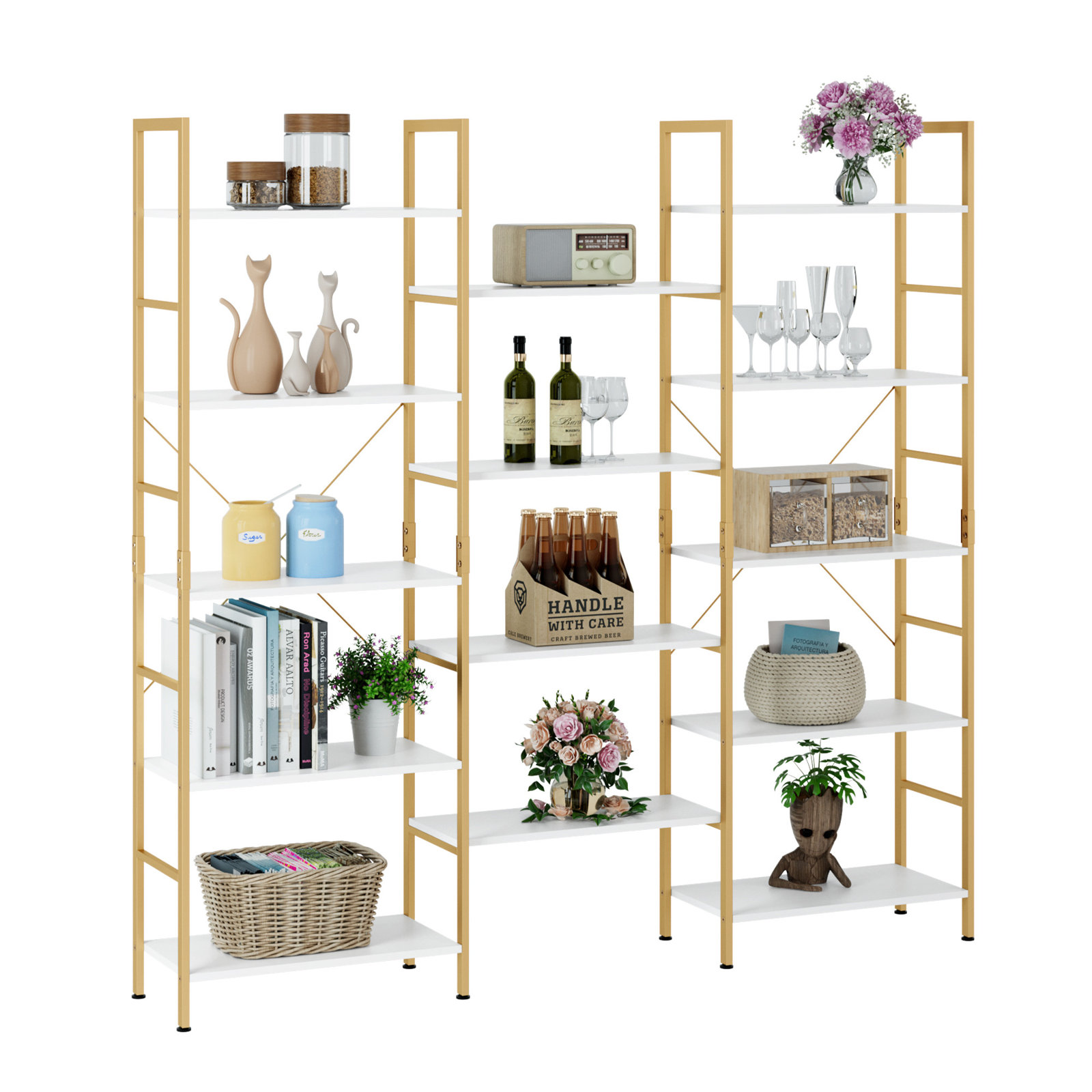 Homfa 5-Tier White Gold Bookshelf, Triple Wide Open Display Shelf, Large Storage Bookcase with Metal Frame