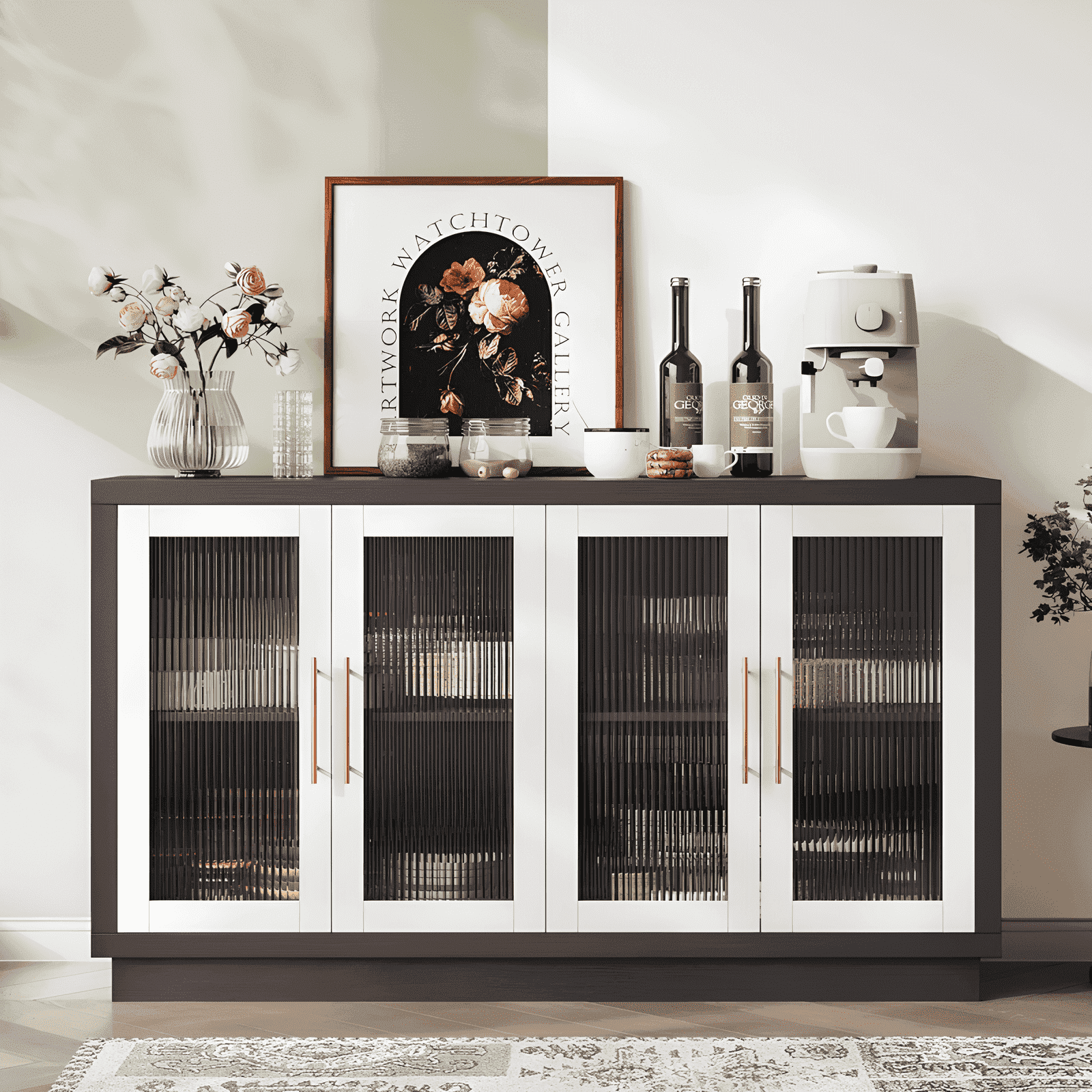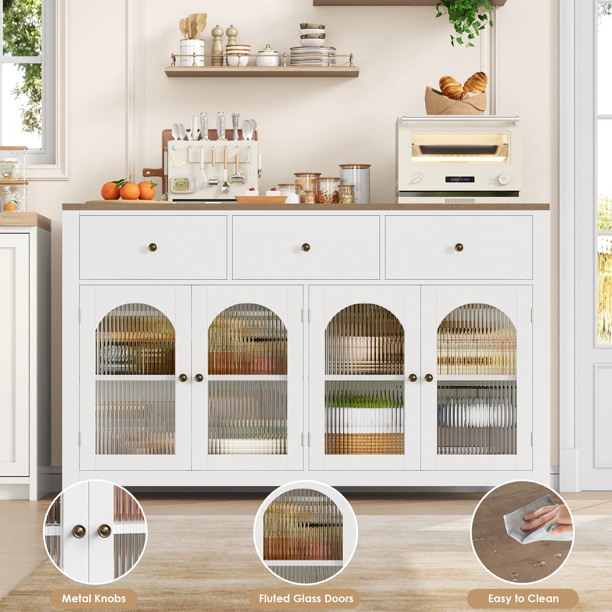 Features 【Modern Buffet Cabinet】With its simple and modern design, this buffet cabinet can adapt to any household style.The fluted glass doors, is more unique and elegant than the wood door, adding interior hazy beauty 【Large Sideboard with Ample Storage】With spacious size,55.1″Wx15.7″Dx34.3″H,this kitchen sideboard comes with a spacious tabletop,3 drawers and 4 glass doors cabinets,which can easily hold all your daily kitchen utensils and keep your kitchen and dining room clean and tidy. 【Sturdy & Durable】This kitchen buffet is made of the high-quality wood, sturdy and durable.The heightened base enhances the storage cabinet stability. Smooth metal slides make the drawers easier to open and closed. 【Adjustable Shelves】The shelves inside the 2 storage cabinets can be adjusted to 3 different heights ,allowing you to customize storage to suit your needs. 【Easy to Clean】With the high-quality wood, the sideboard is easy to clean for long term use and easy maintenance. 【More than Buffet Cabinet】This white cabinet is not only suitable as a buffet cabinet in your kitchen, but also suitable as a coffee bar cabinet in your dinning room, as a console table for your living room, as a storage cabinet or as a TV stand. 【Easy to Assemble】Including the detailed instructions and all needed parts, this kitchen cabinet is easy to assemble. 【24/7 Customer Service】We provide quality customer support, if you have any questions, please email us and we will reply within 24 hours. Specifications: Color: White Material: Engineered Wood Drawer Glide Material: Metal Drawer Handle Material: Metal Overall: 55.1″W x 15.7″D x 34.3″H Drawer Interior: 16.5”L x 13.4”W X 7.2”H Overall Weight: 119lbs Number of Drawers: 3 Number of Doors: 4 Adjustable Shelves:Yes Package Contents: 1 x Buffet Cabinet 1 x Assembly Kit 1 x Instructions