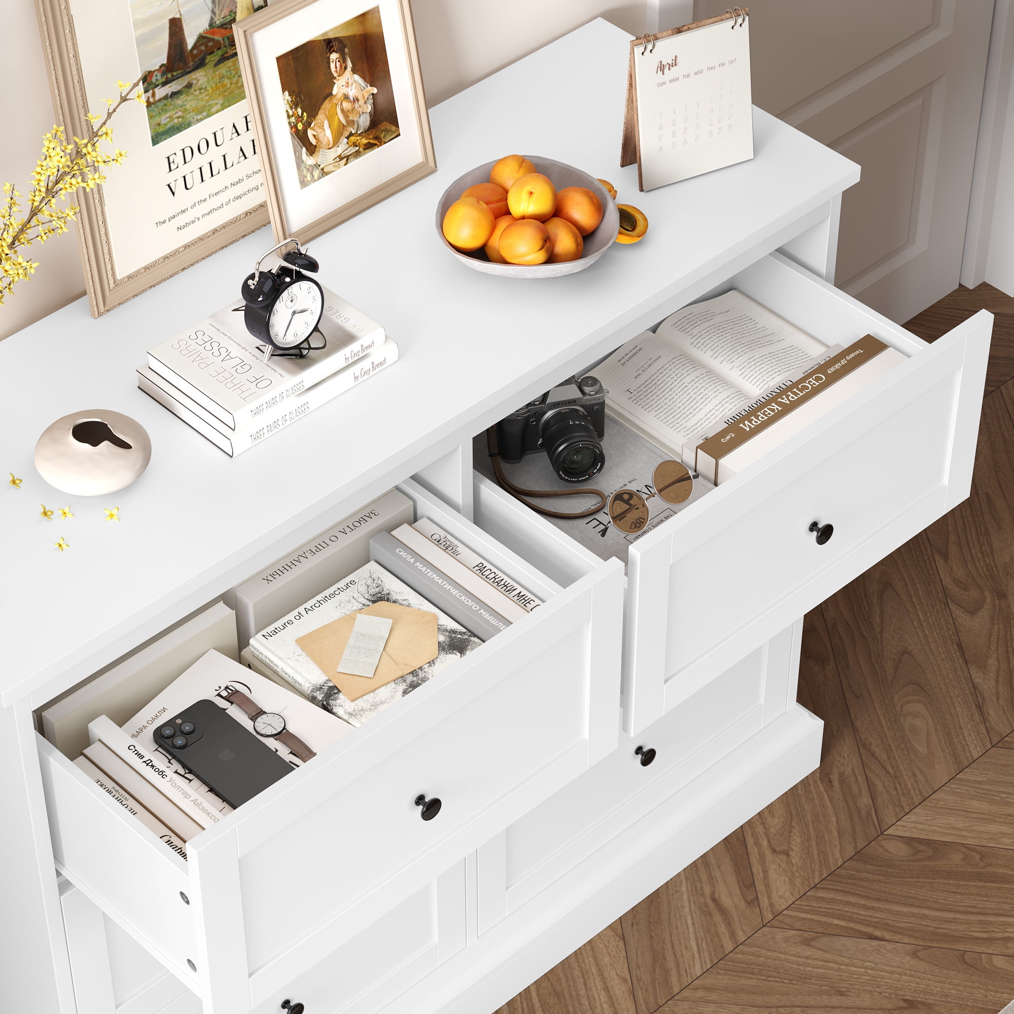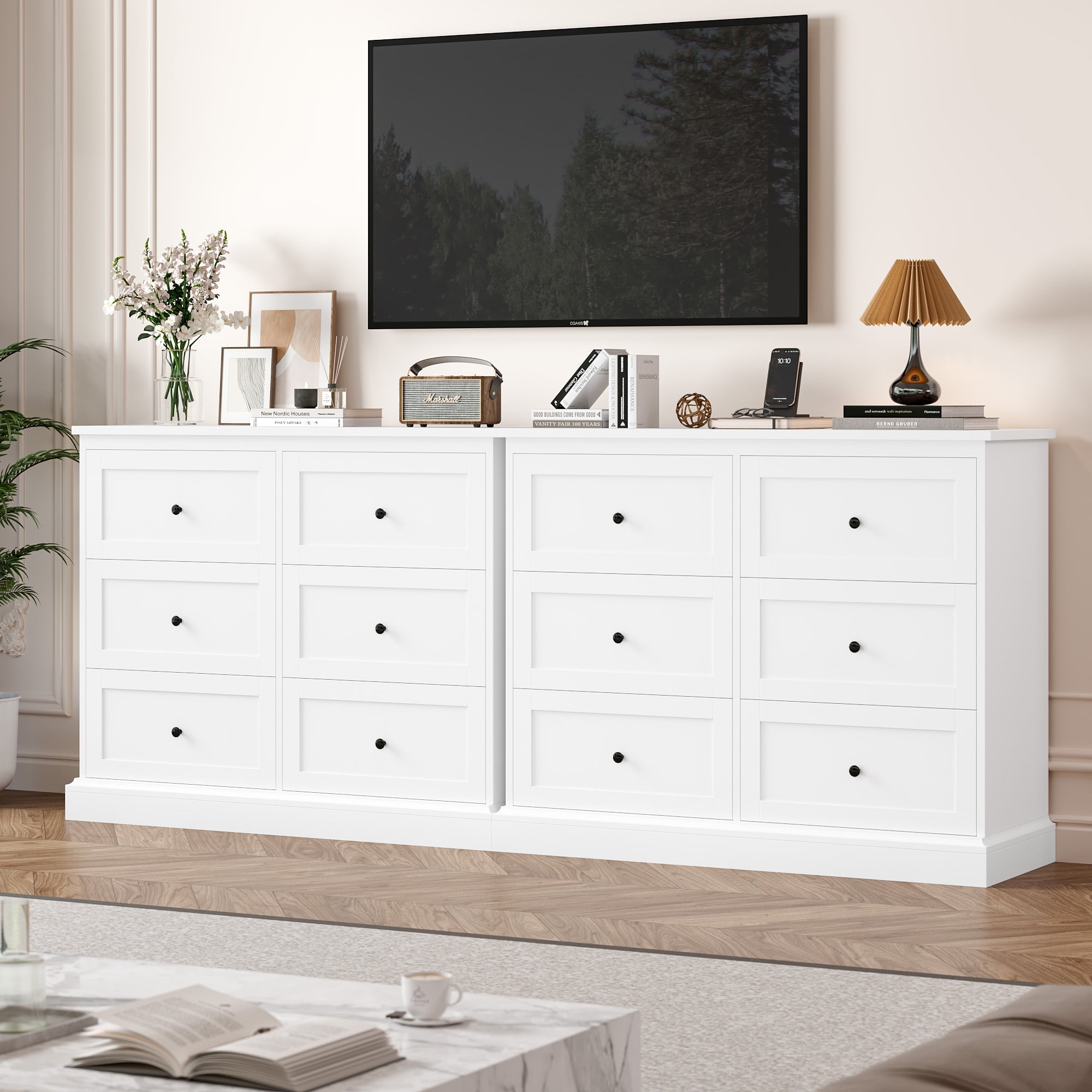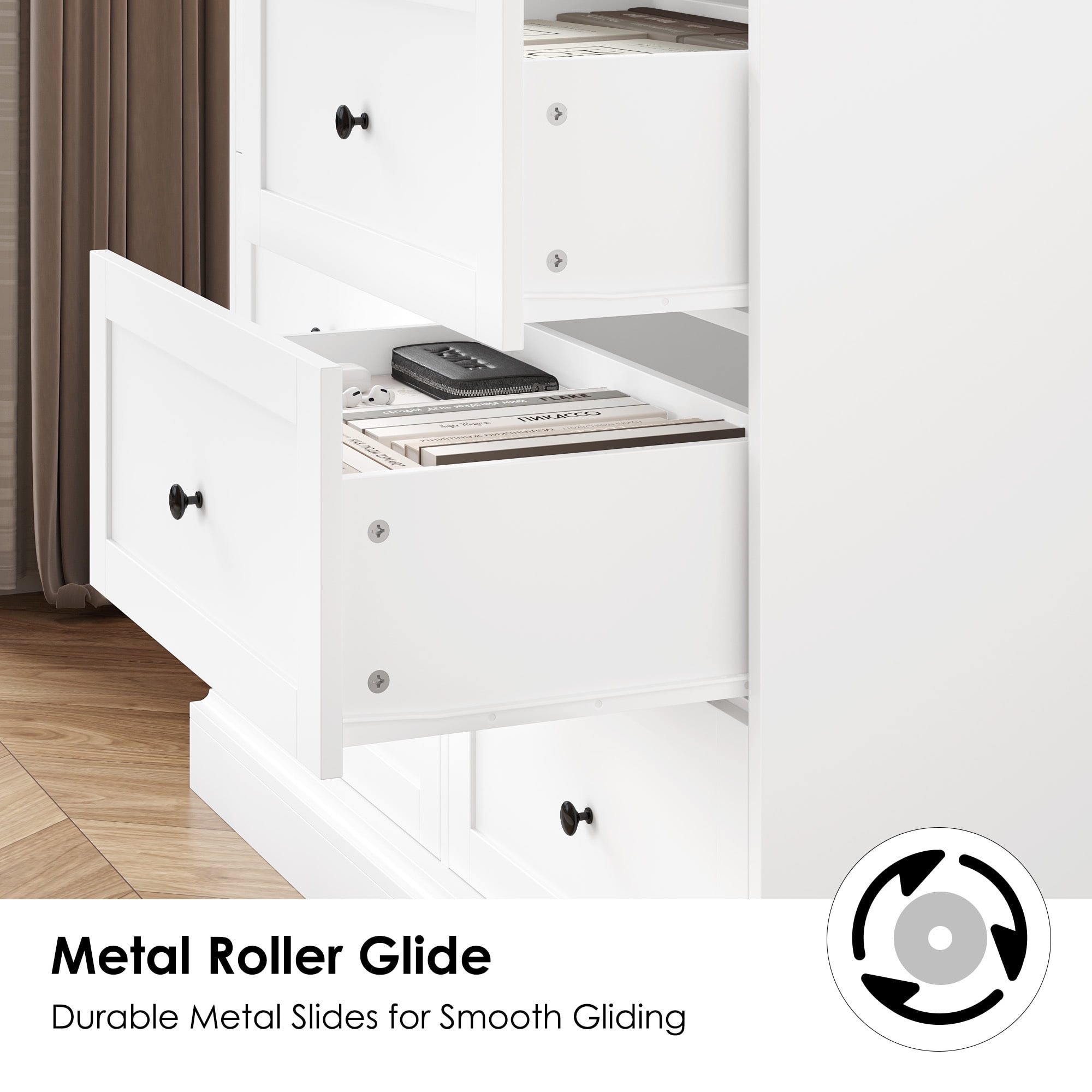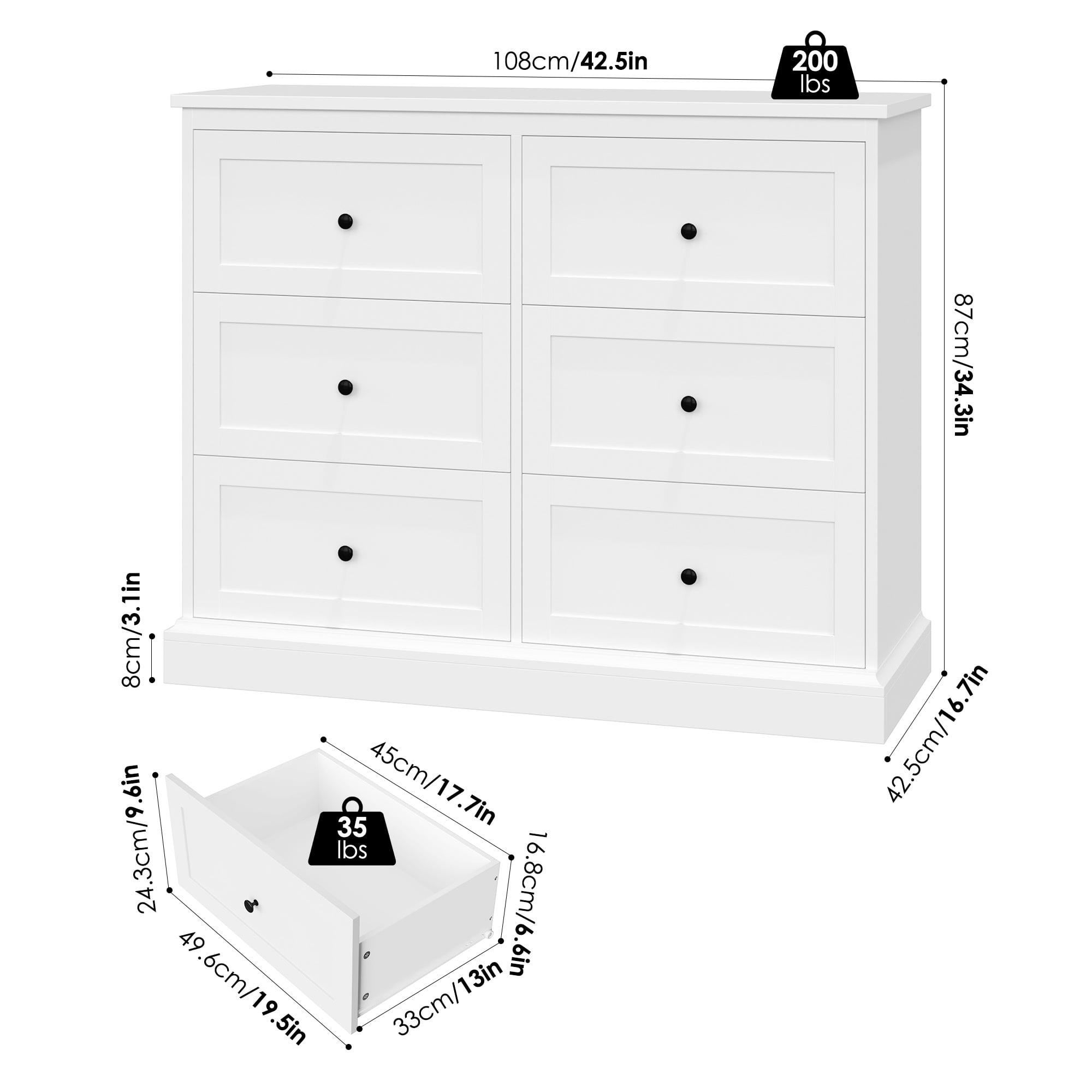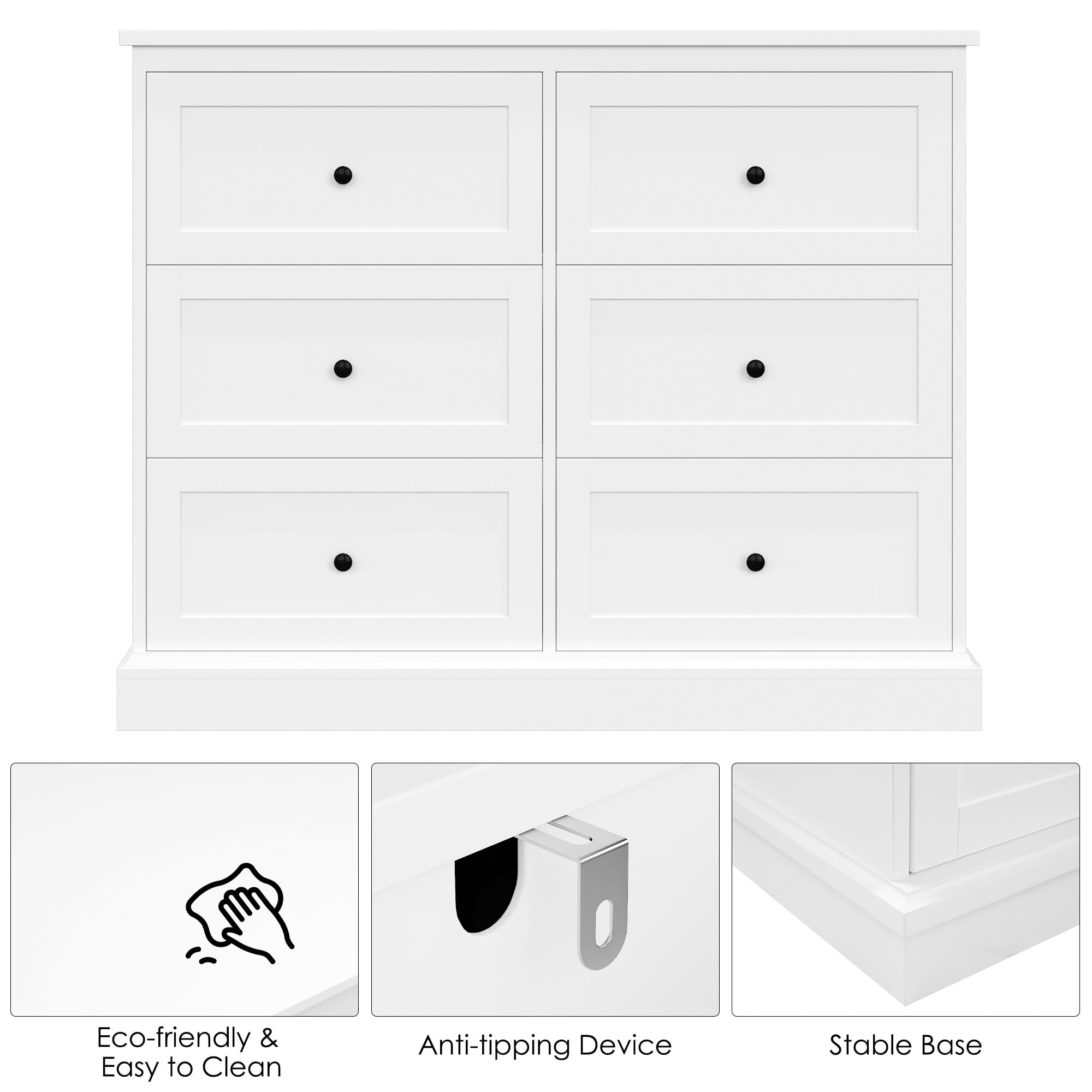 Features 【6 Deep and Wide Drawers】Drawer depth: 6.6 in. The white horizontal dresser has 6 spacious drawers to reduce clutter and keep the room tidy. 【Ideal for Smaller Spaces】Dimensions: 42.5*16.7*34.3 in. The small dresser is compact and does not take up much space, making it ideal for places with limited space. 【Durable and Easy to Clean】The 6-drawer double dresser is made of high-quality MDF and can be used for many years, and the dresser white has a smooth surface and is easy to clean. The thickened wood board and sturdy frame make this white dresser more stable. 【Modern White Style】With a pure white appearance and black handles, this white 6-drawer dresser is both functional and decorative, suitable for bedrooms, living rooms, foyers, hallways, and anywhere else. 【Easy to Assemble & 24/7 Customer Service】The white bedroom furniture comes with the help of all mounting hardware and detailed instructions; 1 adult can complete it easily in 40 minutes. 24/7 quality customer service so you don’t have to worry about lost and damaged parts. Specifications Material: MDF Color: White Number of Drawers: 6 Overall Size: 42.5″L x 16.7″W x 34.3″H Drawer Interior Size: 17.7″L x 13″W x 6.6″H Drawer Weight Capacity: 44 lbs Overall Product Weight: 113.54 lbs Package Contents 1 x 6 Drawer White Dresser 1 x Assembly Kit 1 x Instructions Note: This white horizontal dresser is an upgraded version with a wider and thicker base, providing extra stability and security.