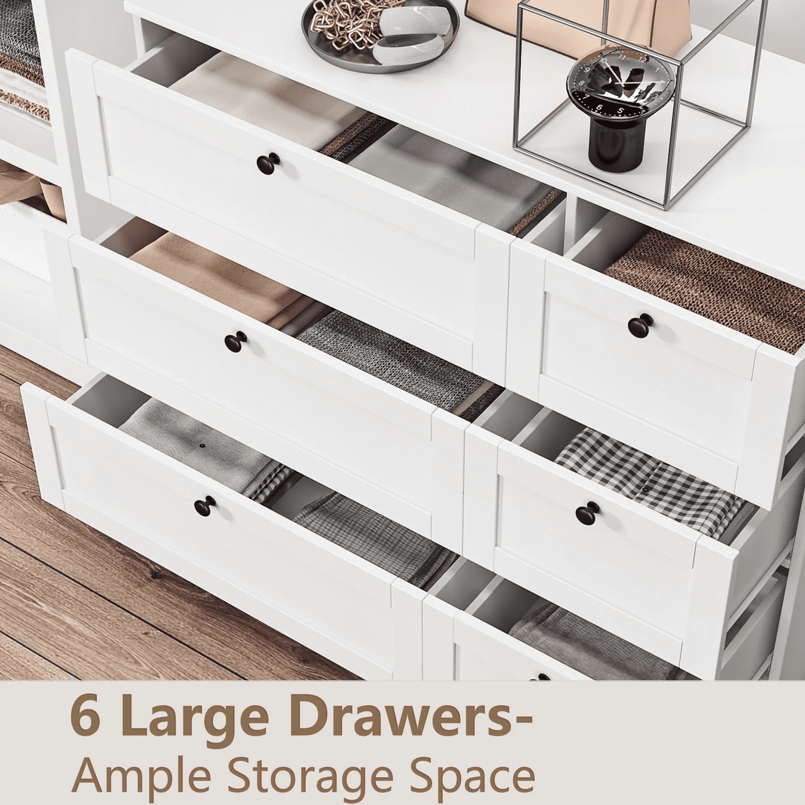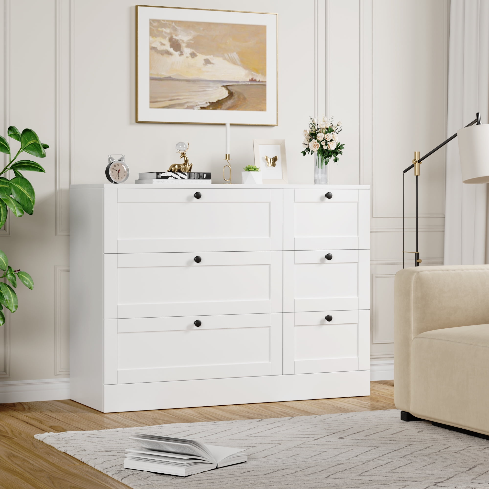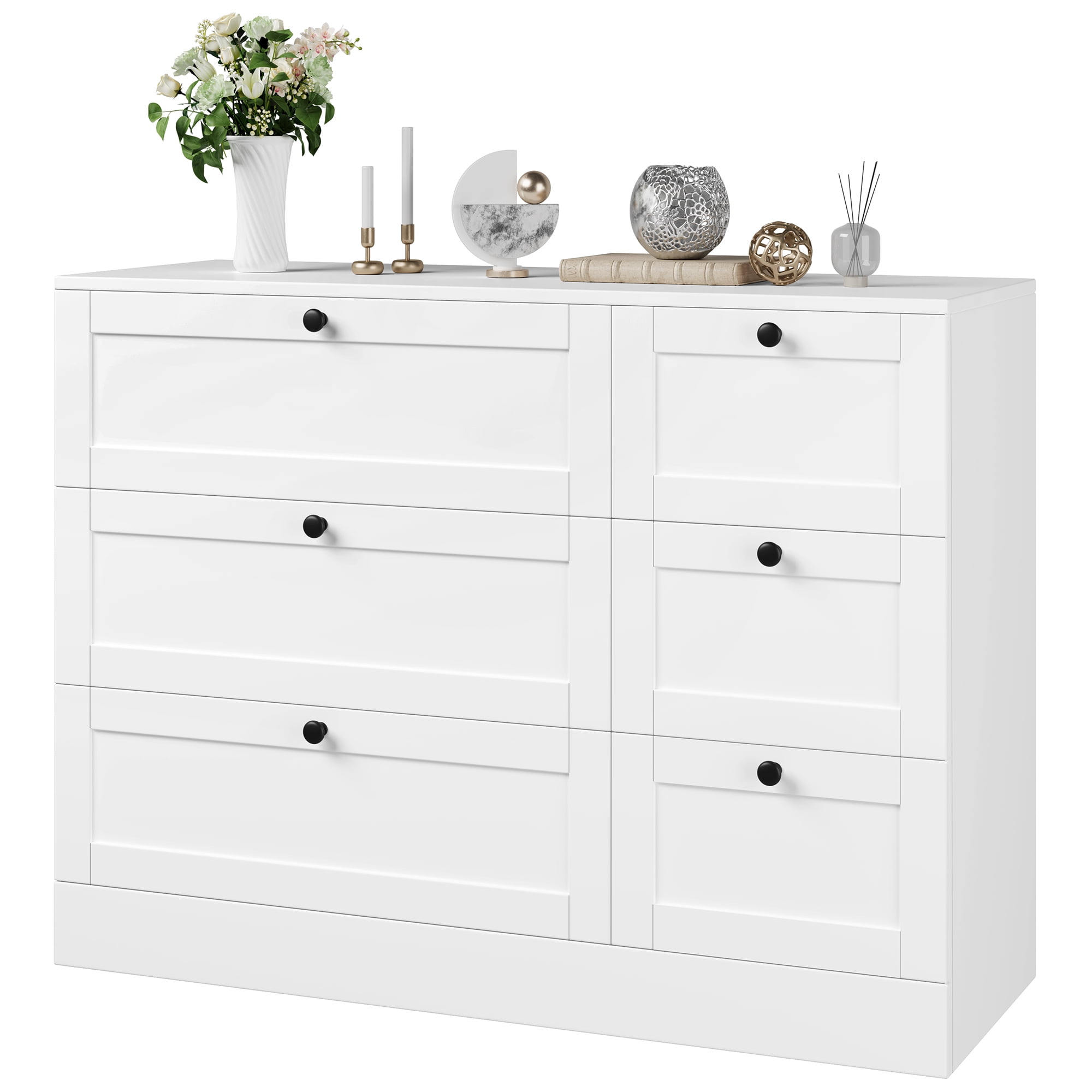 Homfa – Create a comfortable life! Our 6-drawer dresser blends functionality with simplicity, the black circular knobs add that touch of whimsy and will look ultra-chic no matter your bedroom decor style. The white dresser keep your clothes and garments organized in style. 6 drawers in 2 sizes for easy sorting of your clothes, favorite jewelry and accessories, and you can add your favorite mirror or decorations to the spacious dresser top (42.5”x15.7”) to make for a stylish bedroom dresser. Such a practical double dresser yet minimalist! It works perfectly as a storage cabinet for living room. Explore more Homfa items