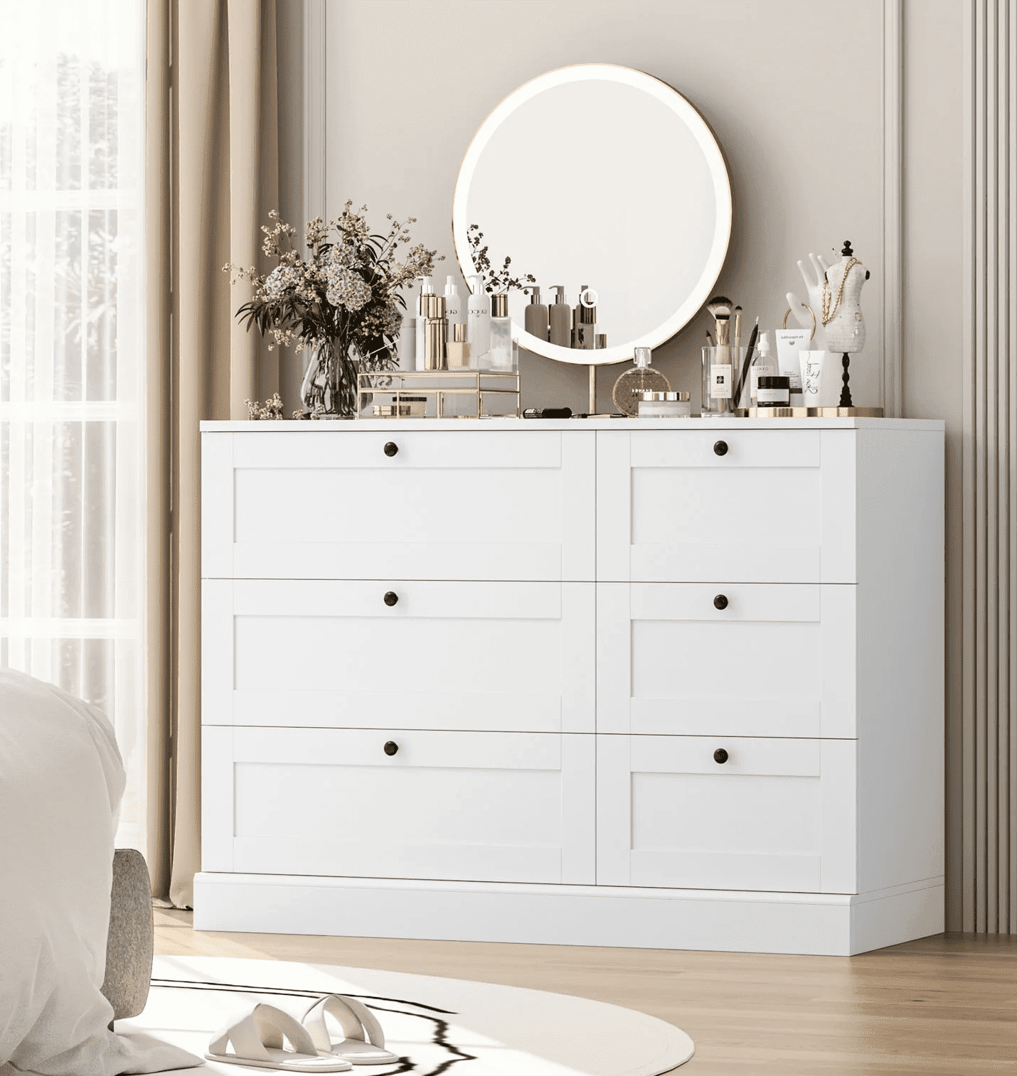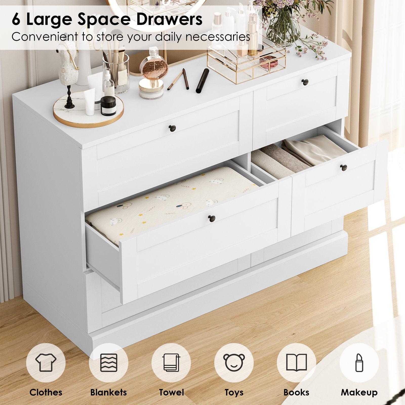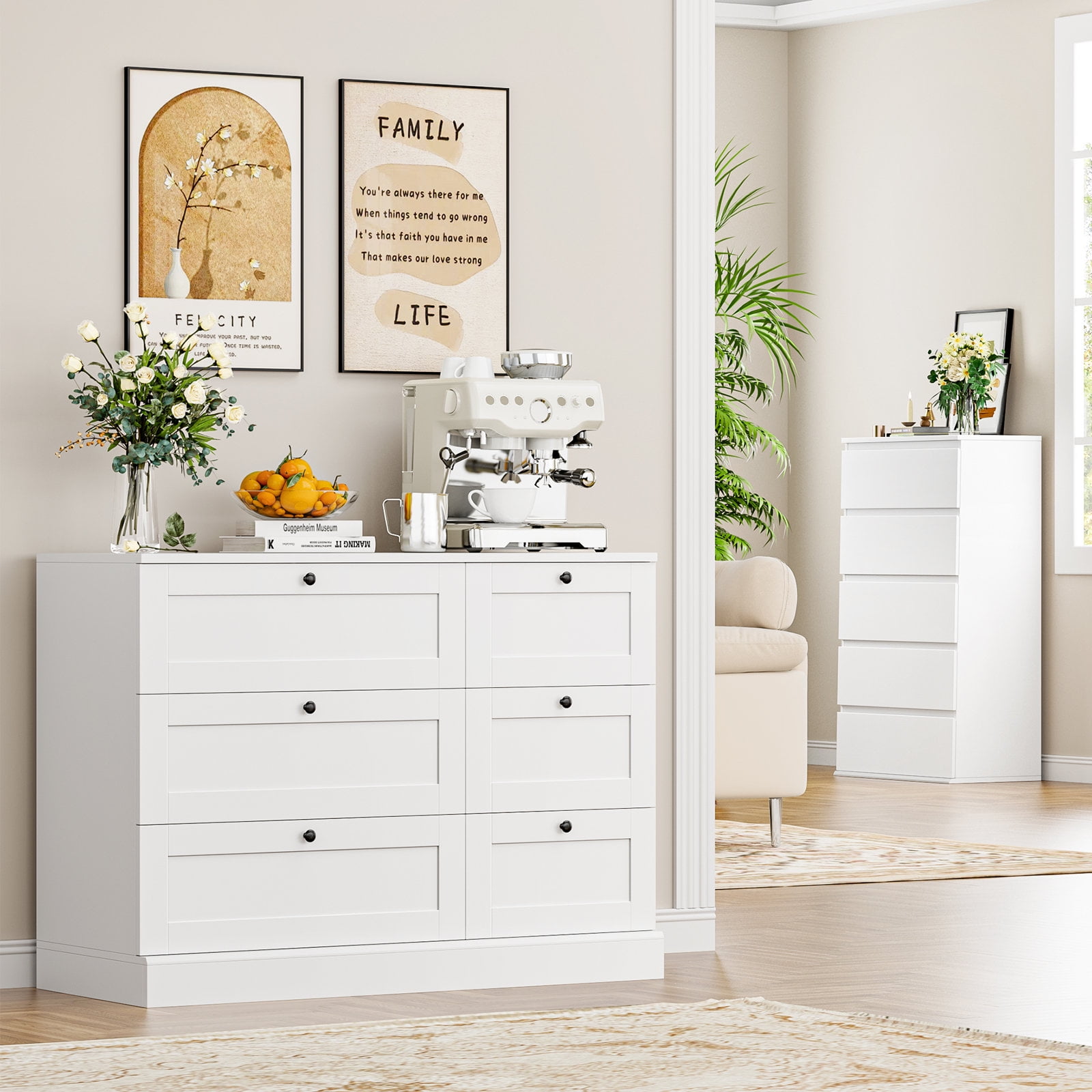 Homfa – Create a comfortable life! Our 6-drawer dresser blends functionality with simplicity, the black circular knobs add that touch of whimsy and will look ultra-chic no matter your bedroom decor style. The white dresser keep your clothes and garments organized in style. 6 drawers in 2 sizes for easy sorting of your clothes, favorite jewelry and accessories, and you can add your favorite mirror or decorations to the spacious dresser top (42.5”x15.7”) to make for a stylish bedroom dresser. Such a practical double dresser yet minimalist! It works perfectly as a storage cabinet for living room. Explore more Homfa items