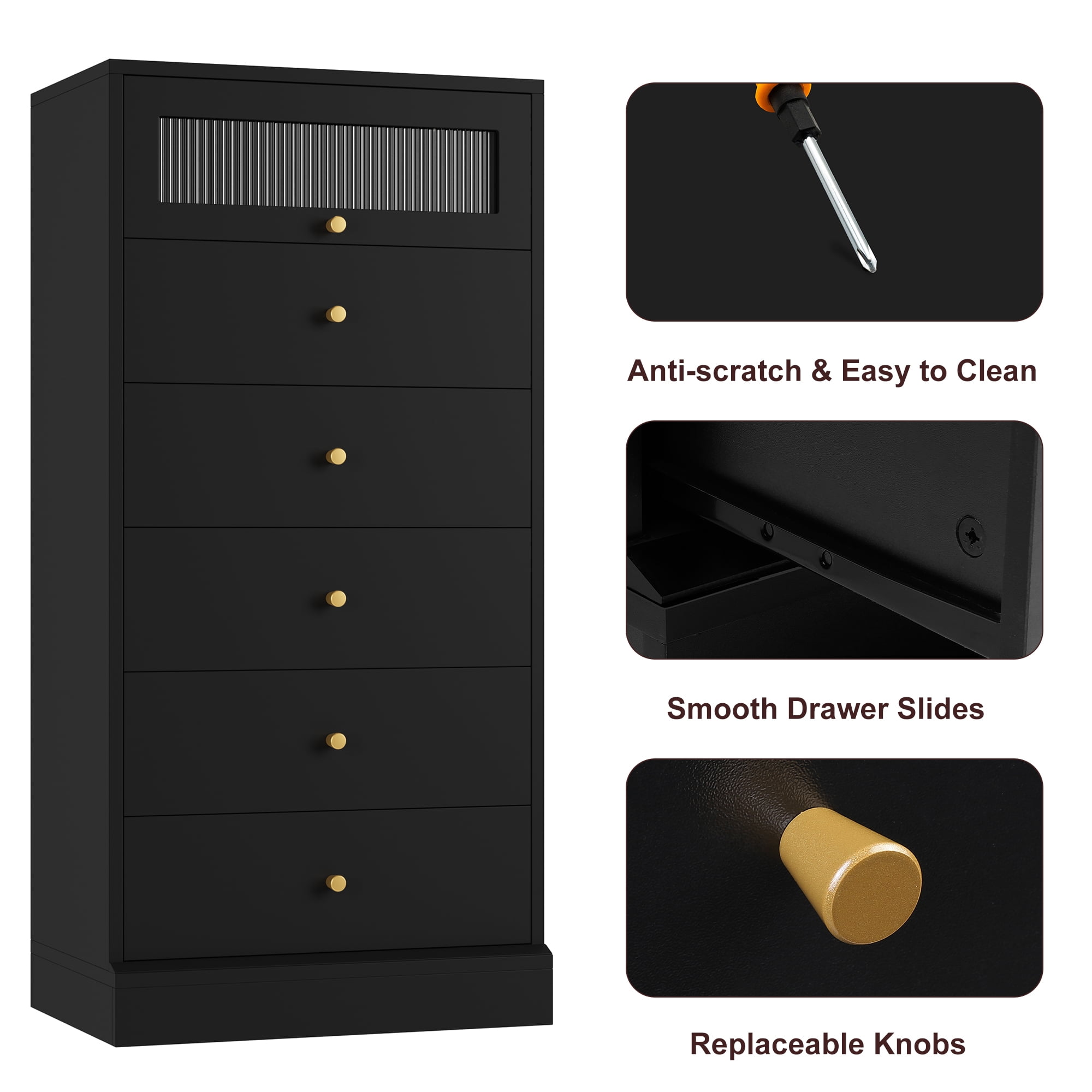 【Flip Up Glass Door】The small dresser’s flip-up opening and closing design can be almost completely vertically stored in the cabinet after flipping up 90°, which can save nearly 20% of the space, and is more suitable for rooms with small spaces. 【6 Drawer Bedroom Dresser】This 6 drawers black gold dresser offers you plenty of storage space for anywhere in your bedroom, living room, hallway. 【Modern Style】The modern style is suitable for you who want to live a refined life. The black surface and clear lines can be matched with many different decoration styles. Accented with sleek golden handles for a trend-forward finishing touch. 【Sturdy and Stable】This solid wood chest of drawers is constructed of high quality wood and a stable base construction for longevity and to withstand greater weight. 【Anti-toppling Device】The tall dresser is equipped with an anti-tipping device to protect your family. 【Easy to Assemble & 24/7 Customer Service】The wooden storage cabinet comes with the help of all mounting hardware and detailed instructions, 1 people can complete it easily in 30 mins. 24/7 quality customer service so you don’t have to worry about lost and damaged parts. Color: Black Material: Manufactured Wood, Glass Overall Size: 51.4” H x 23.6” W x 16.5” D Drawer Size: 7.3” H x 22.1” W x 12.6” D Overall Product Weight: 105.6 lbs Number of Drawers: 6 Number of Glass Doors: 1 1 x 6 Drawer Dresser 1 x Assembly Kit 1 x Instructions Note: This black gold vertical dresser is an upgraded version with a thickened and widened base, providing extra stability and security.
