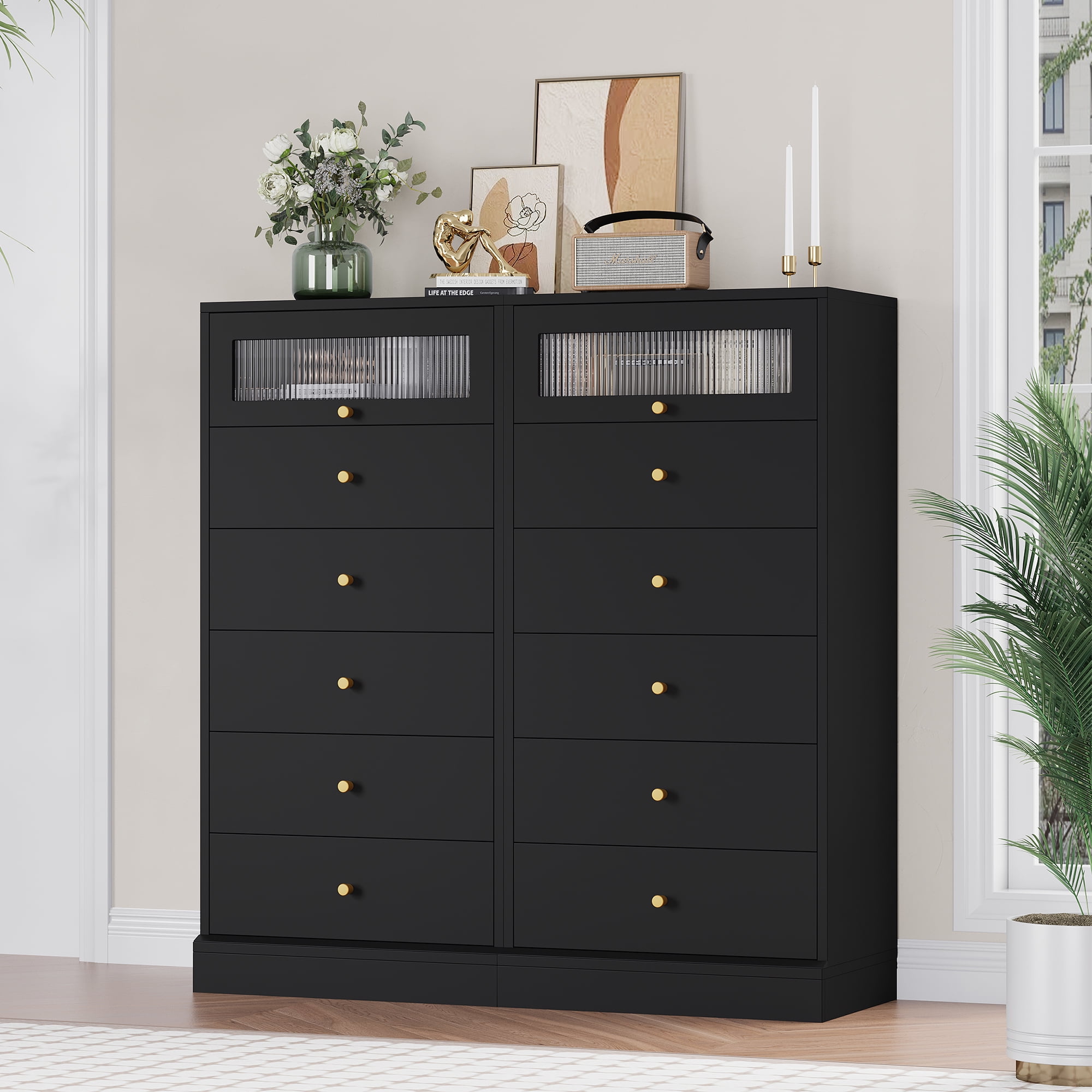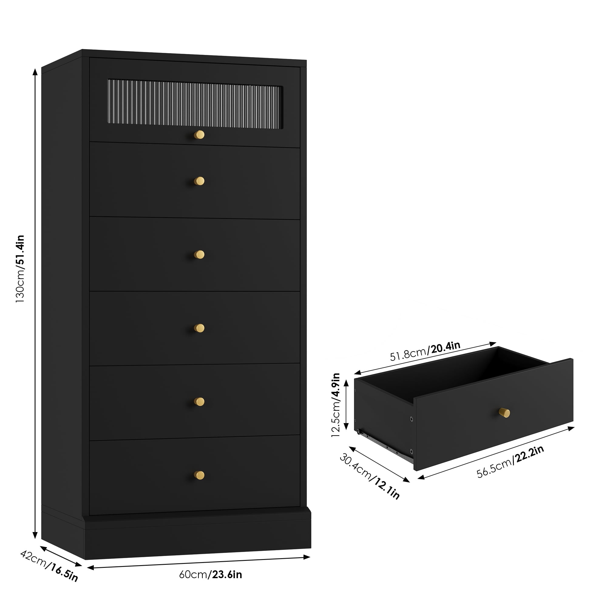Homfa 6 Drawer Dresser, 51.4″ Tall Chest of Drawers with Glass Doors, Wood Storage Cabinet for Bedroom Living Room, Black