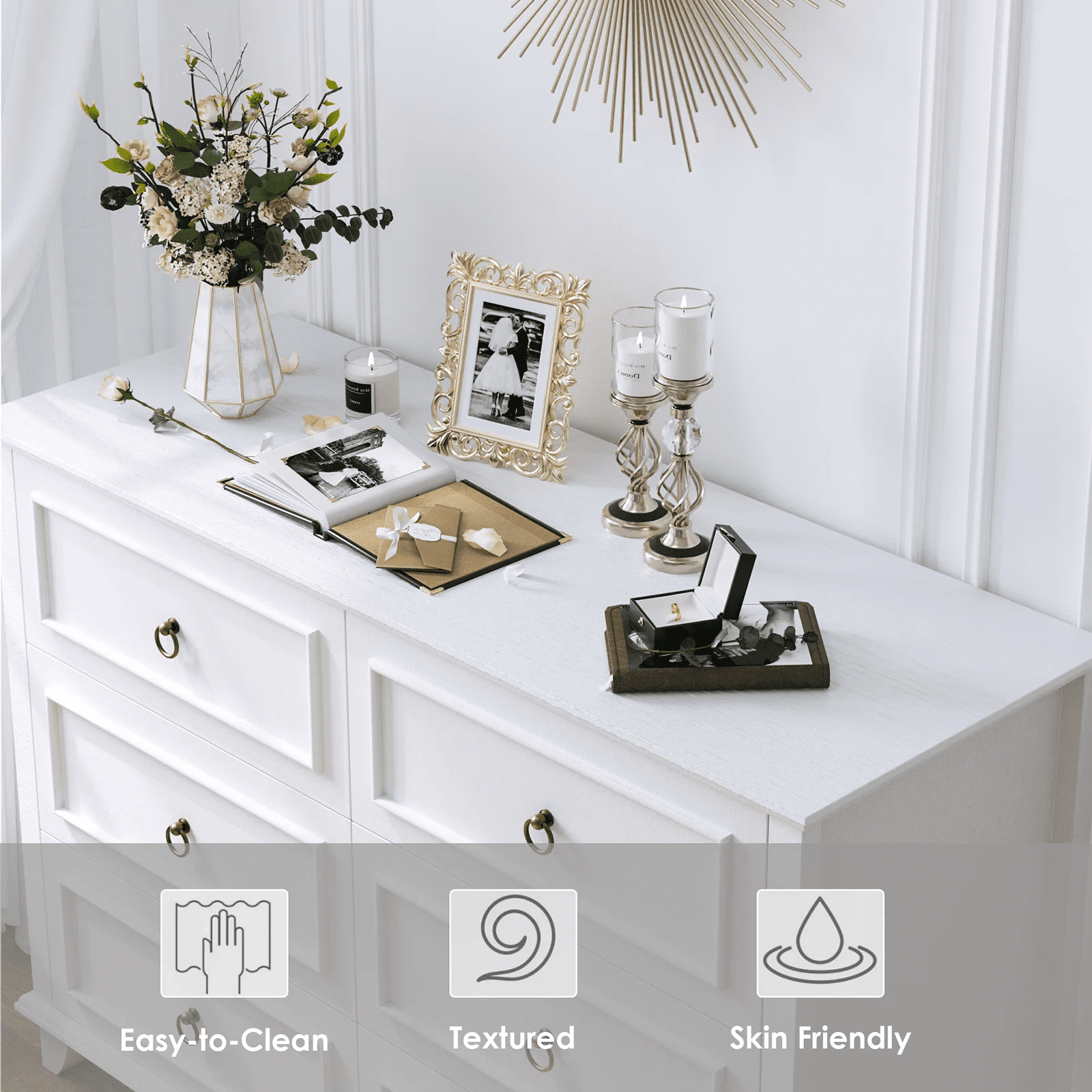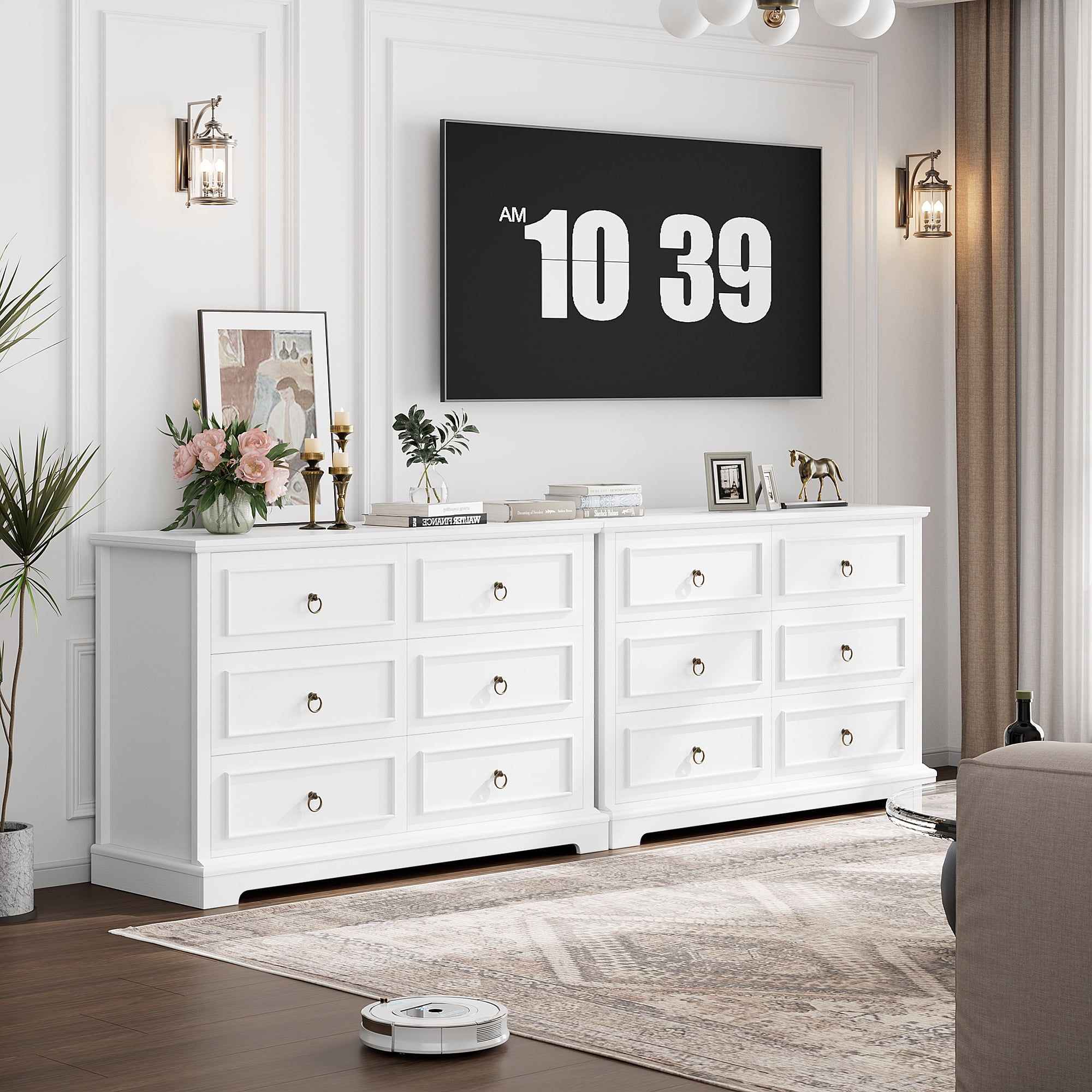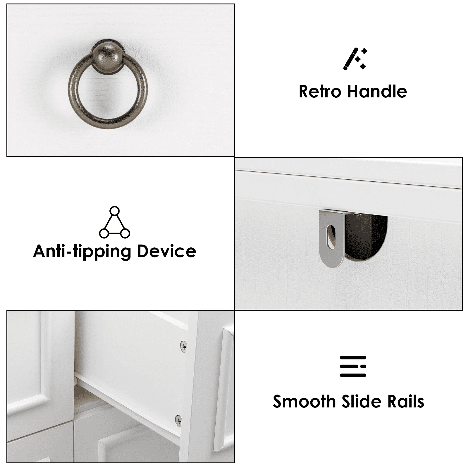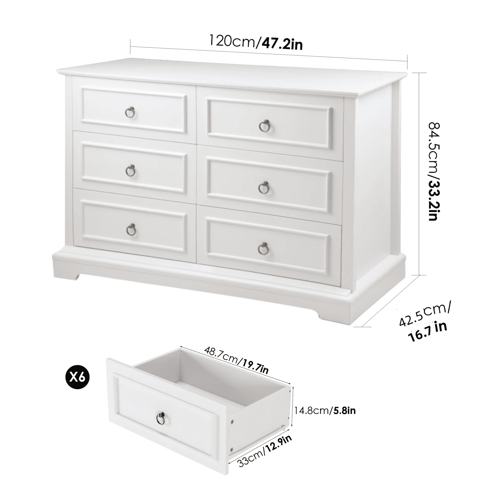 Features 【Modern Wooden Dresser】 The sturdy, streamlined exterior with antique brass ring pulls and the unique natural wood grain finish give this white dresser a vintage and modern look and style that’ll match nearly any bedroom. 【6 Drawers horizontal Dresser】 This dresser features 6 spacious drawers (19.7”x12.9”x5.8”) to store things with more classification, such as cosmetics and clothes, to meet different needs. This bedroom storage drawers free up your space but look great. Beside this white dresser with a 47.2” wide top that holds up to 300 pounds, you can put a lamp or an aroma diffuser on it for an extra homey touch. 【High-Quality Dresser】 This 6 drawers dresser has high-quality smooth drawer slides; the drawers can be easily opened and closed, extending the life of the dresser, and the slides are quiet when running, providing a quiet use environment. Besides, this white dresser with drawers is crafted from premium solid and engineered wood, with meticulous craftsmanship, quality, and durability. Overall dimensions: 15.6″D x 47.2″W x 33.3″H 【Versatile Storage Cabinet】This storage cabinet can not only be used as a dresser in the bedroom, but also as a clothes drawer chest, a console table at the entrance, a storage cabinet in the living room, and a sideboard in the dining room. 【Easy to Assemble】All accessories are numbered and can be easily assembled into this 6 drawers horizontal dresser for bedroom by 2 people in less than 1 hour. 【24/7 Customer Service】 We provide quality customer support; if you have any questions, please email us, and we will reply within 24 hours. Specifications Color: White Material: Engineered Wood, Metal Product Dimensions: 47.2 L x 16.7 W x 33.2 H in Interior Drawer Size: 19.7*12.9*5.8 in Item Weight: 112.87 lb Top Weight Capacity: 77 lbs Drawer Capacity:25 lbs Number of Drawers: 6 Assembly Required: Yes Package Contents 1 x 6-Drawer Dresser 1 x Assembly Kit 1 x Instruction