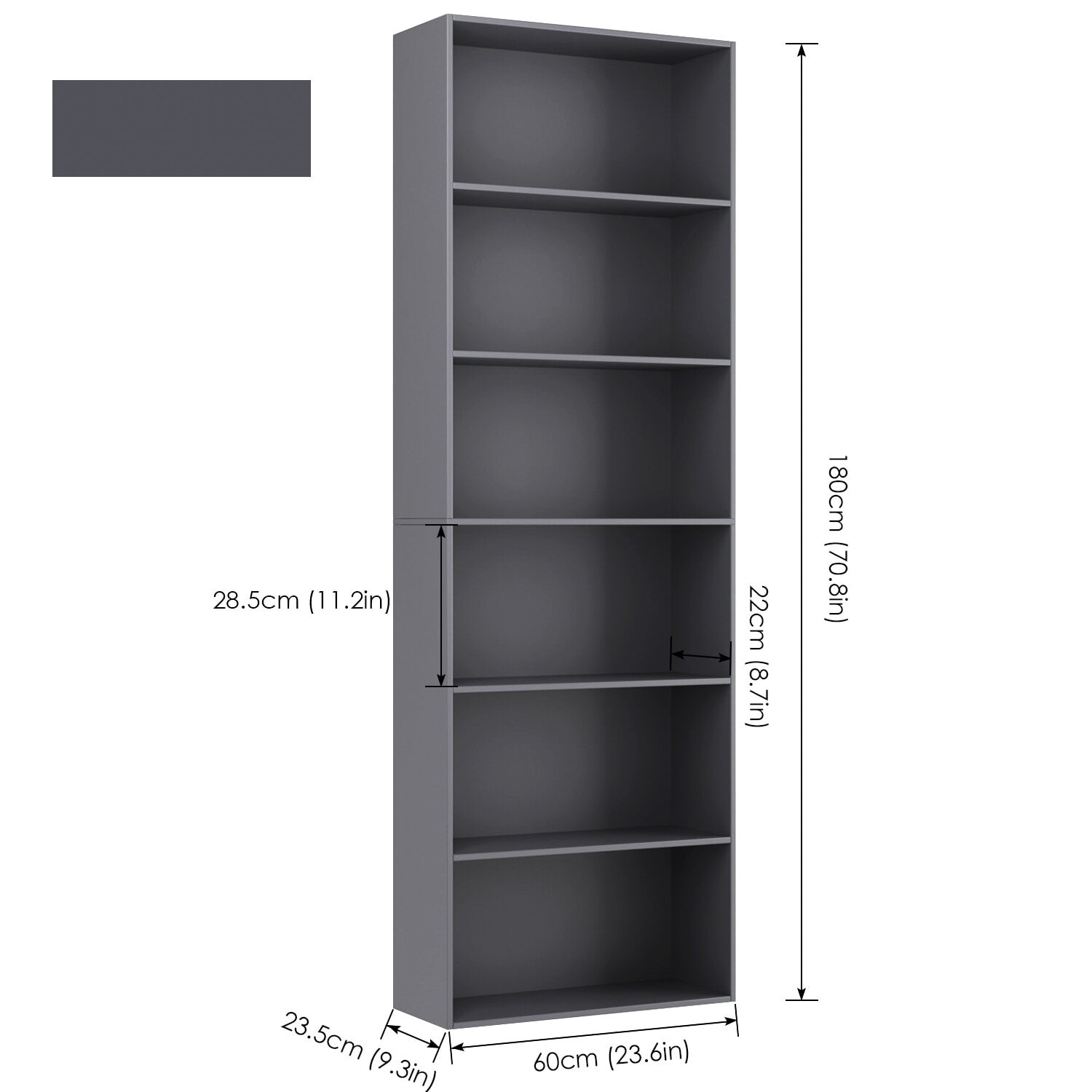 Features: 【Modern gray appearance】This beautiful gray bookcase can be used in every corner, being an eye-catcher in your room, It can be matched to any room style. 【Various occasions】As storage shelves, such a standard bookcase is ideal for placing in the living room, bedroom room, or office. 【Sturdy and durable】We Adopt quality E1 grade protection building materials, solidly constructed. The freestanding bookshelves features 2 anti-rollover devices that keep it’s stability, superior material and elaborate workmanship delay this wooden bookshelf’s service life. 【Space-saving】70.8 inch high bookshelves makes full use of space, the 6 open compartments are optimally to place your stuffs, convenient to fetch the items you want. 【Easy to assemble】Gray bookshelf comes with labeled parts and illustrated instructions, easy to assemble in 1 hour by 2 people, equipped with caps to hide the screws. 【Customer service】If the product is missing accessories, or has any other problems, please email us and we will reply within 24 hours! Specifications: Color: Gray Material: Manufactured Wood Overall Size: 70.8” H x 23.6” W x 9.3” D Overall Product Weight: 41 lb. Shelf Weight Capacity: 20lbs Package Contents: 1 x Free Standing Bookcase 1 x Accessory Kit 1x Instruction